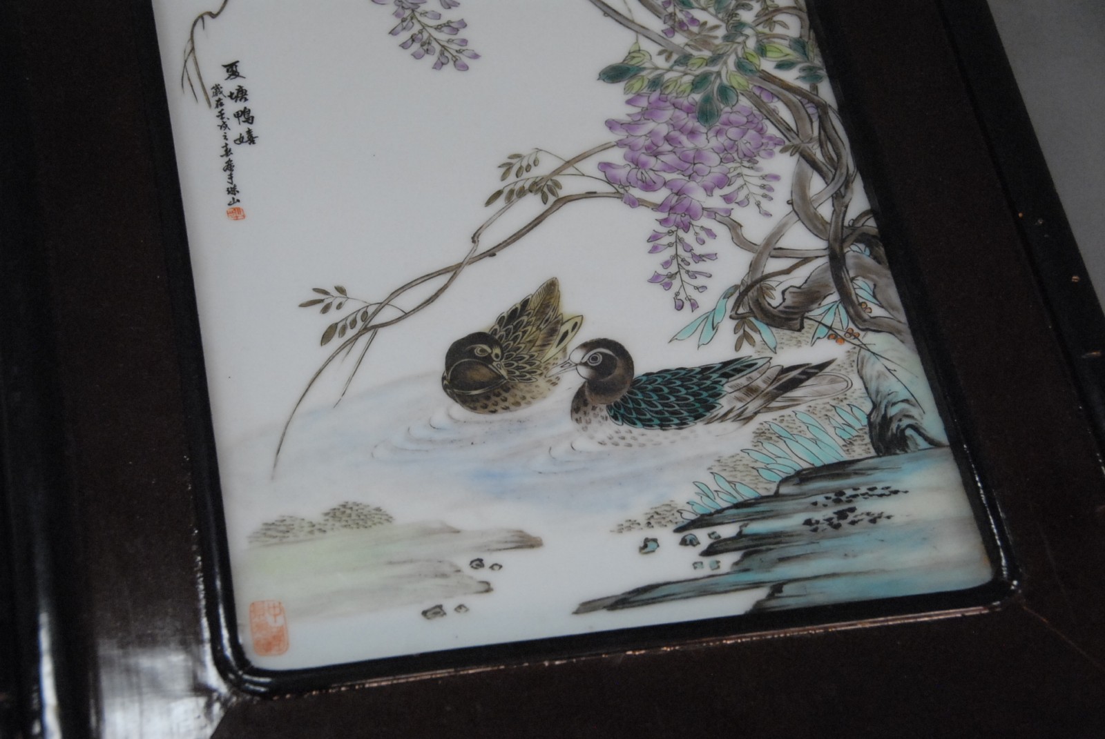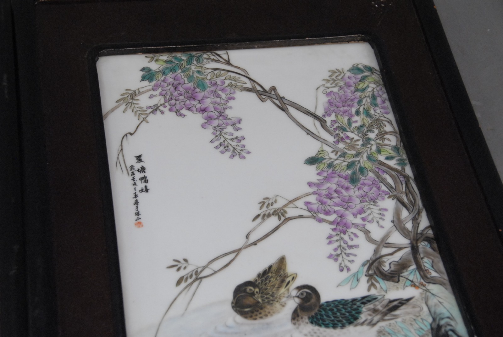Set of two Famille Rose enameled porcelain and wood wall plaques with flowers and birds design, Republic Period.