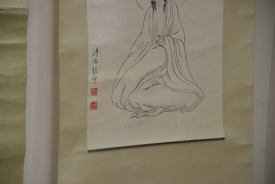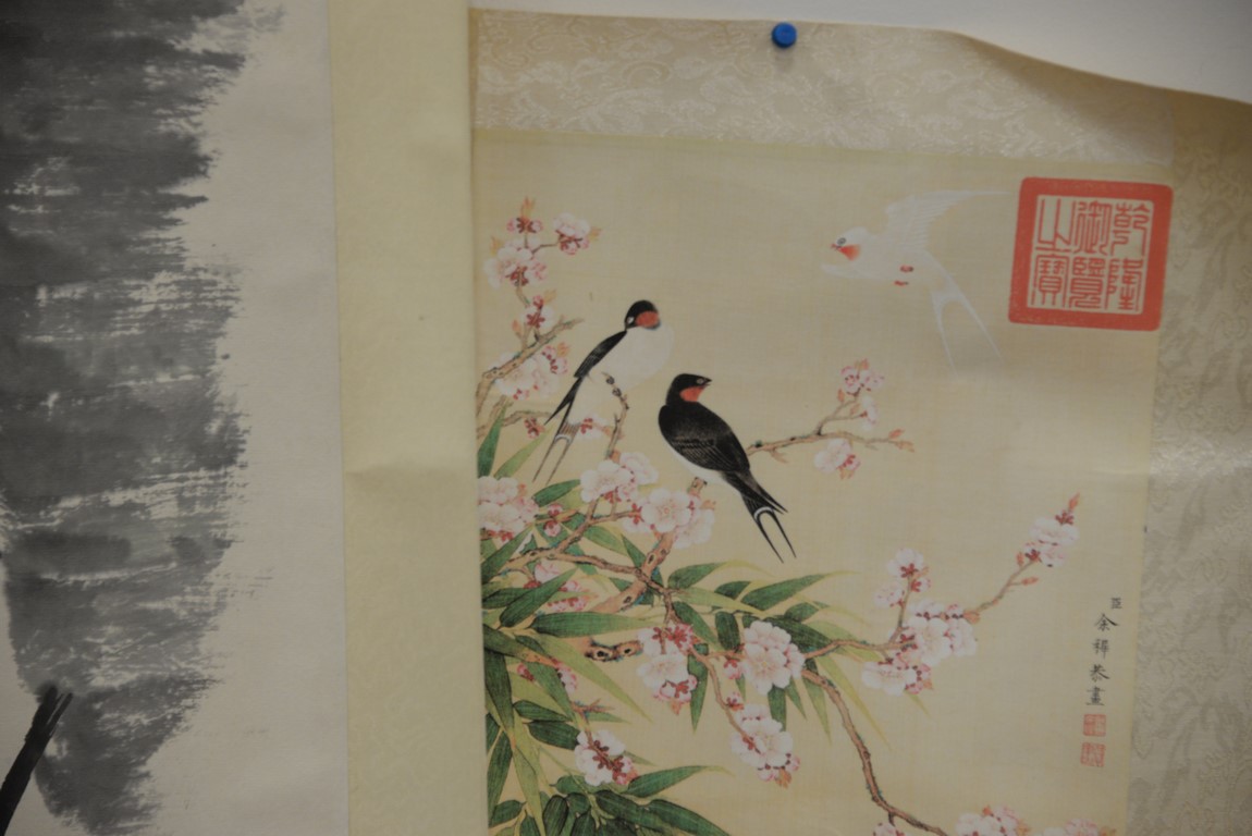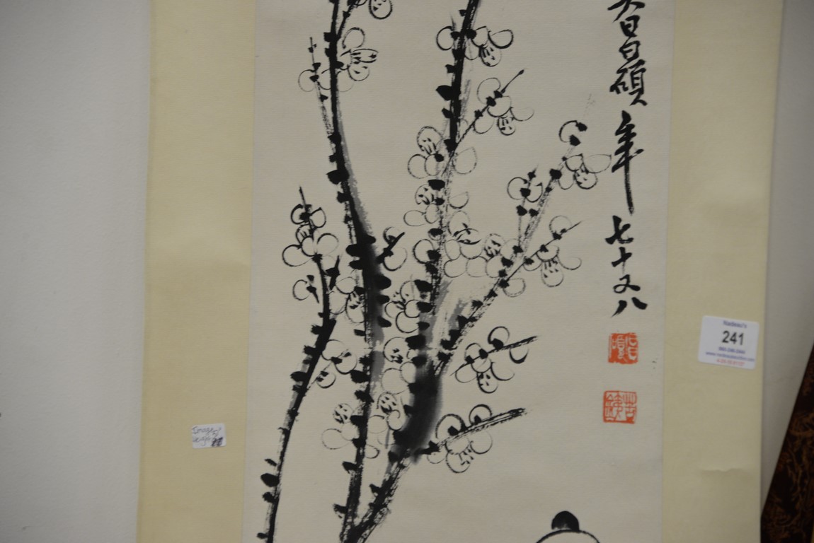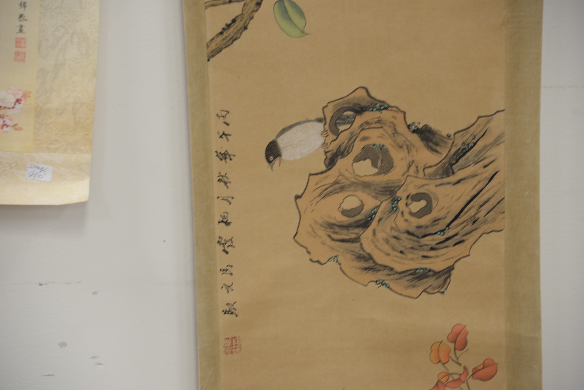 Lot 241: Seven Oriental paintings including two Guanyin scrolls, two blossoming flower trees, two small paintings, and a painted fan. 12 x 1…