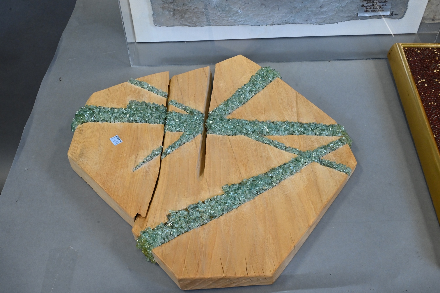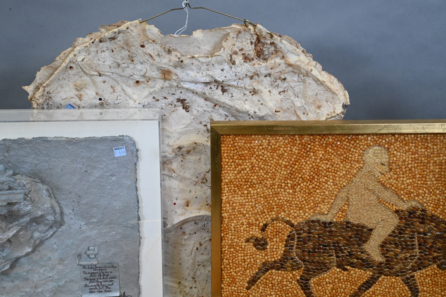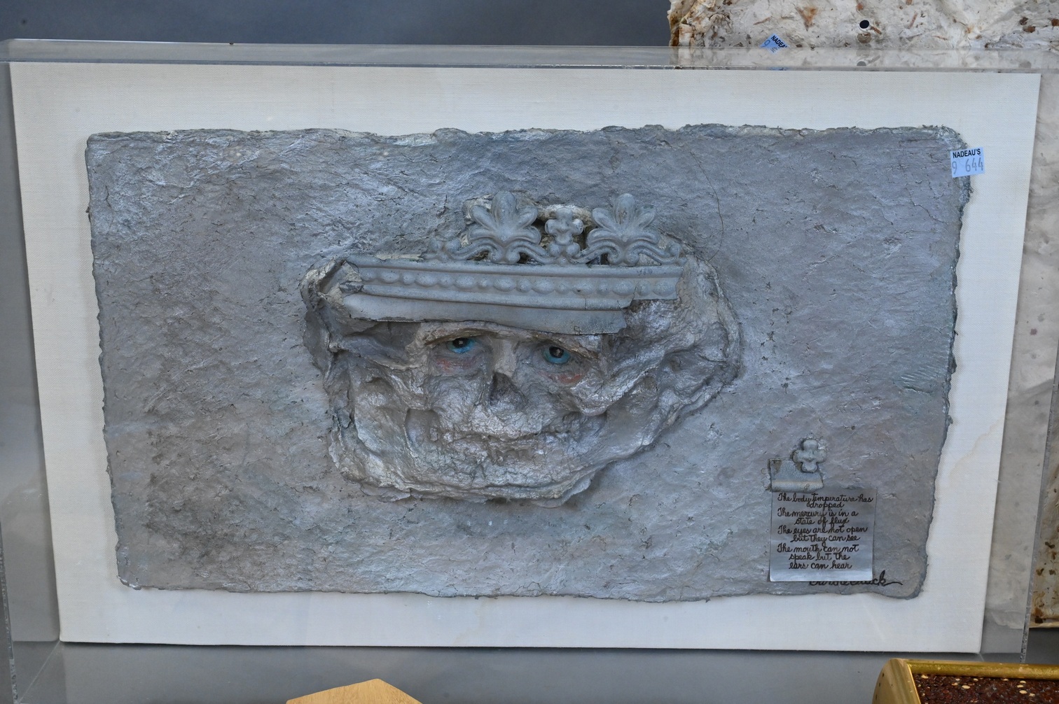 to include metal sculpture of a woman’s face, handmade paper T-shirt on hanger, shadowbox skull face with plaque, wood and glass