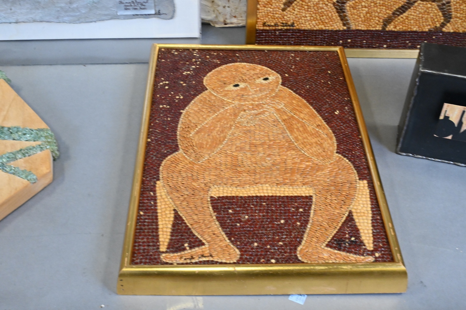 sculpture, two corn and seed mosaics of man and bull and seated man, metal sculpture with a city silhouette, each signed