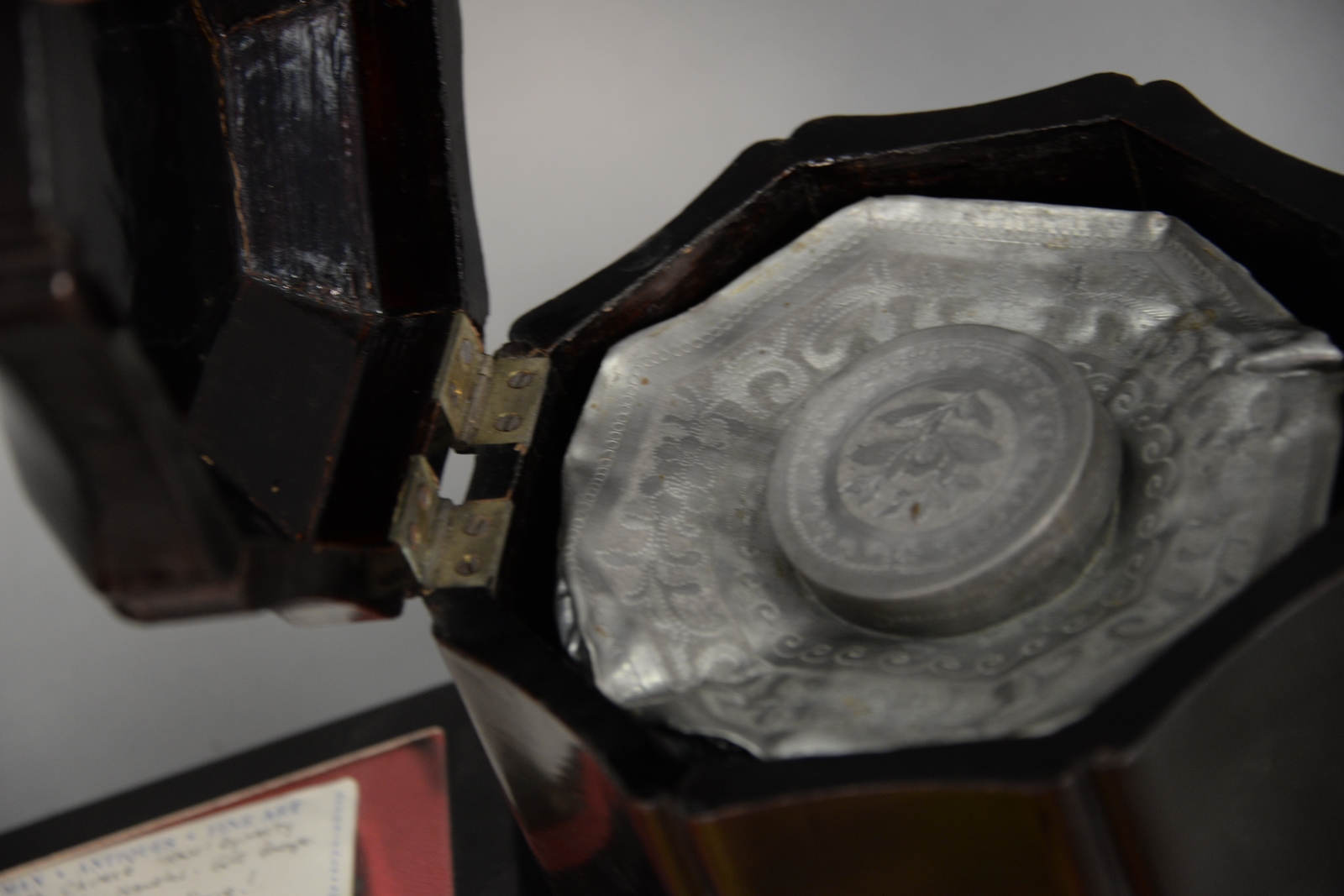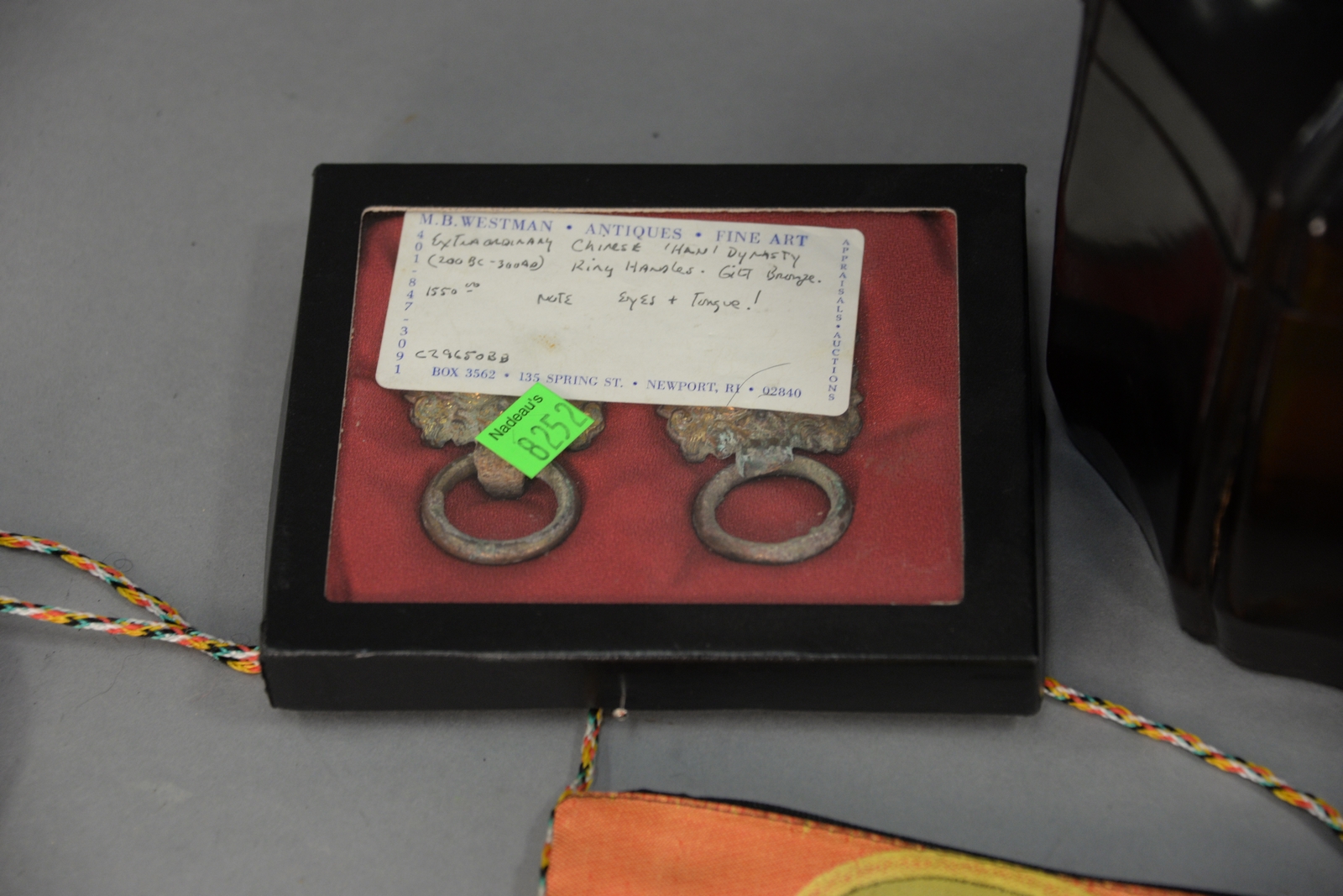 Six piece lot to include three miniature Mid-Eastern paintings and a pair of lion face gilt decorated pulls, and Asian lacquered tea box with lead liner ht. 6 1/2in.