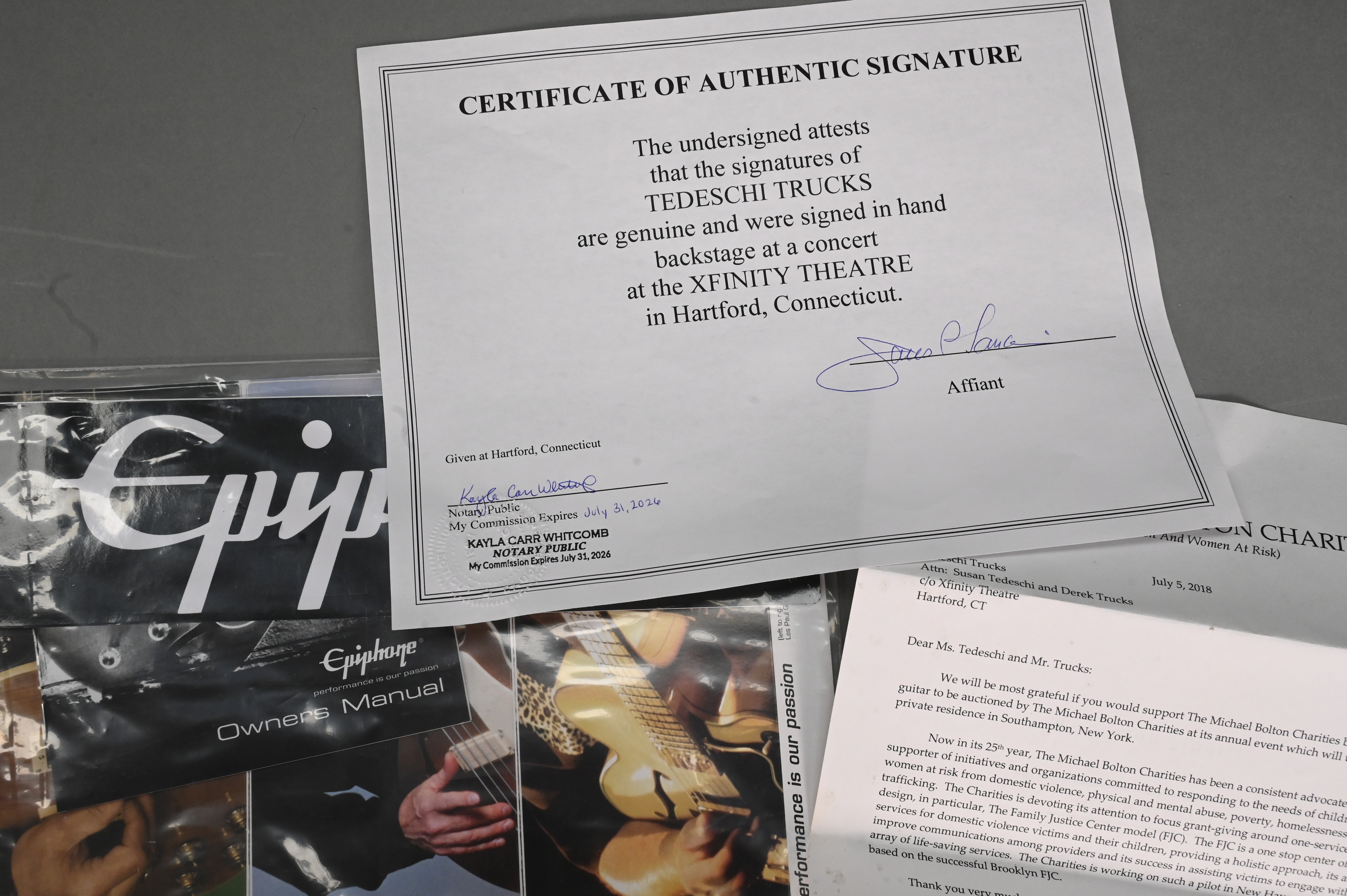 Tedeschi Trucks Autographed Epiphone DL-100GB Guitar, along with certificate of authenticity and factory box, serial #17041351031, length 42 inches; along with a Michael Bolton commemorative plaque.