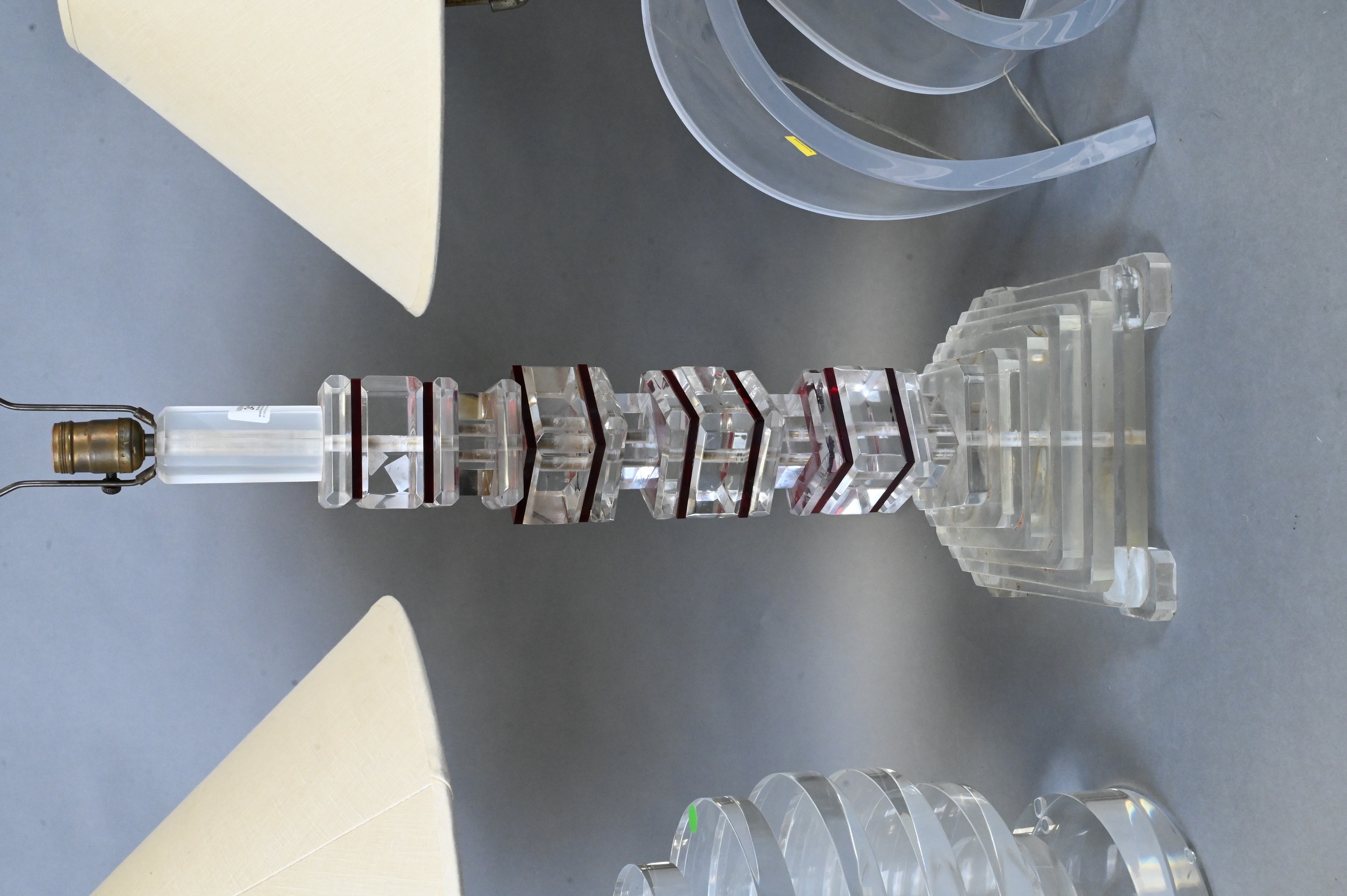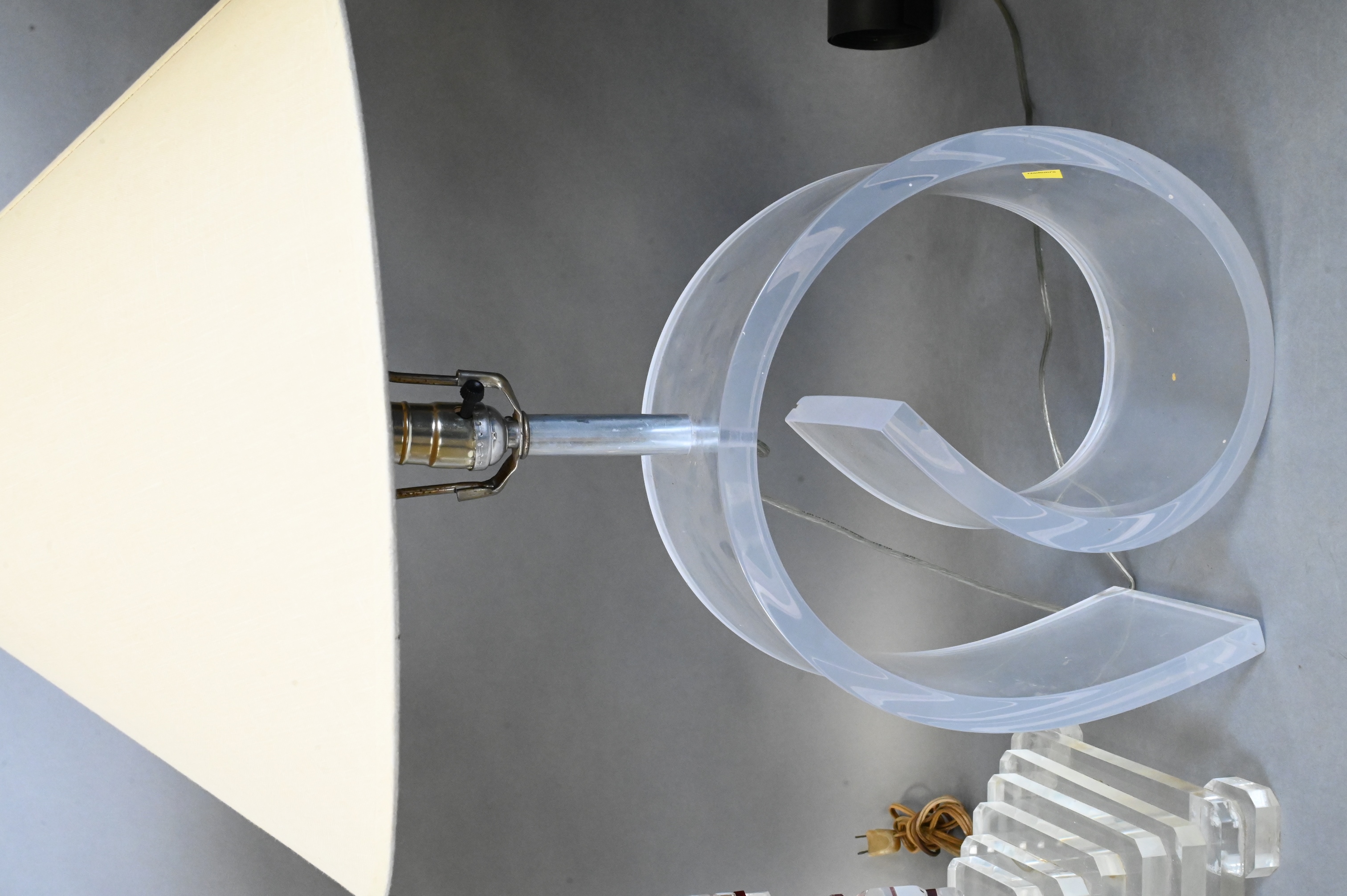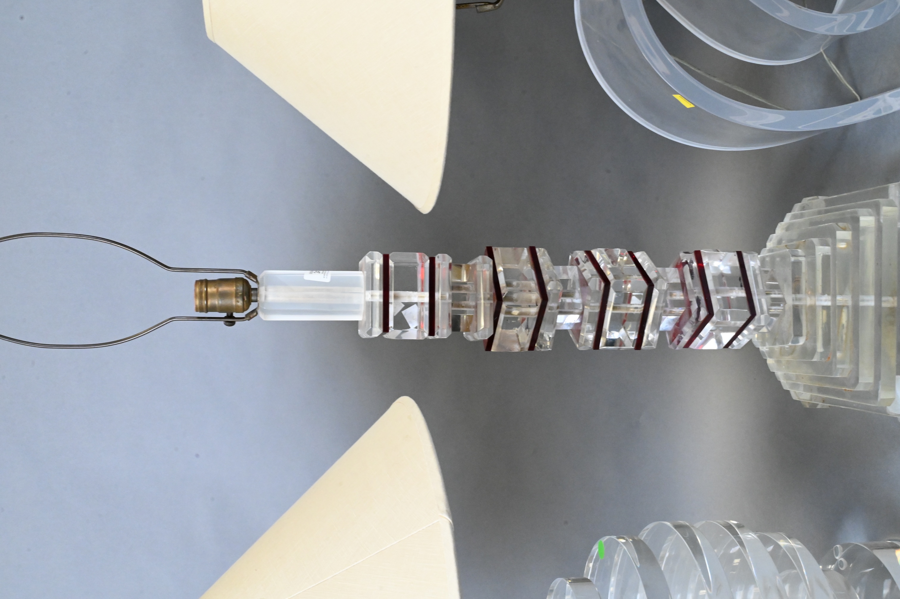 to include Karl Springer style cylindrical stacked lamp, stacked clear and garnet colored pyramid base lamp, snail shaped curved lamp