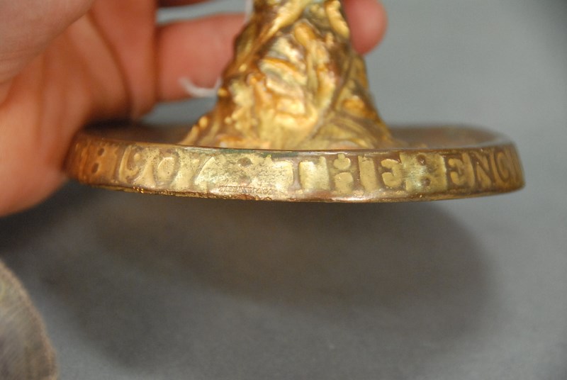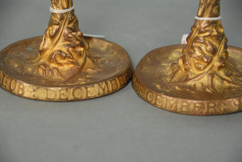 Tiffany & Co. Engineer Club pair of gilt bronze thistle goblets, stems ending with oak leaves on round bases, inscribed on base edge The Engineers Club December 9th 1907 marked Tiffany & Co. on edge and on bottom. ht. 7 5/8in.