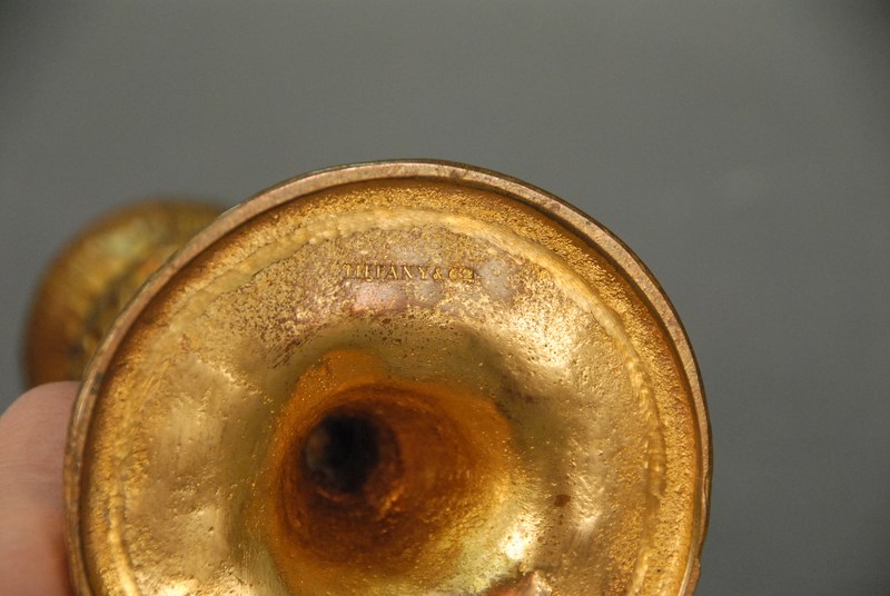 Lot 241: Tiffany & Co. Engineer Club pair of gilt bronze thistle goblets, stems ending with oak leaves on round bases, inscribed on base edge The Engineers Club December 9th 1907 marked Tiffany & Co. on edge and on bottom. ht. 7 5/8in.