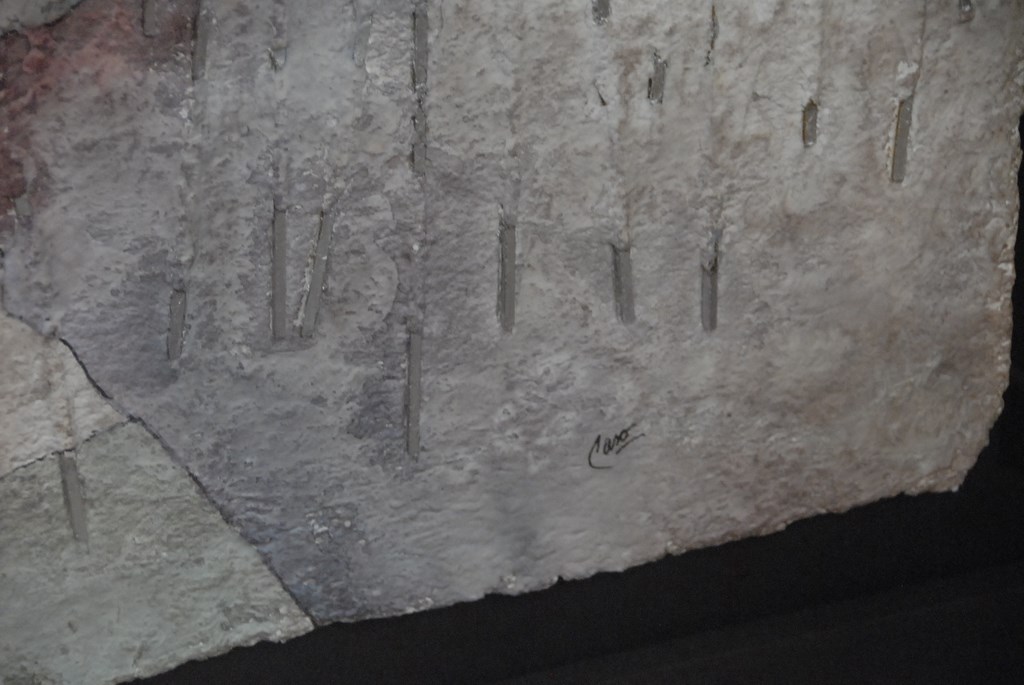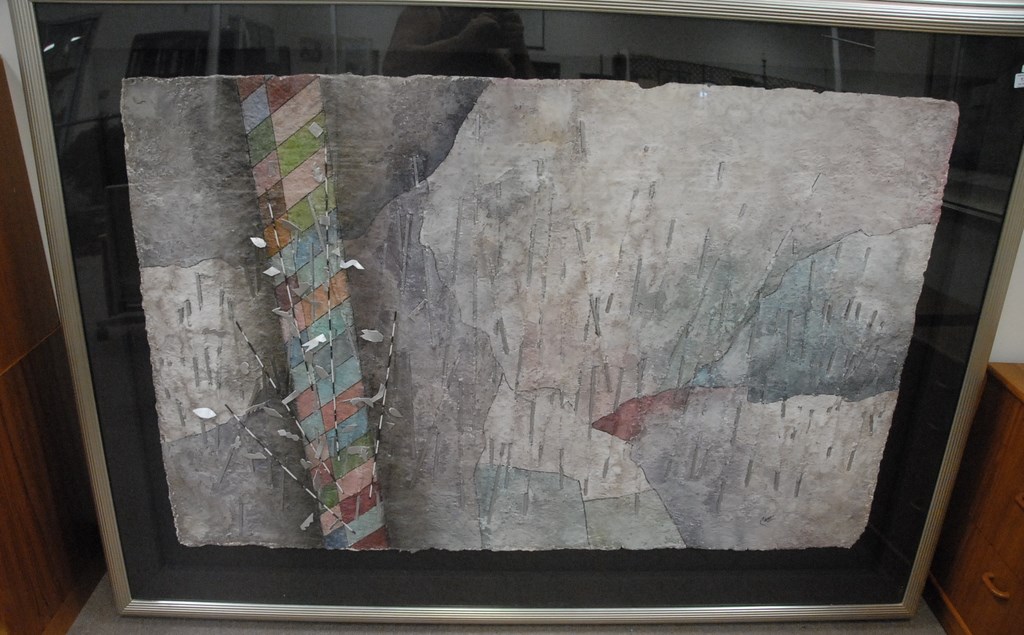 Two piece lot to include blue and gold framed print, 21 x 31 sight size and Anthony Sir Anthony Caro 1924 three dimensional abstract painting signed lower right Caro 43 x 65