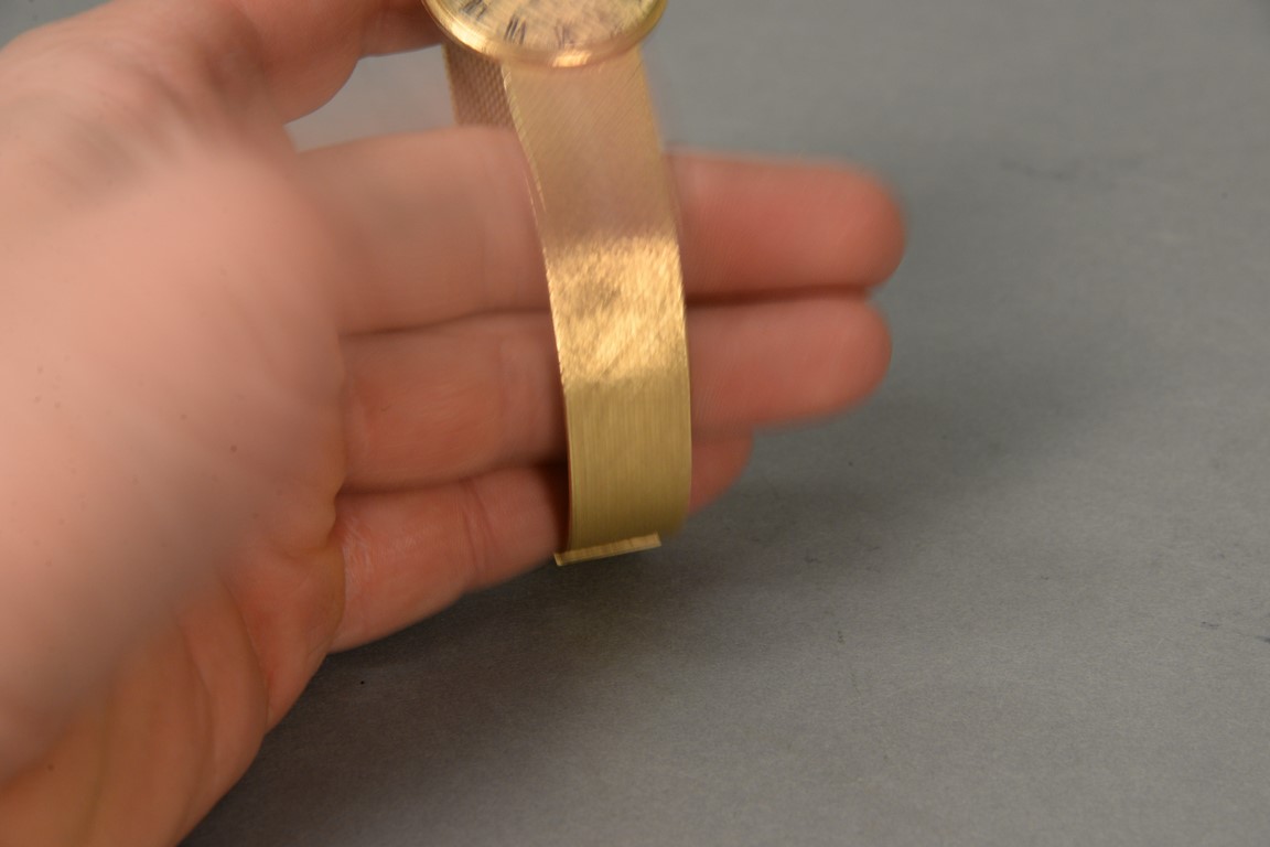 Lot 241: Universal 18K gold mens wristwatch with 18K gold mesh band, marked on dial: Universal Geneva. stem cap missing total weight 80 grams