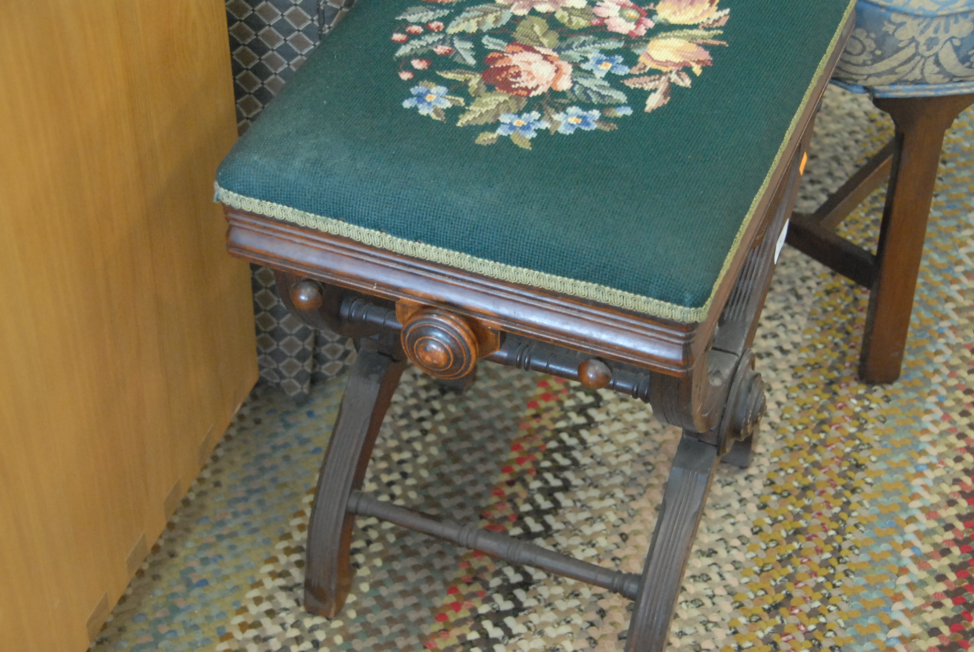 Lot 241: Victorian organ stool with needlepoint seat and adjustable height base.