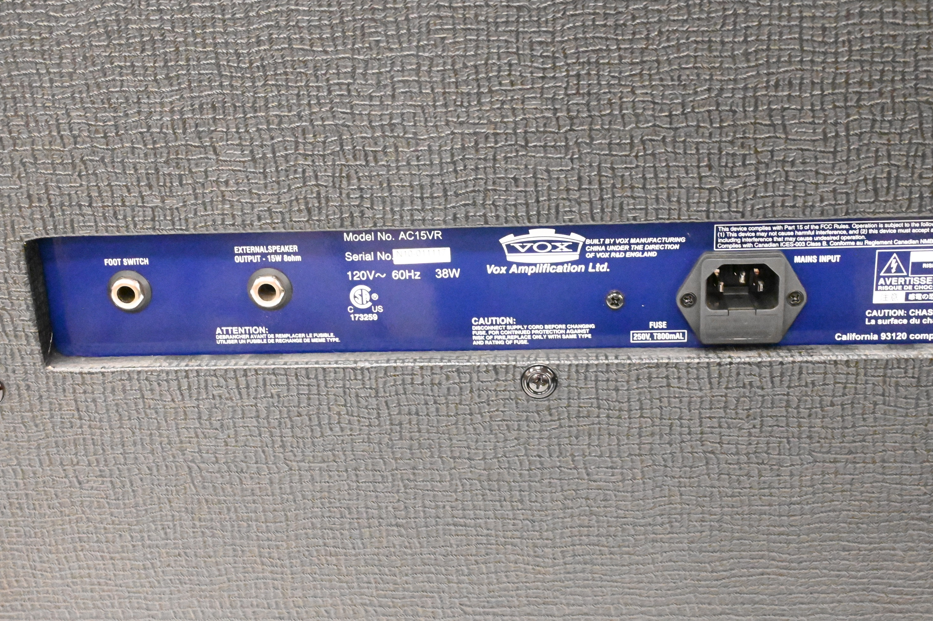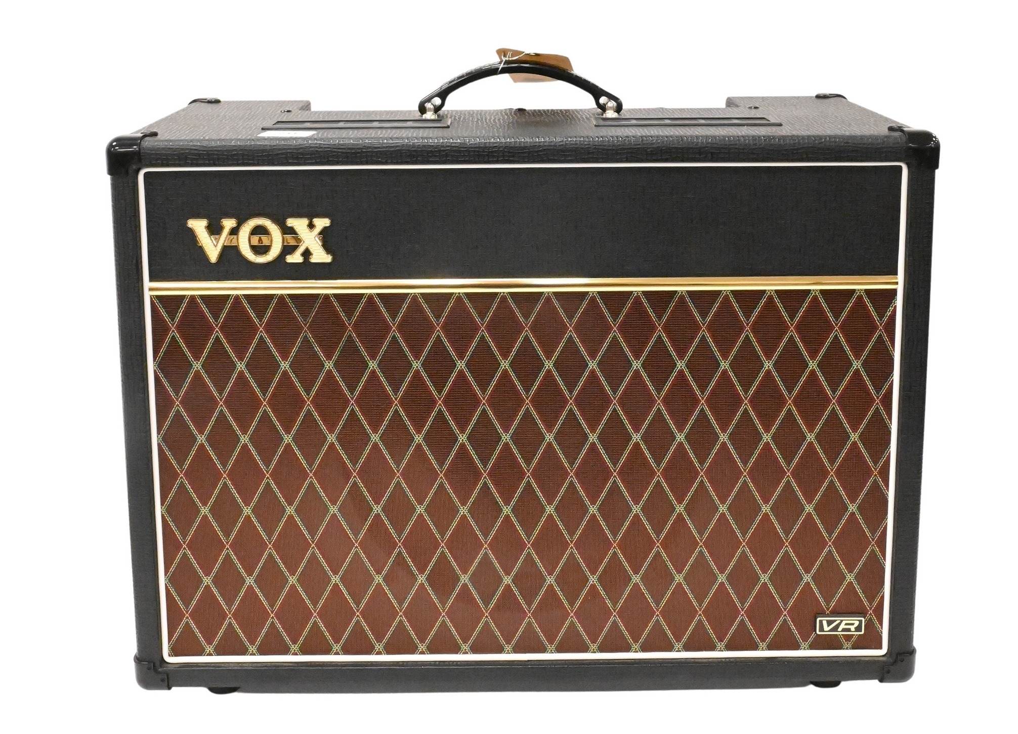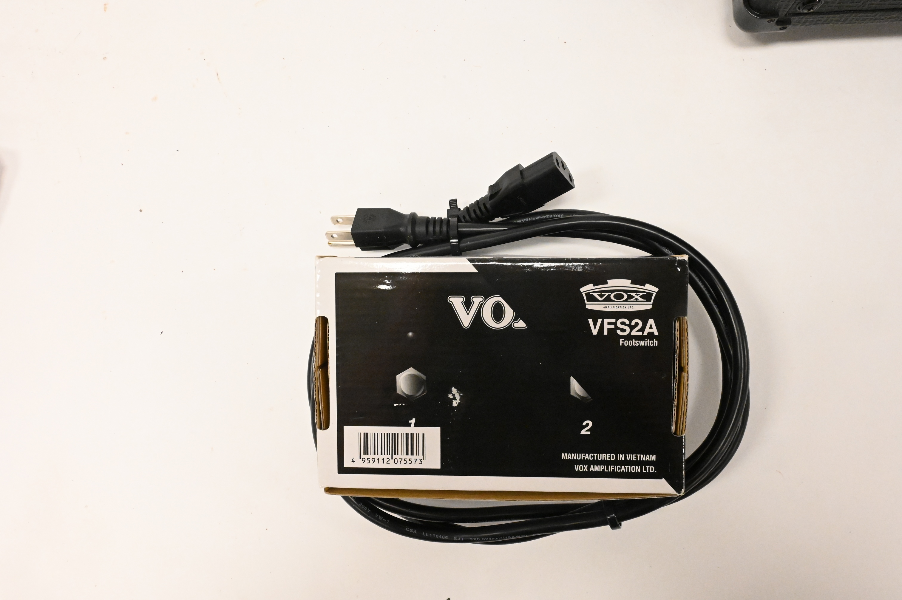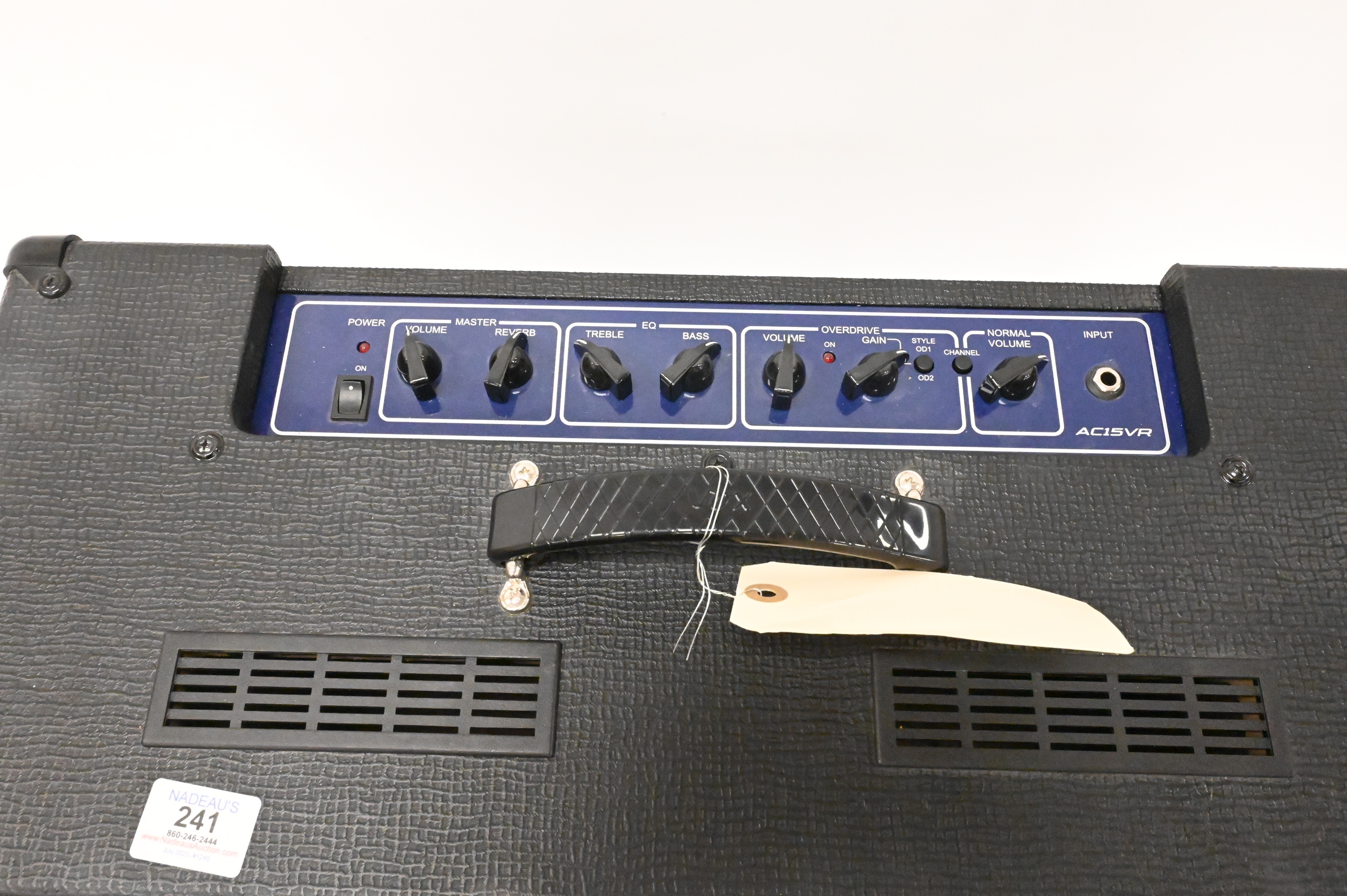 VOX AC15VR Valve Reactor Guitar Amplifier, with foot switch and manuel, height 17 inches, length 23 1/2 inches, width 10 1/2 inches.