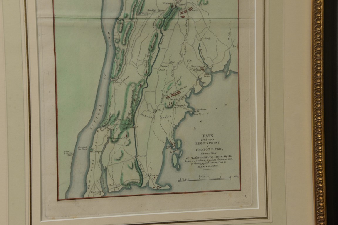 William Faden, Claude Joseph Sauthier hand colored engraved map Pays Situe entre Frogs pint et Croton River of Position Des Armees Americaine et Britannique depuis le 12 Octobre 1775 plate size 17 1/2 x 9 1/2 Provenance: Property from Credit Suisse’s Americana Collection
