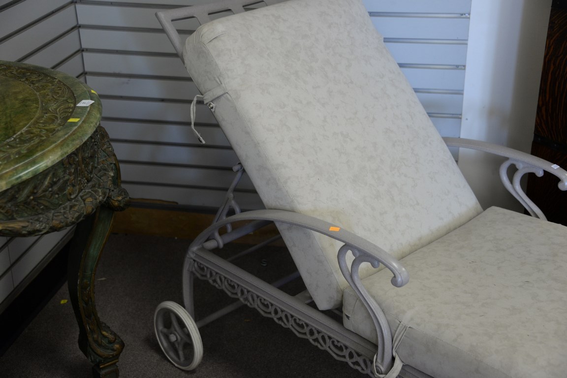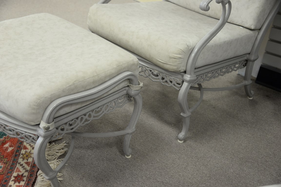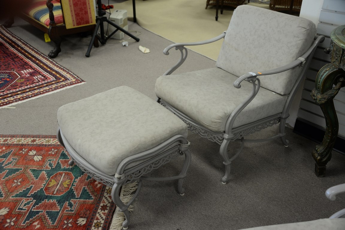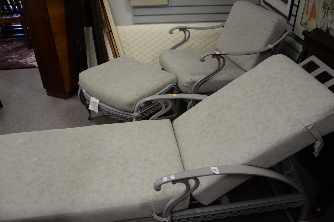 Lot 241: Woodard three piece metal outdoor set consisting of a chaise lounge, armchair and footstool with cushions. chaise: lg. 80 in.