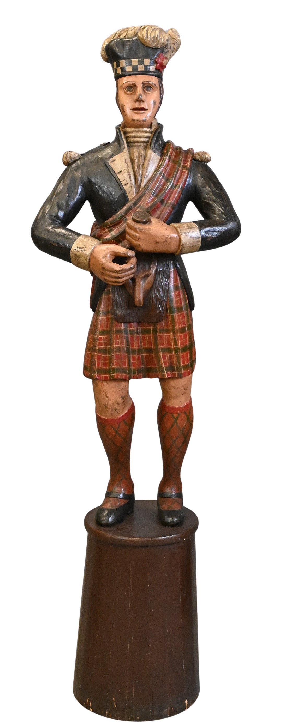 carved in the form of a Scotsman in balmoral hat and tartan kilt, retaining polychrome decoration, raised on a cylindrical base (circa 1970)