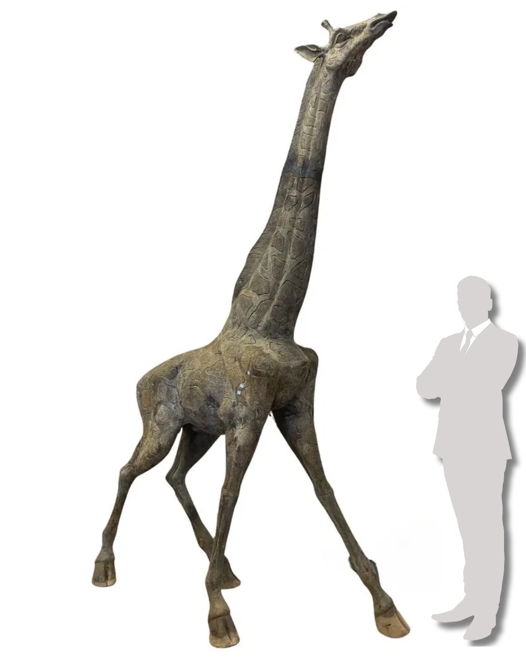 in textured finish, having green / grey patina, posed in walking position, having textured spots (tail broken off)