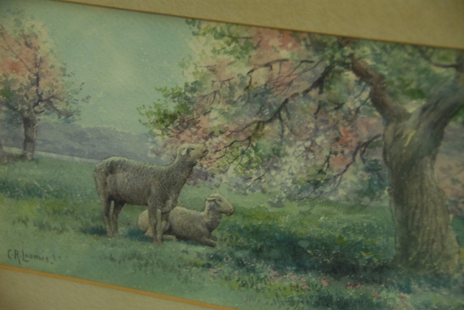 Charles Russell Loomis 1857-1936 sheep in spring landscape watercolor signed lower left C. R. Loomis. 11 x 6