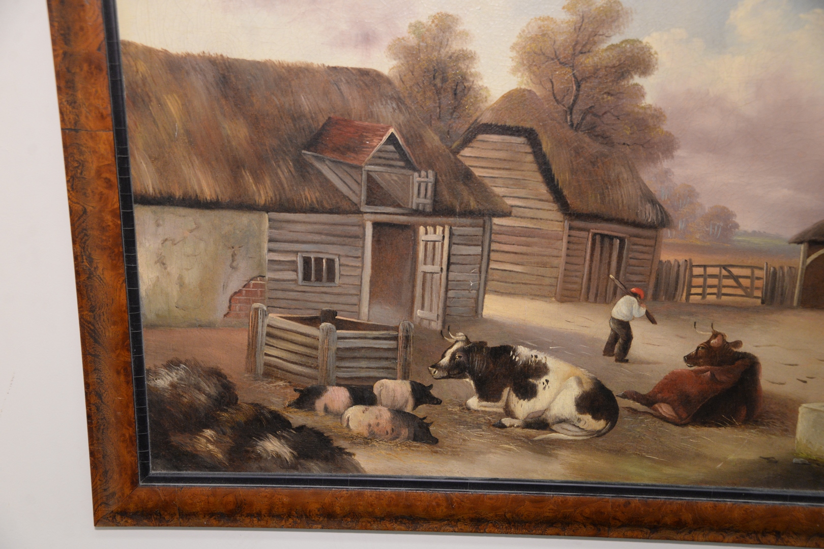 Continental School (late 19th century), barnyard scene, oil on glue lined canvas, unsigned, 20″ x 24″, (as is with minor paint loss to sky).