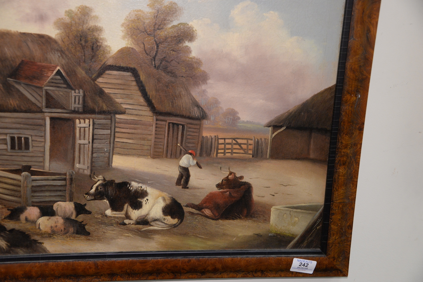 Lot 242: Continental School (late 19th century), barnyard scene, oil on glue lined canvas, unsigned, 20″ x 24″, (as is with minor paint loss to sky).