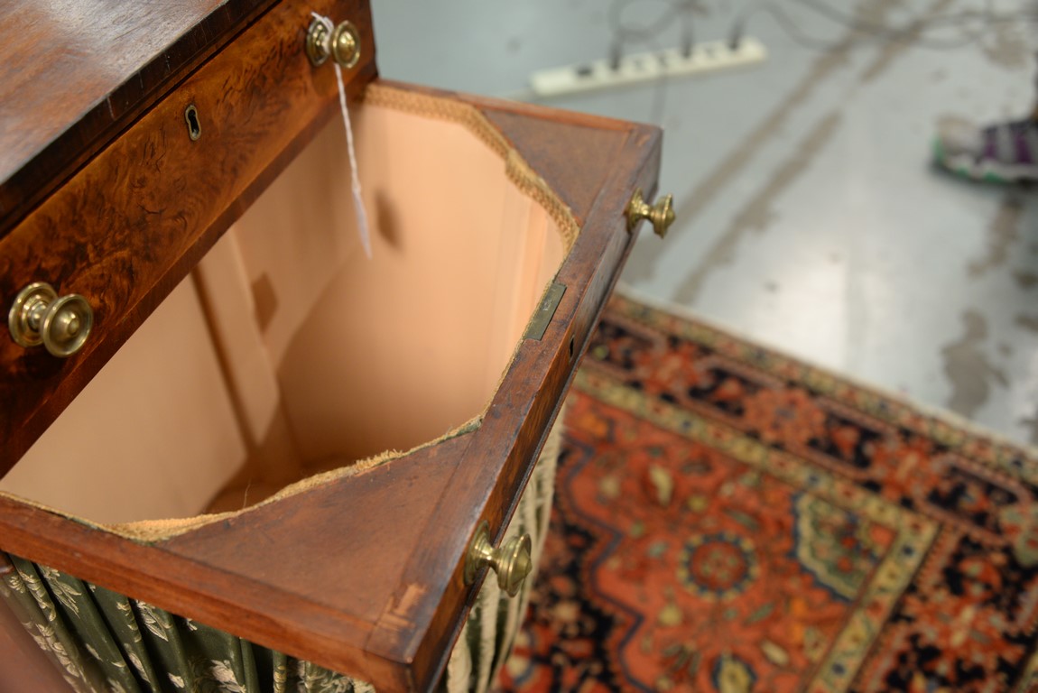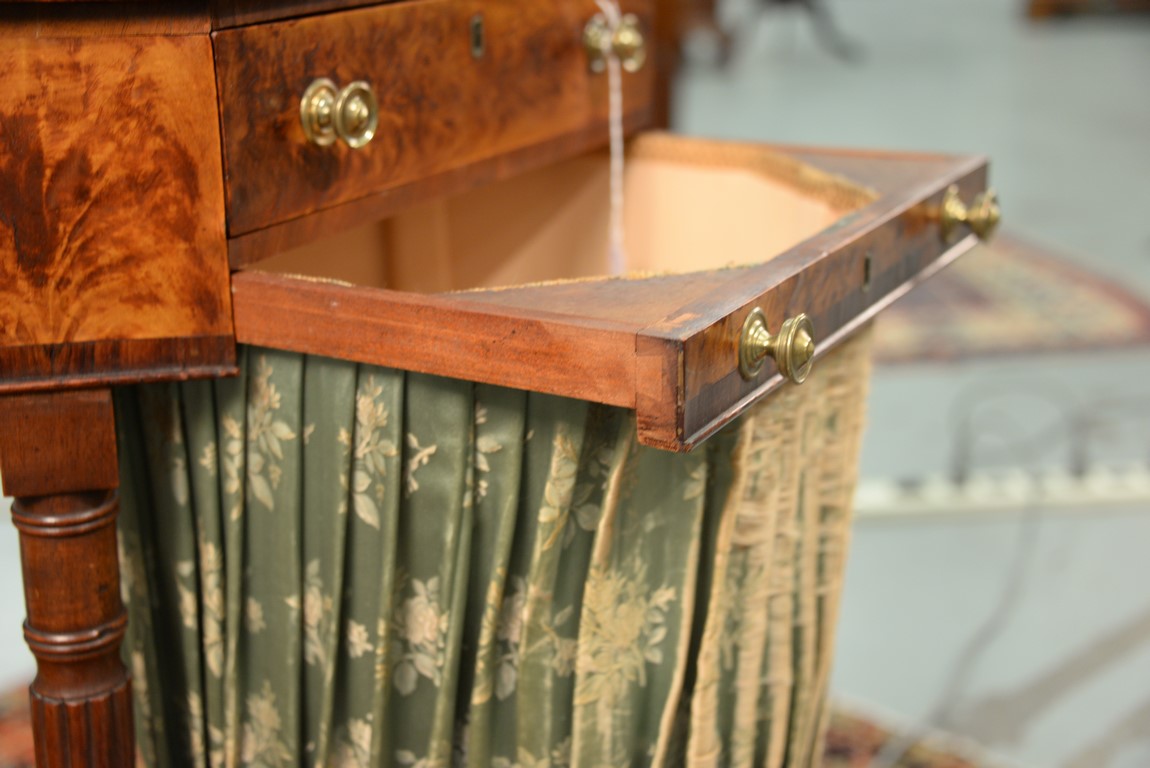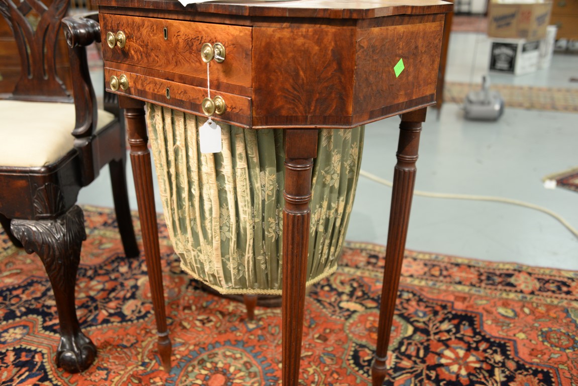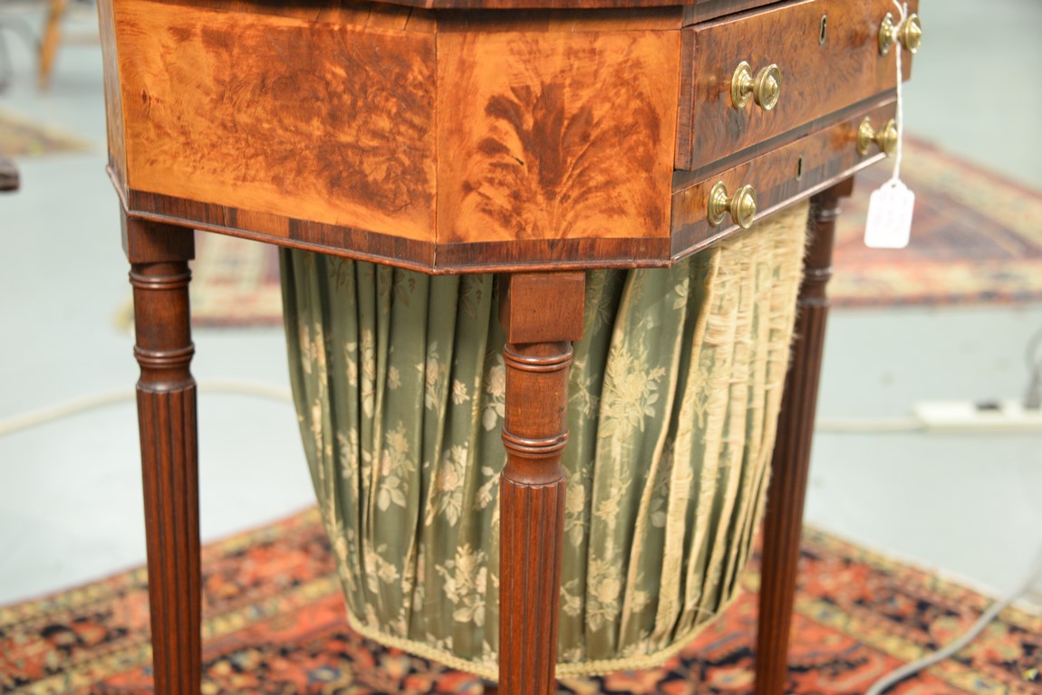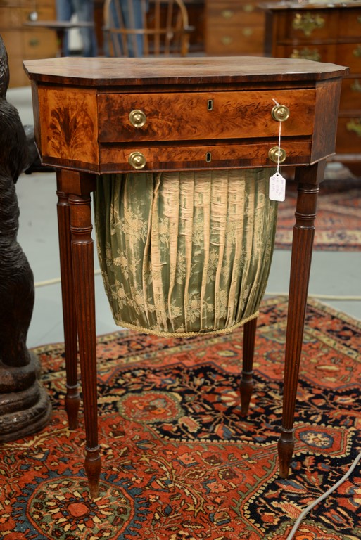 Lot 242: Federal mahogany inlaid work table having canted top over conforming case with one drawer plus a green damask bag drawer all on turned reeded legs, sides burlwood with inlaid panel top, probably Salem, Mass, circa 1800-1810 crack on top. ht