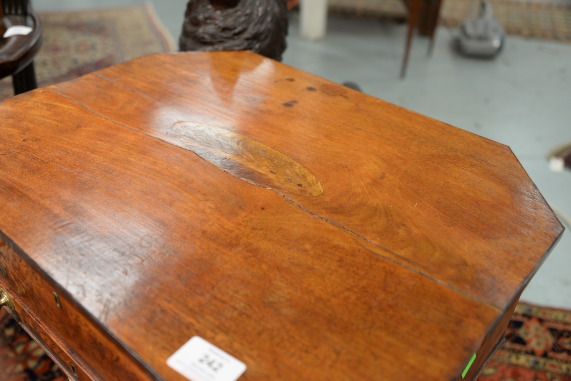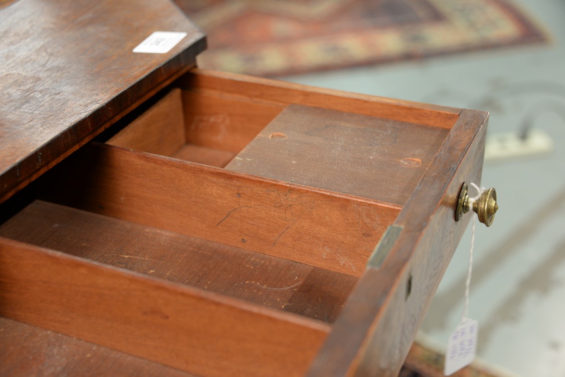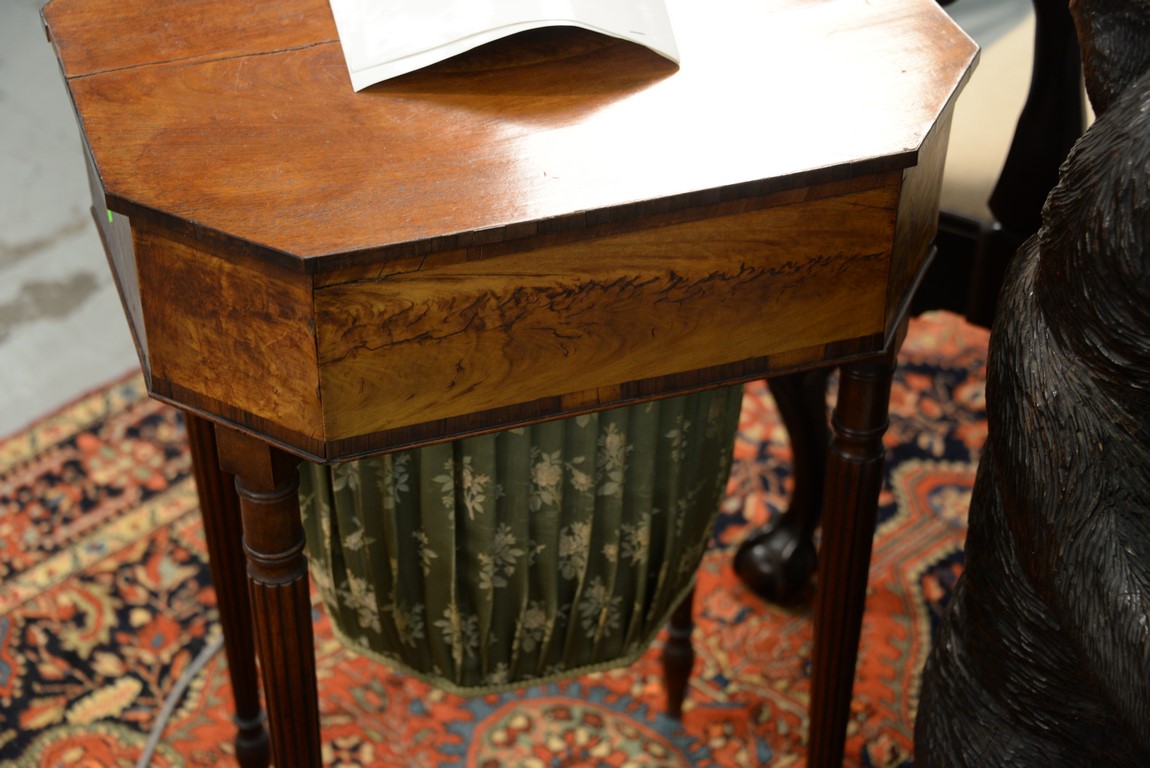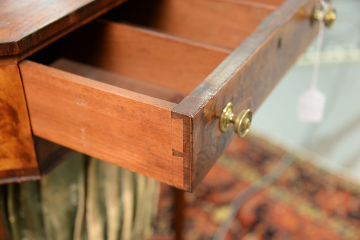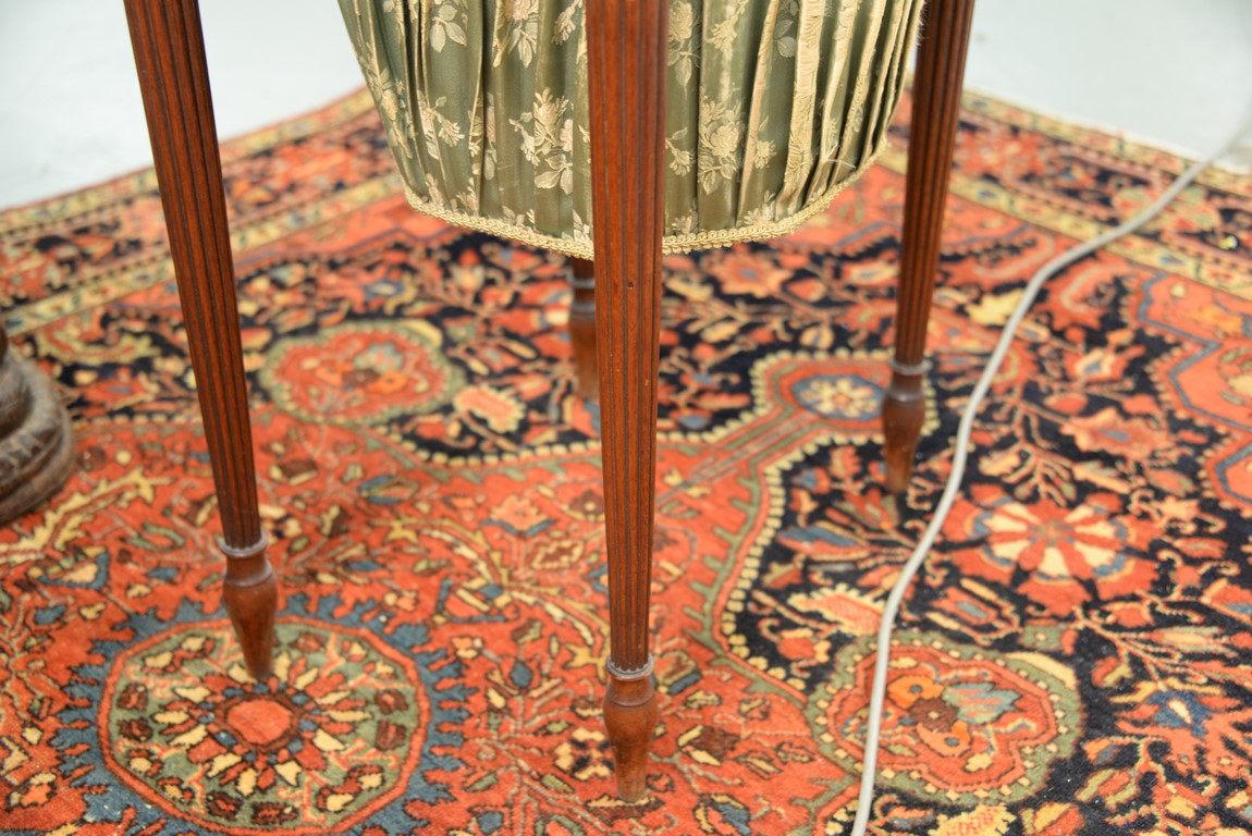 Lot 242: Federal mahogany inlaid work table having canted top over conforming case with one drawer plus a green damask bag drawer all on turned reeded legs, sides burlwood with inlaid panel top, probably Salem, Mass, circa 1800-1810 crack on top. ht