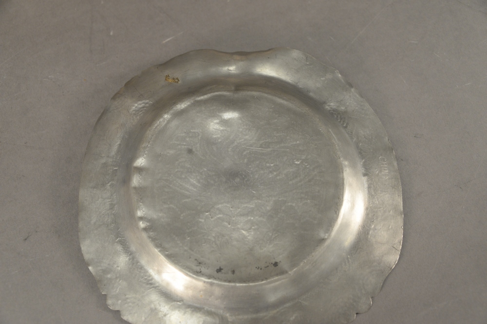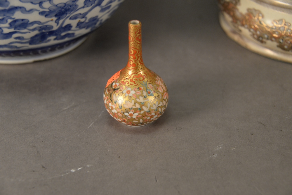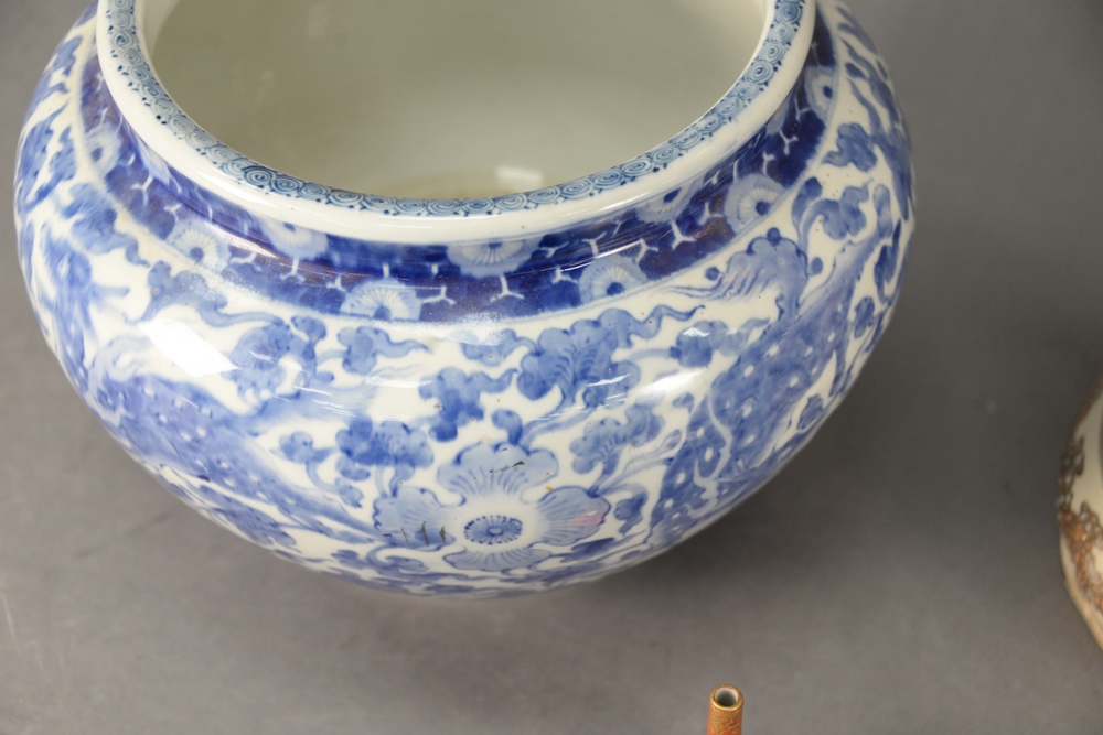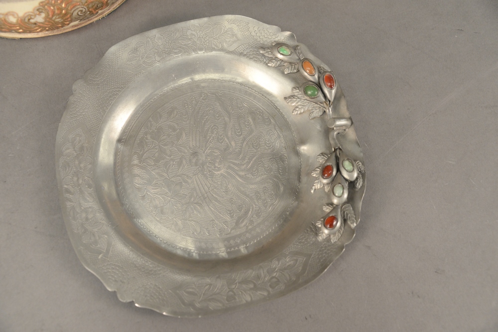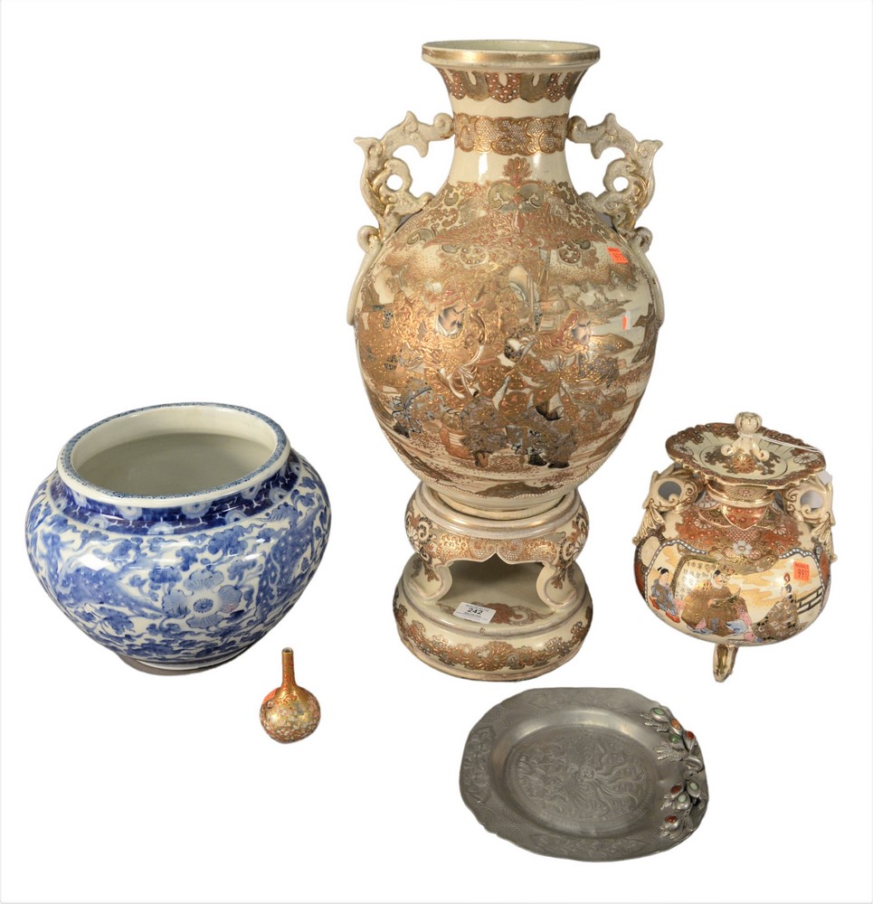 Five Piece Lot, to include a Satsuma vase on stand; Satsuma covered urn; small Japanese cabinet vase; pewter plate with jewels, along with blue and white Chinese planter, urn height 24 inches, plate diameter 8 1/2 inches.