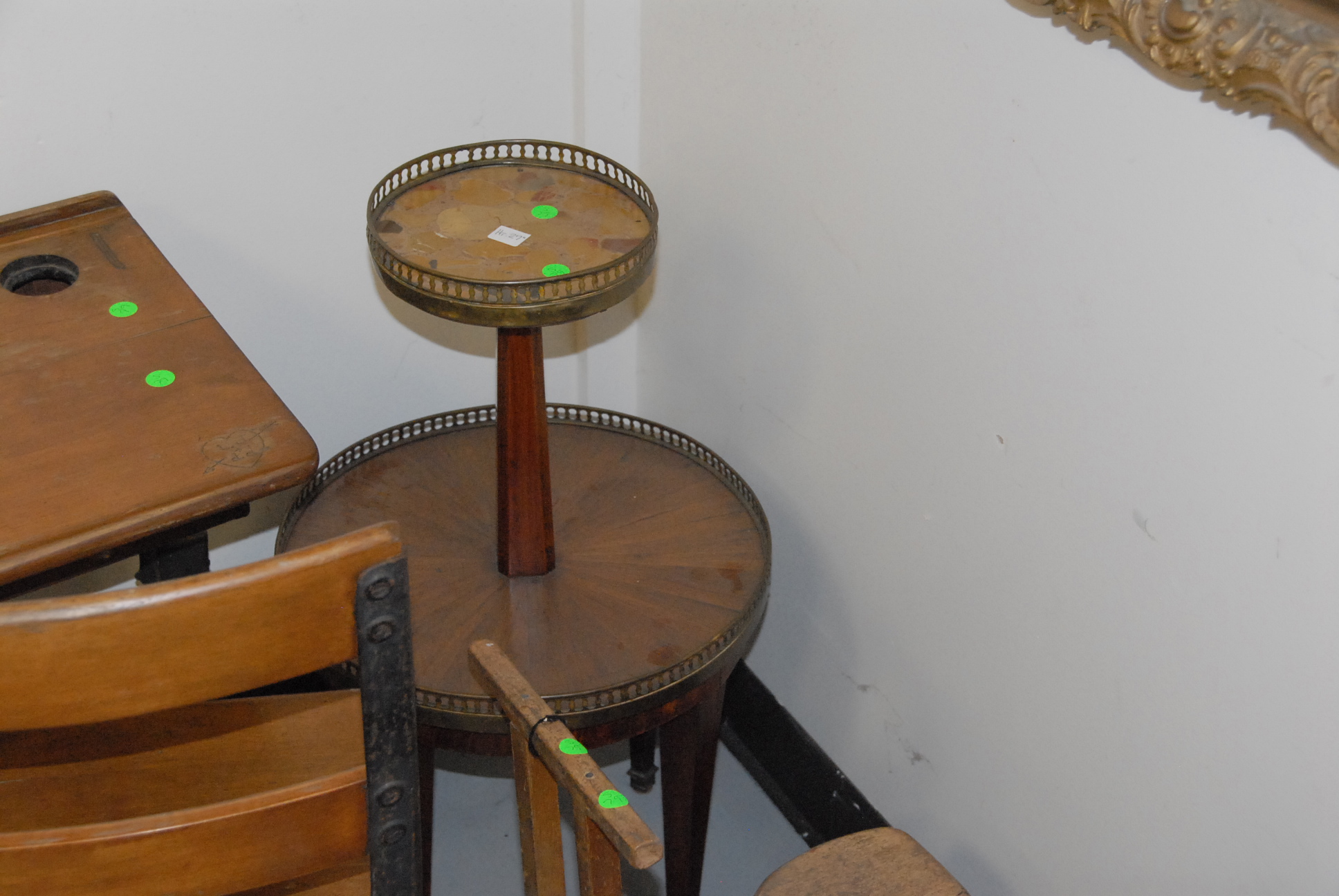 Group lot to include a ladder back chair, two tiered French table, a child’s scooter, and a Heywood Wakefield child’s desk and chair.