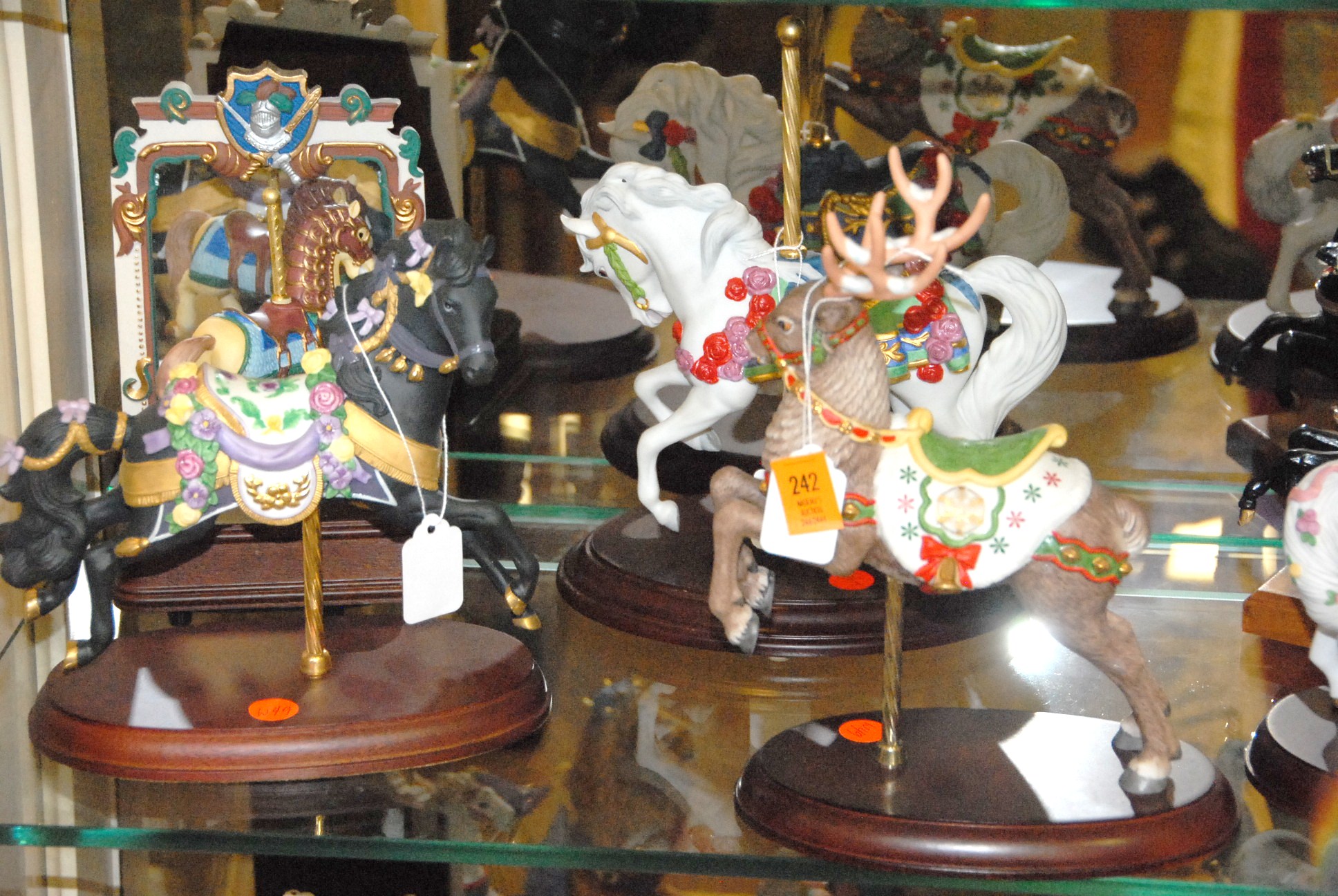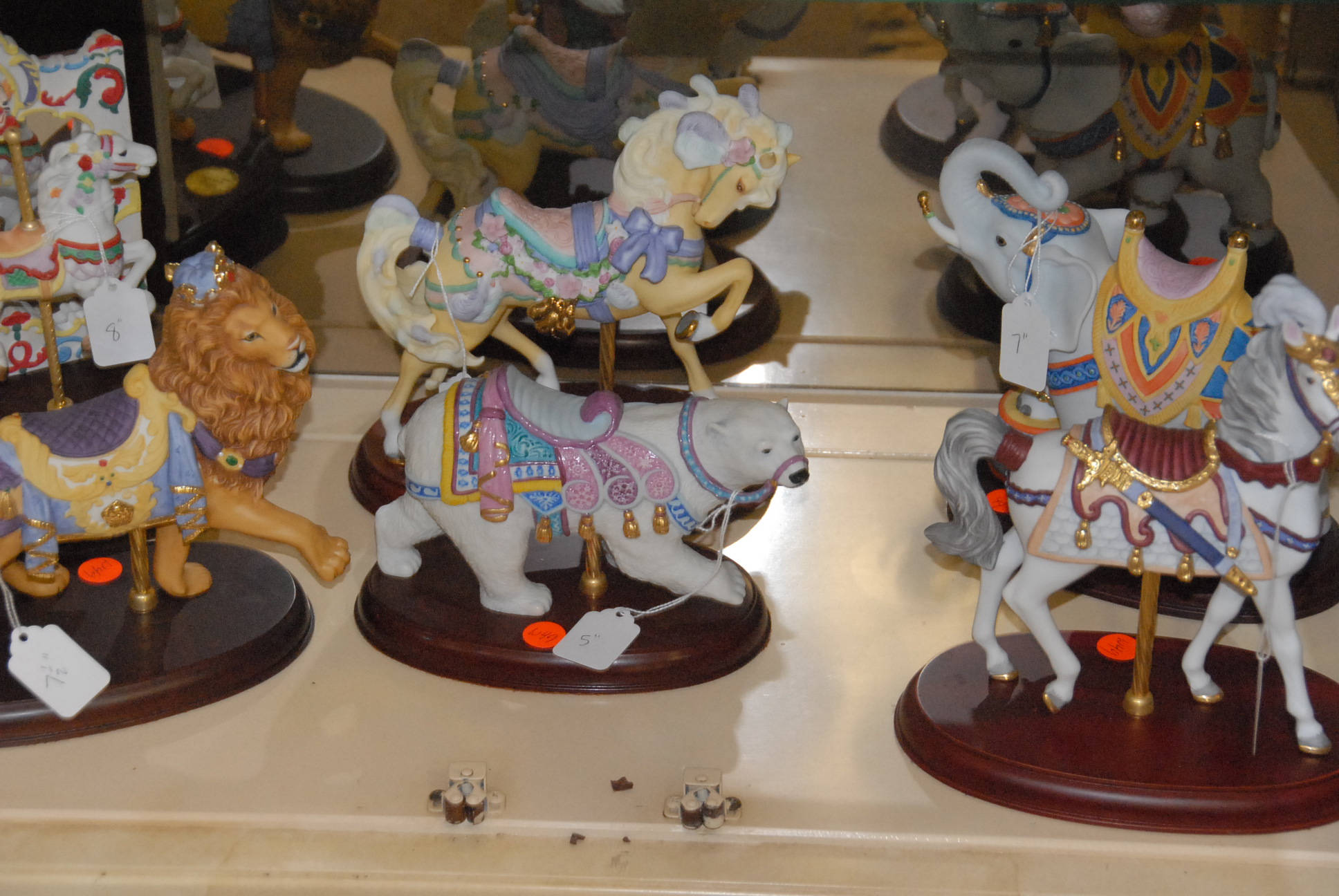 Group of twelve horse and carousel animal style bisque figures, two with music boxes.