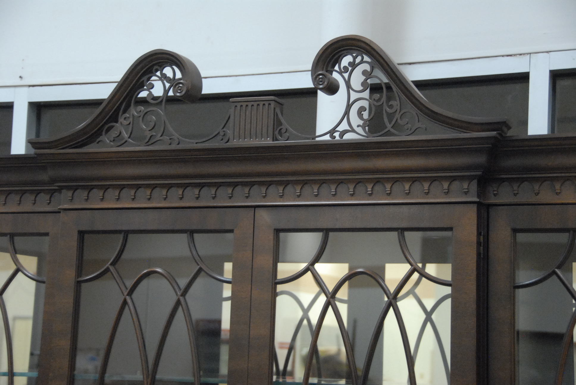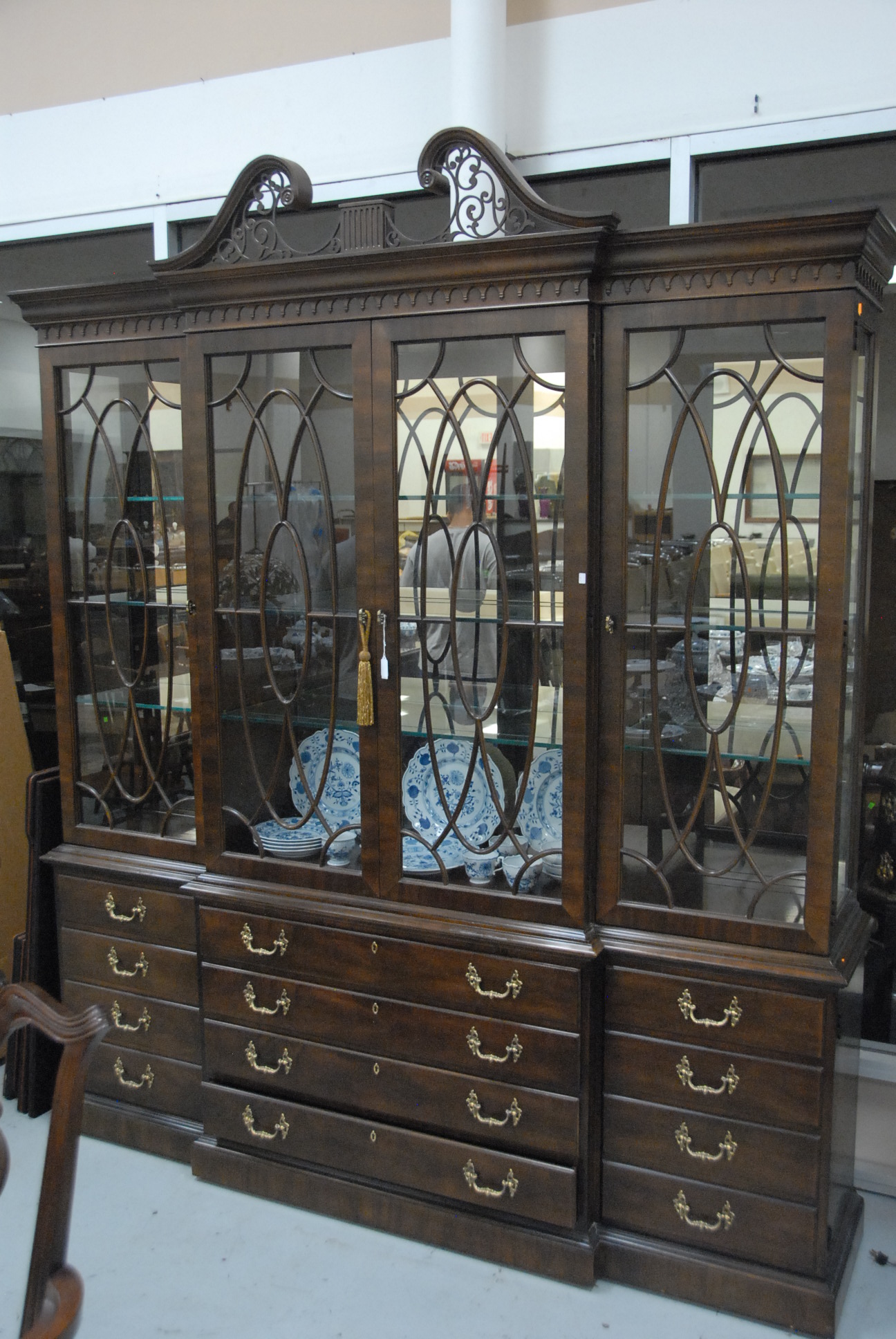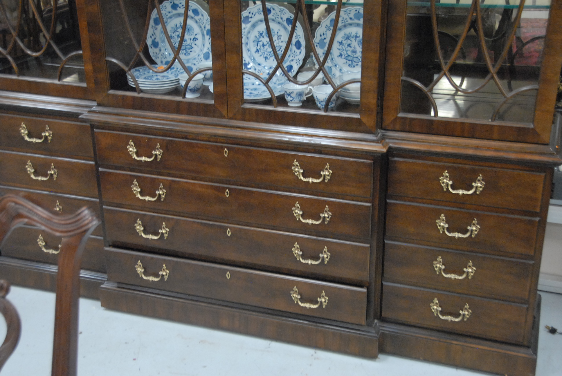 Henredon mahogany breakfront with glass shelves, ht. 91 in. wd. 77 in. dp. 16in.