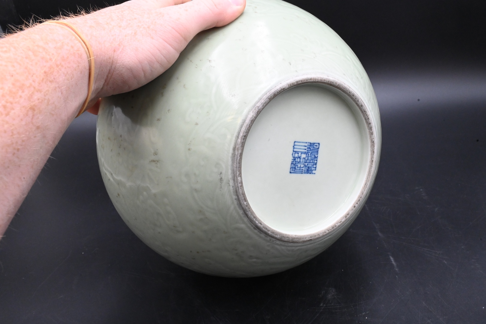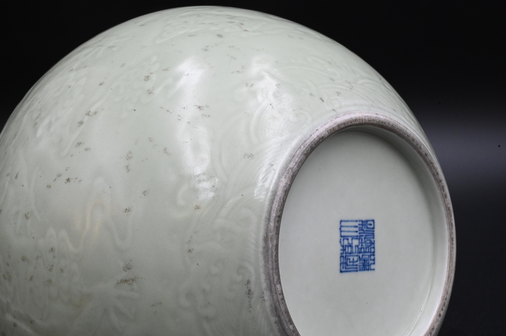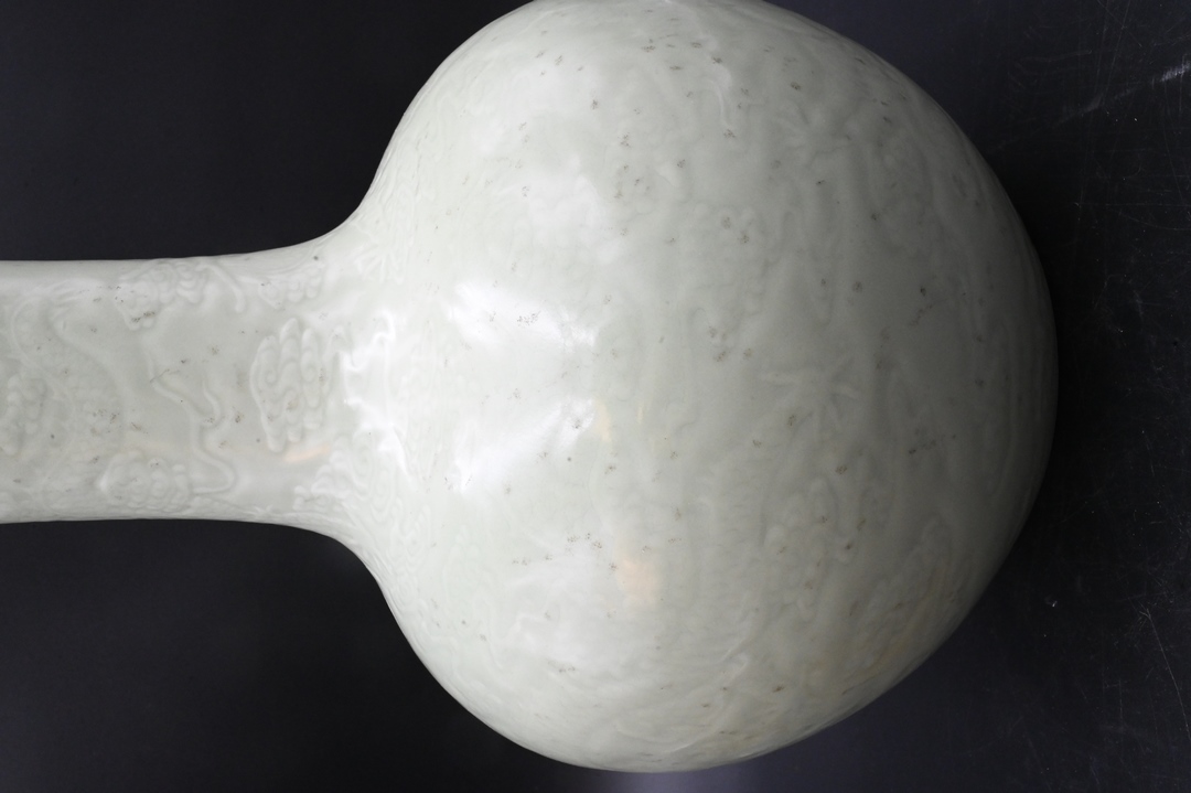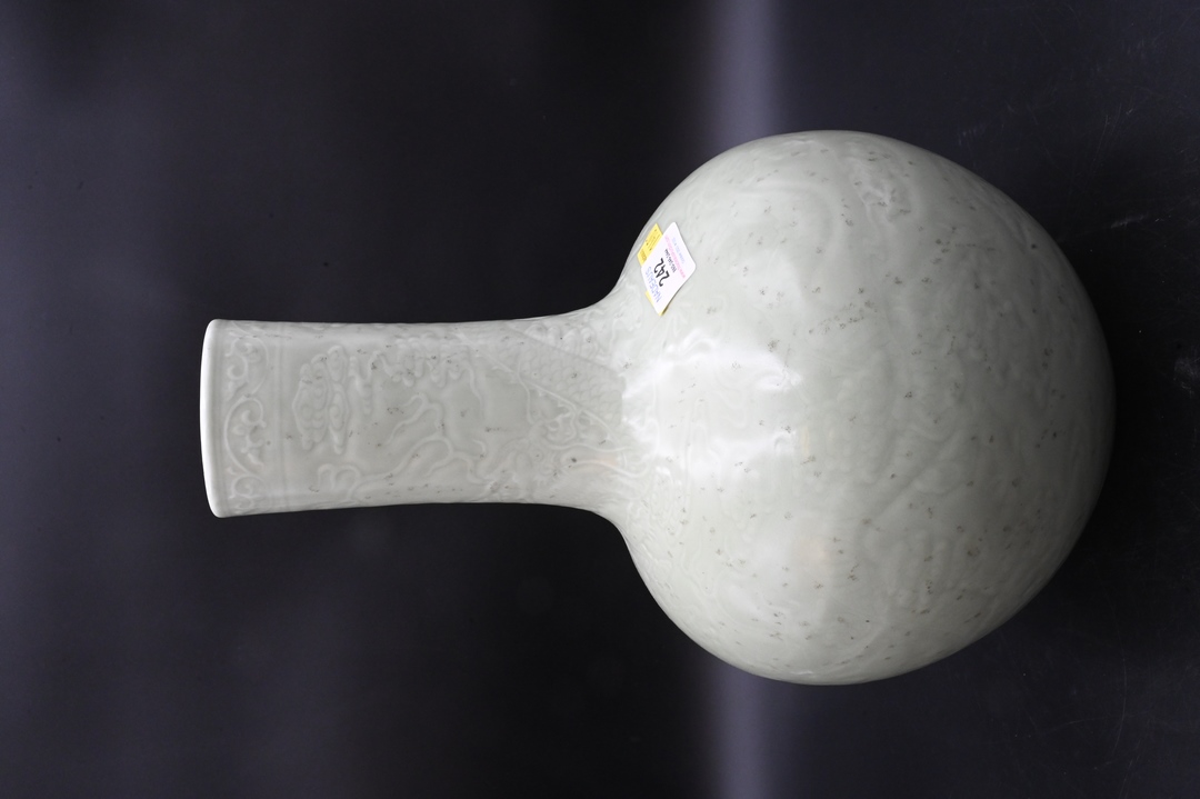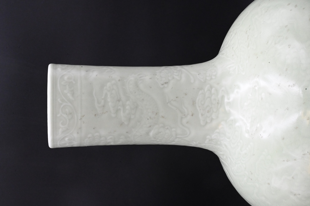 Large Celadon Bottle Vase (Tianqiuping), decorated with low relief dragons and clouds, firing imperfections, height 15 1/2 inches.