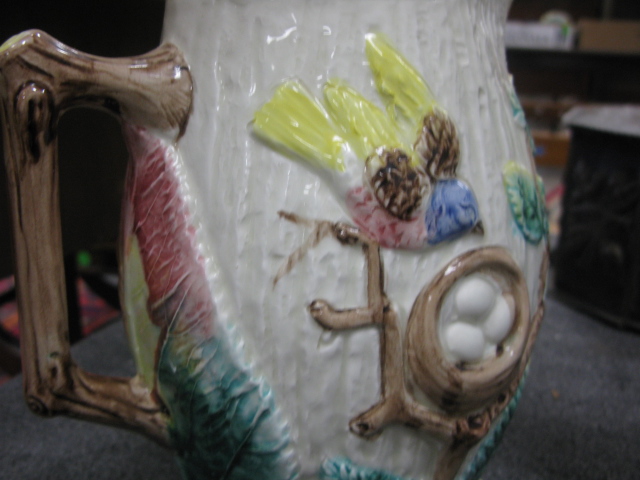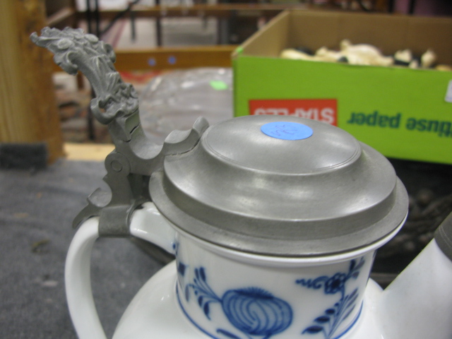 Meissen pitcher with pewter top and spout marked with cross swords along with a majolica reproduction pitcher
