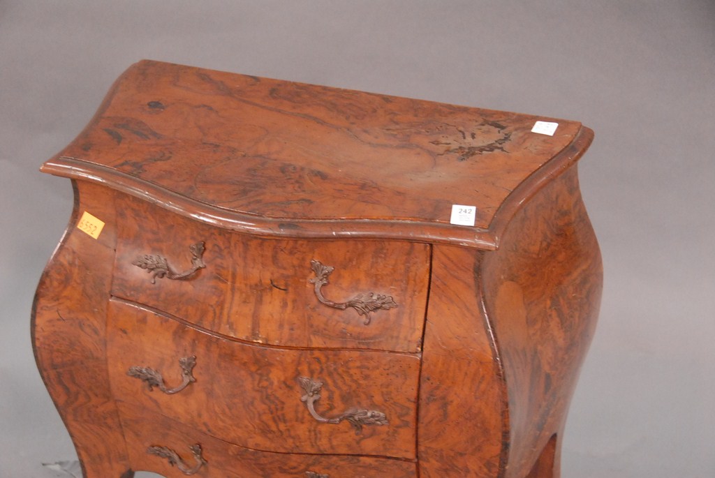Lot 242: Miniature burlwood Bombay three drawer chest, ht. 19, wd. 18, dp. 10.