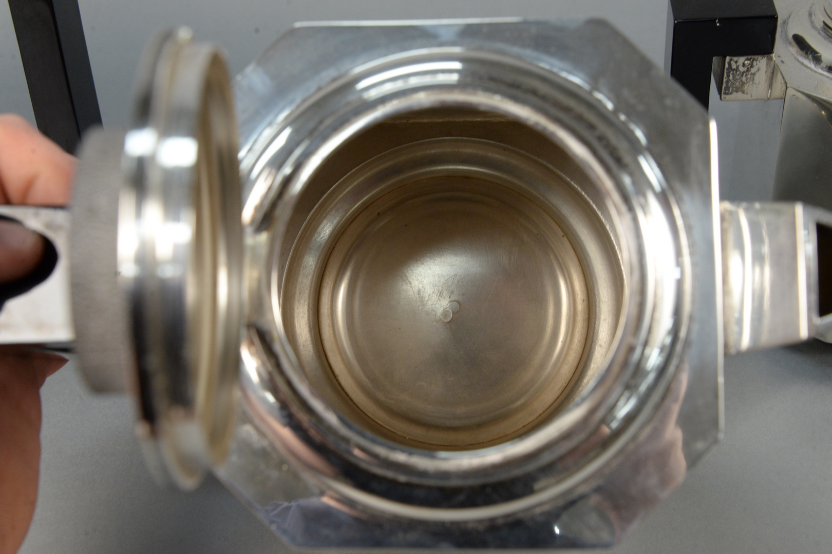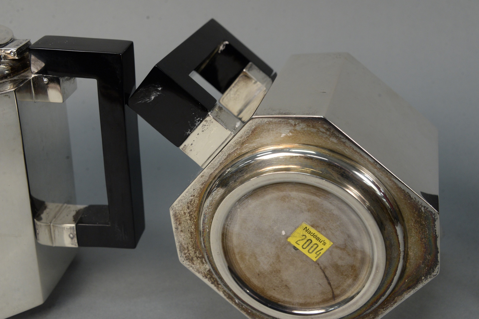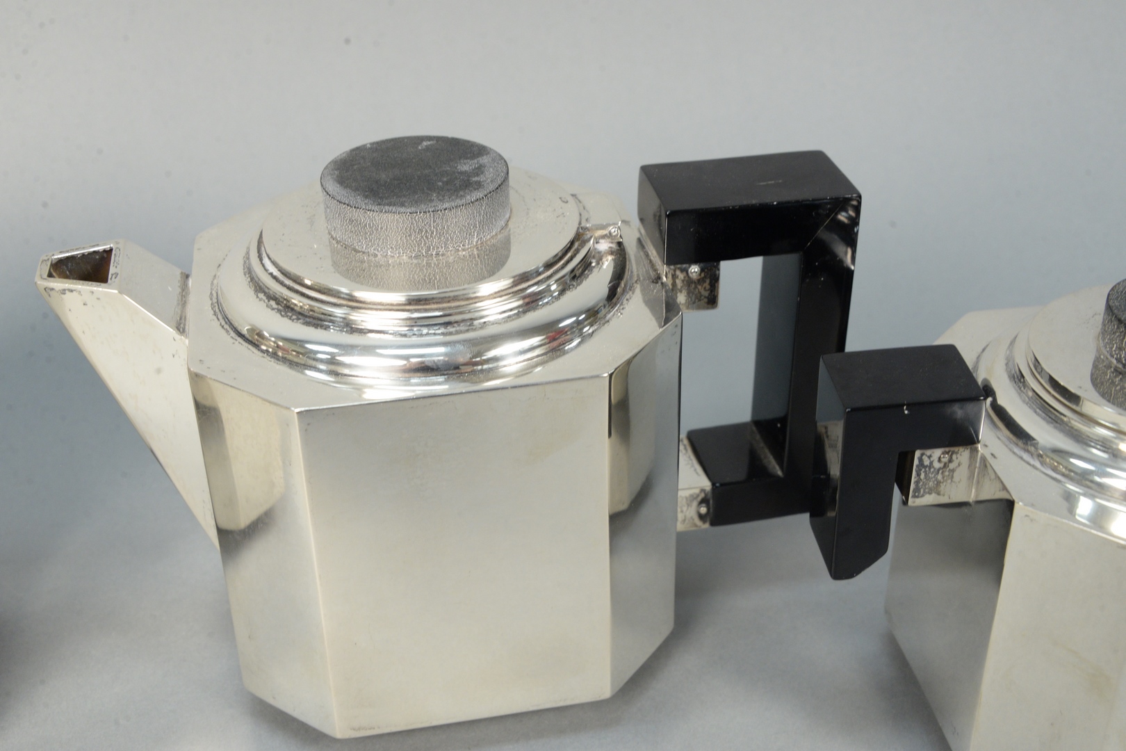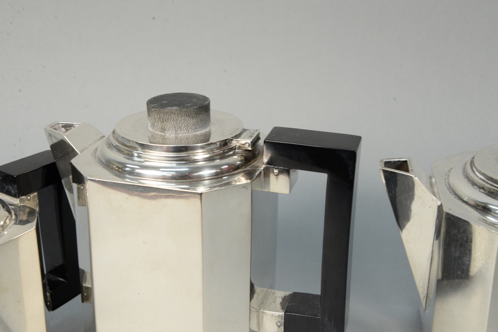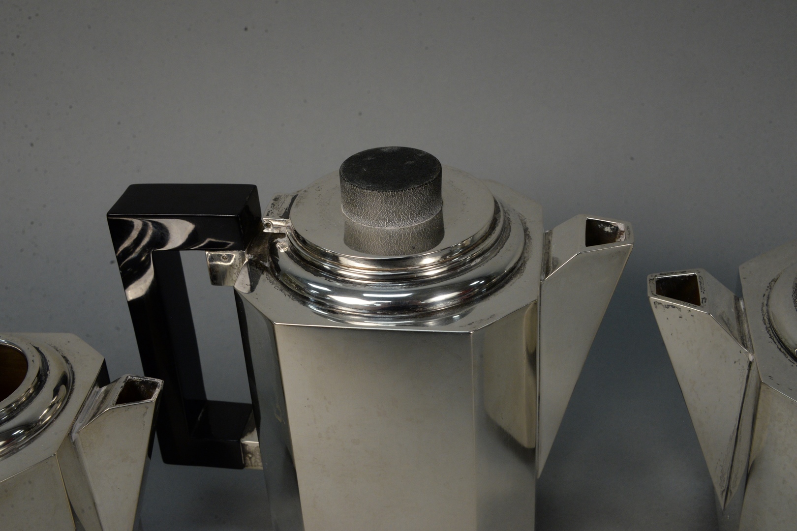 Lot 242: Modernism Style Sterling Silver four piece tea and coffee service, having square design, and wood handles tallest height 7 1/4…