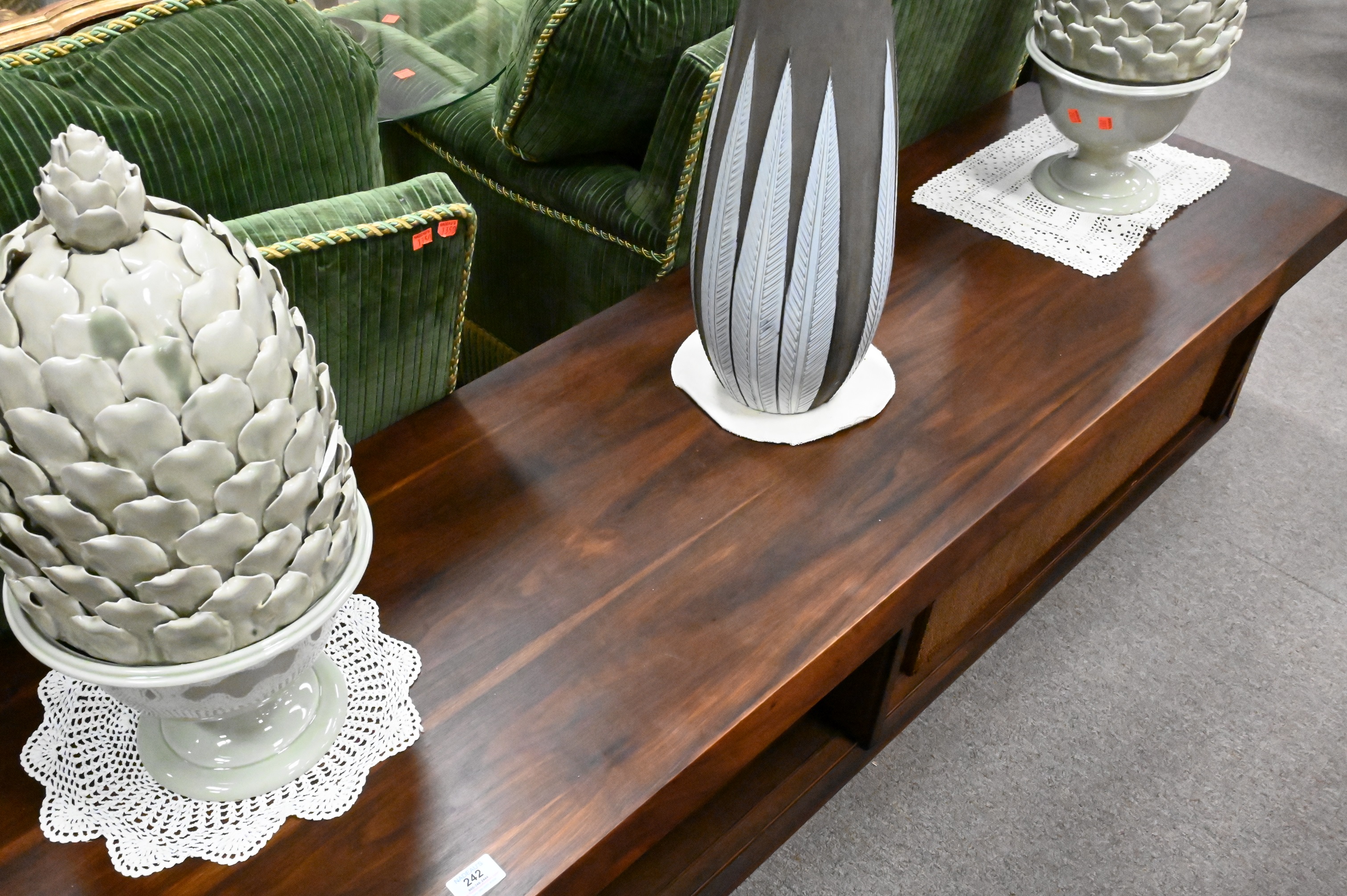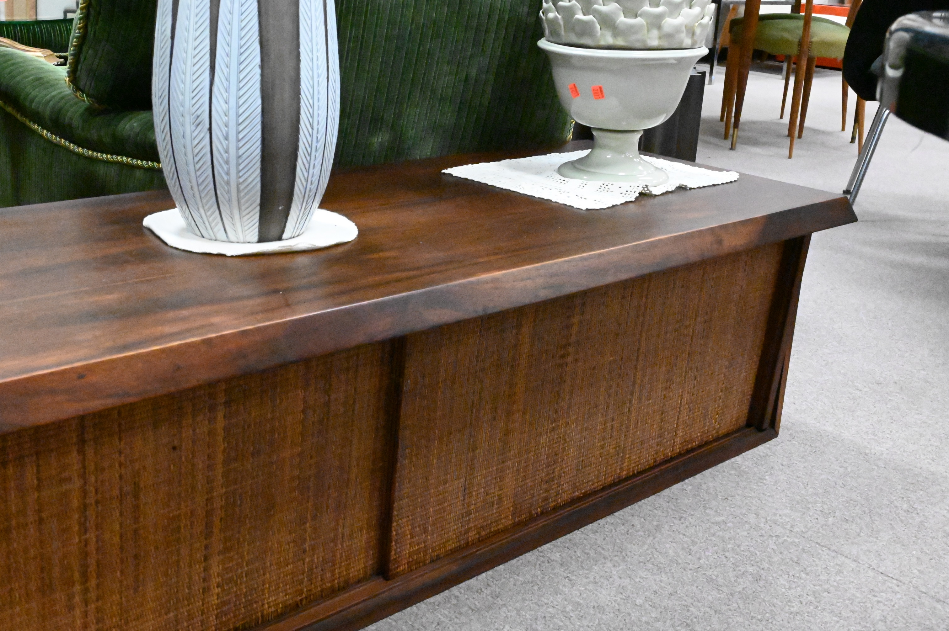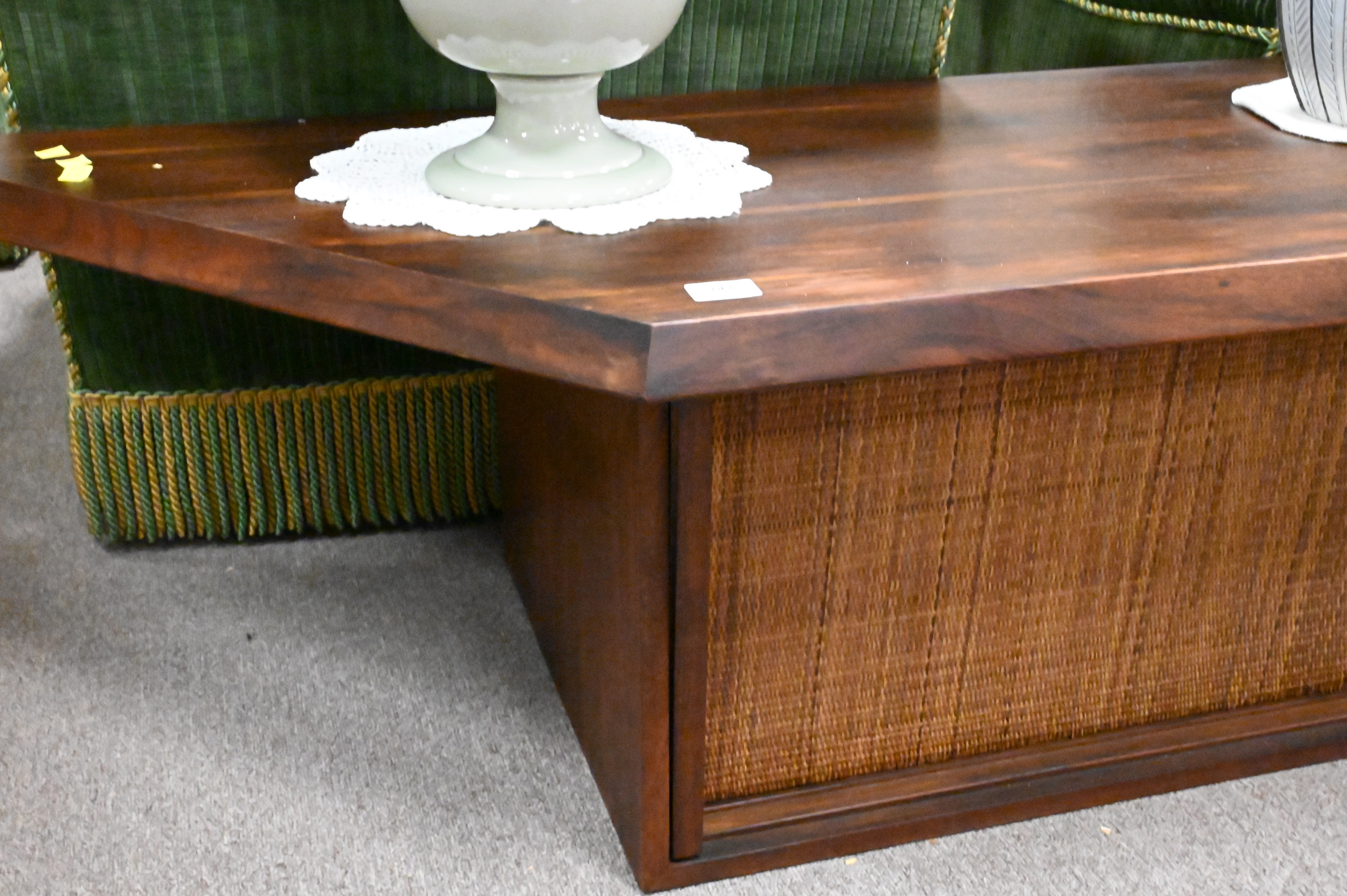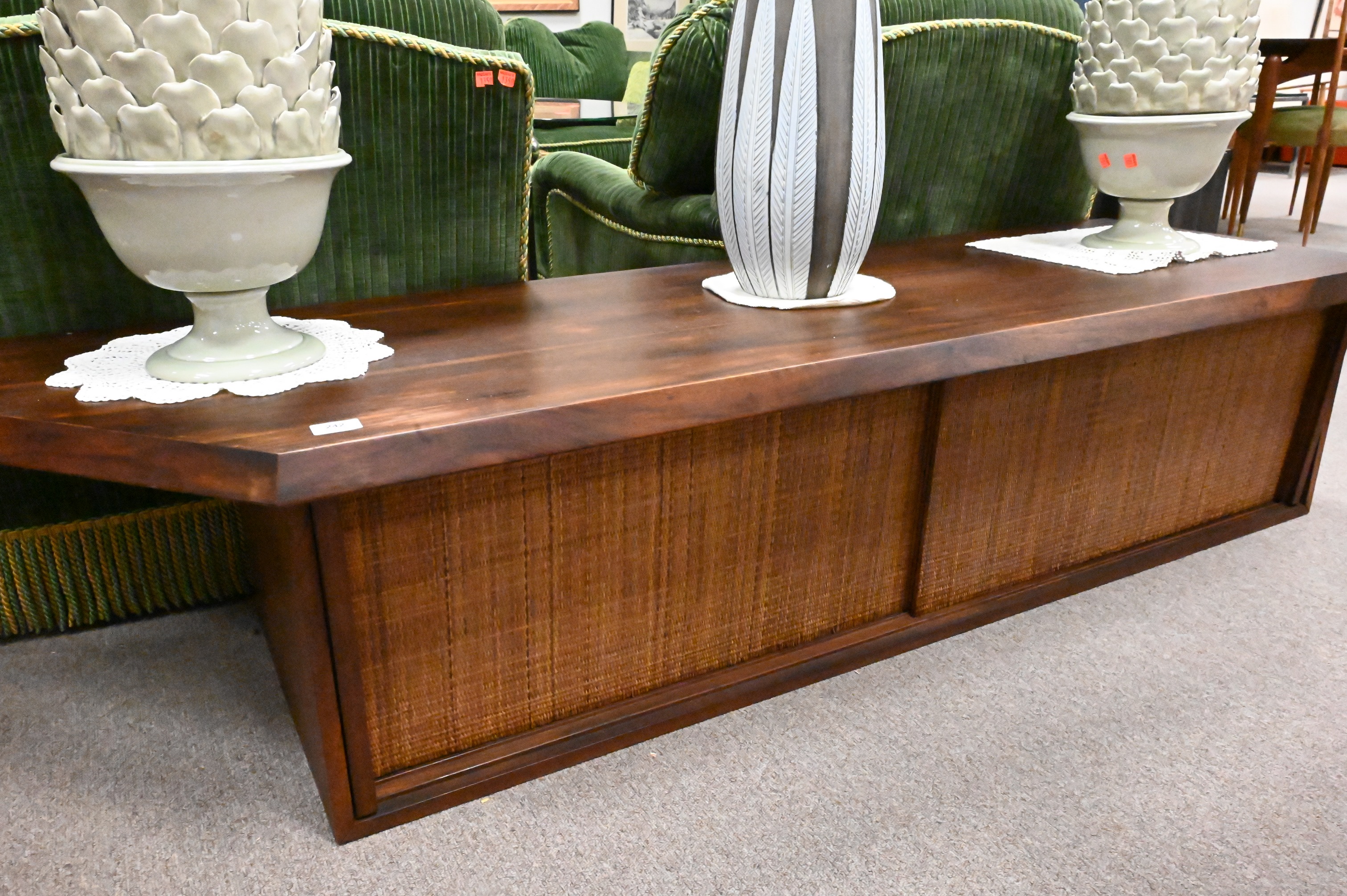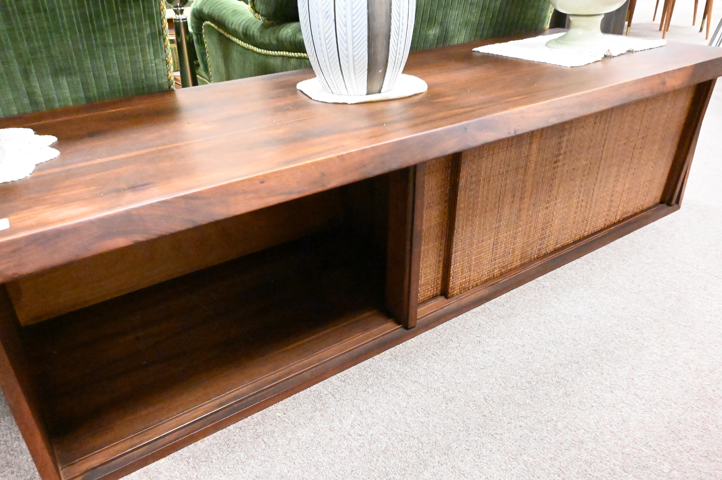 Nakashima Style Wall Shelf/Cabinet, having rush sliding doors, heigh t16 inches, length 80 inches.