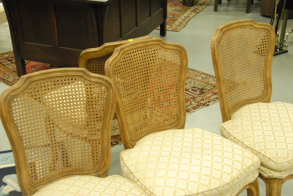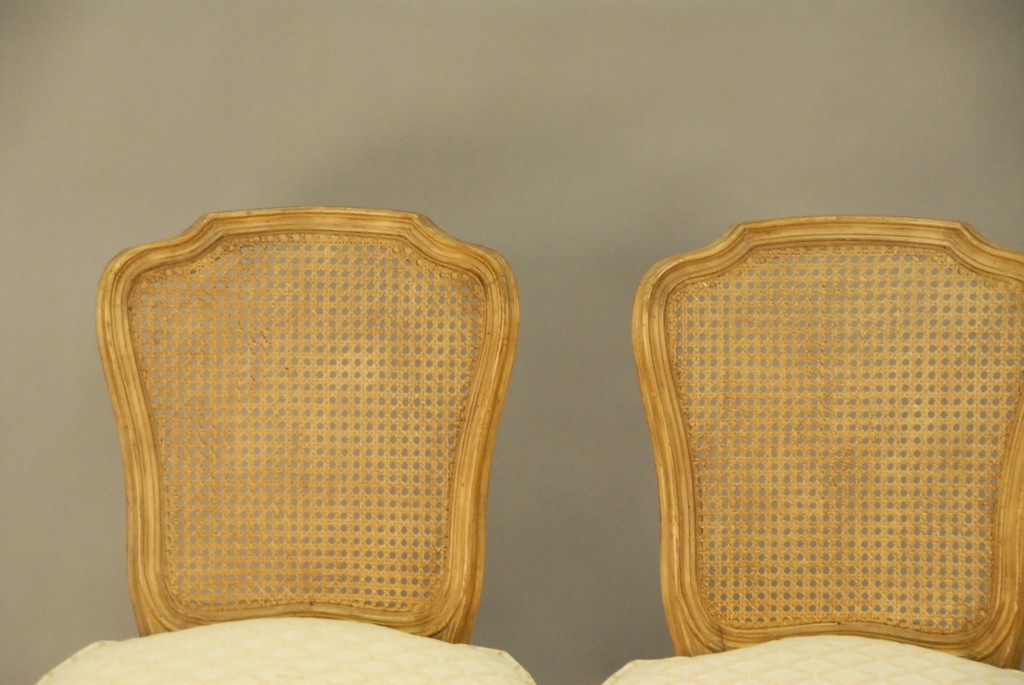 Set of six Louis XV dining chairs with upholstered seats and caned backs.