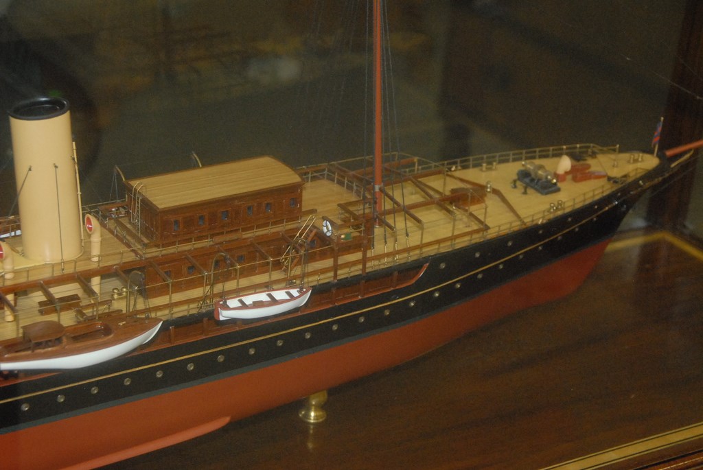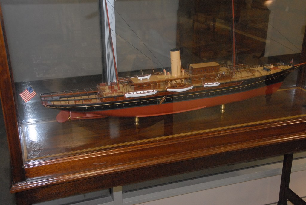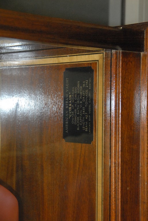 Ship model in mahogany and glass case, American Steam Yacht Corsair Lannan Ship Model Gallery Boston. ht. 57in. lg. 56in.