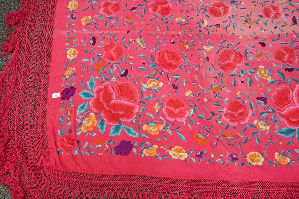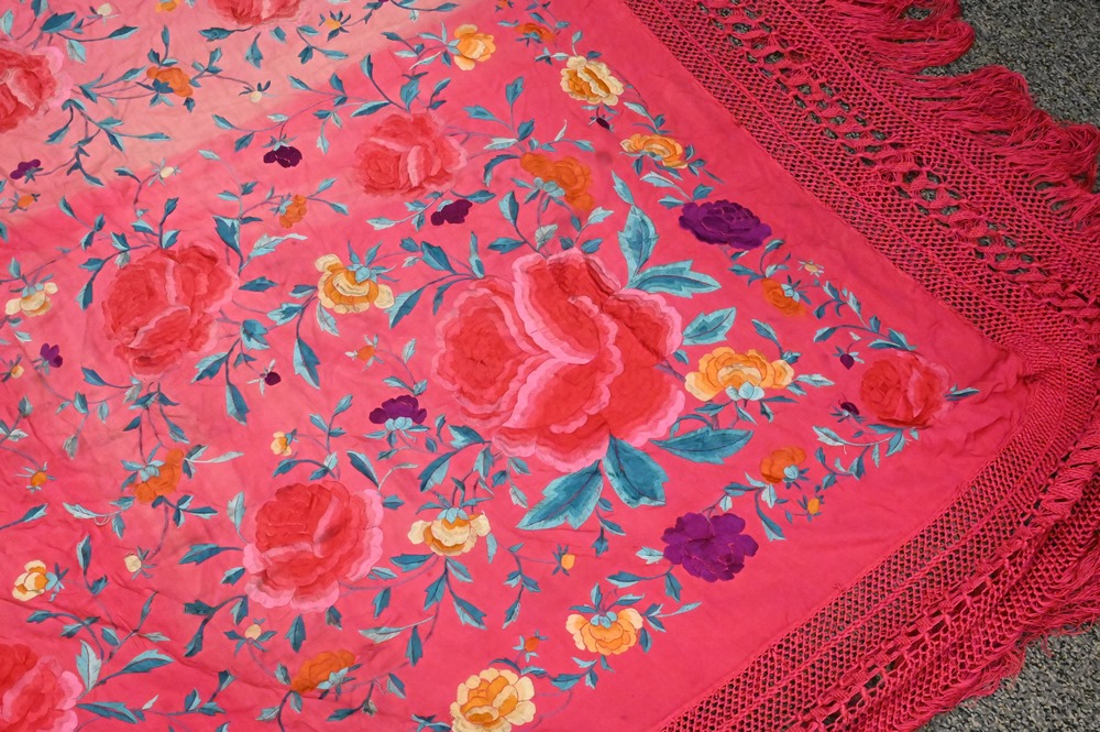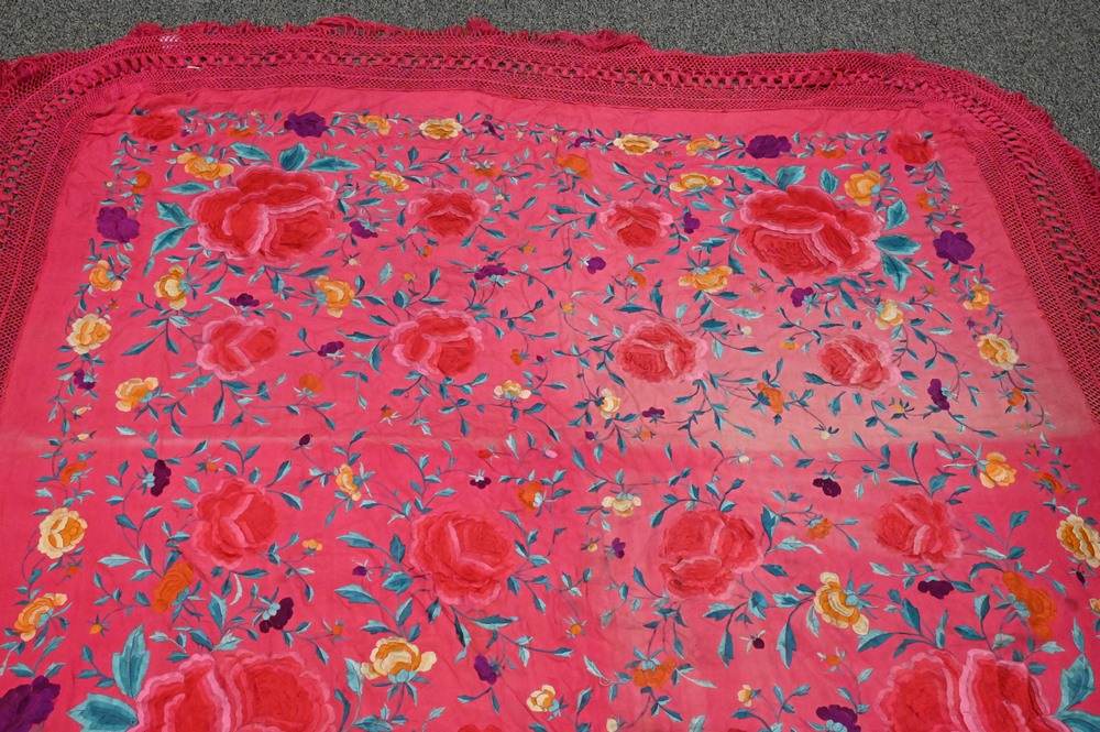 Silk Embroidered Piano Shawl, having colored flowers, largest 5′ 5″ x 5′ 9″.