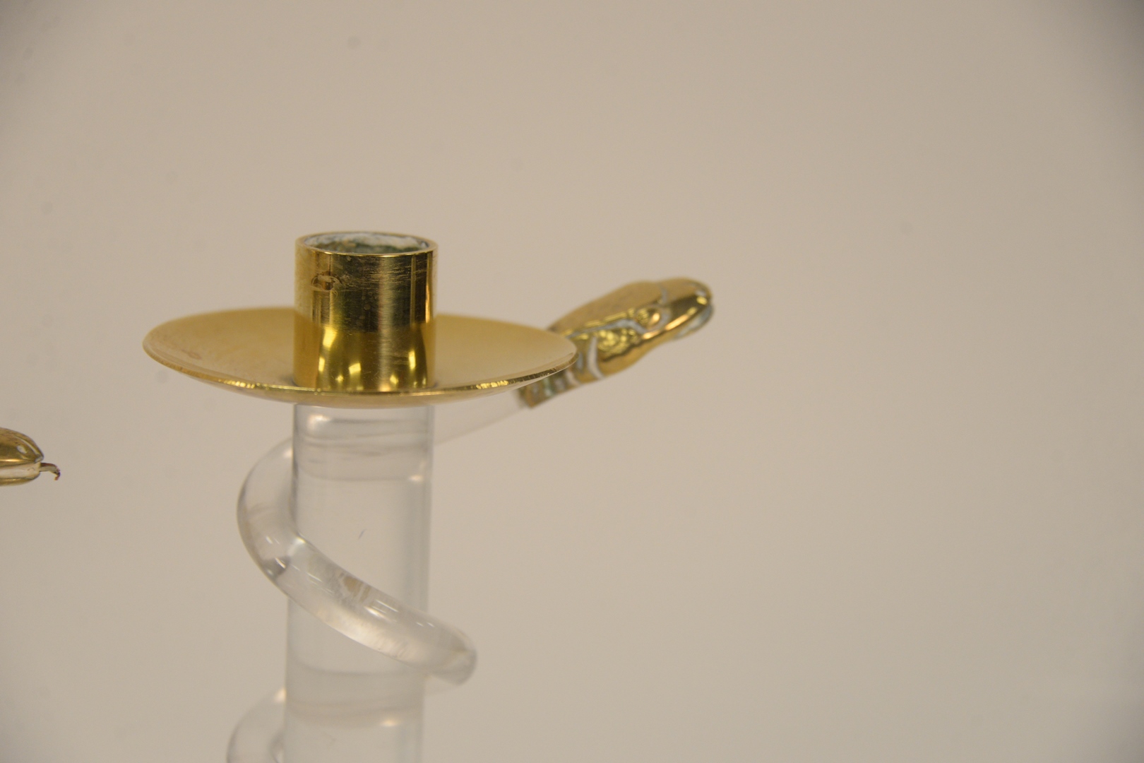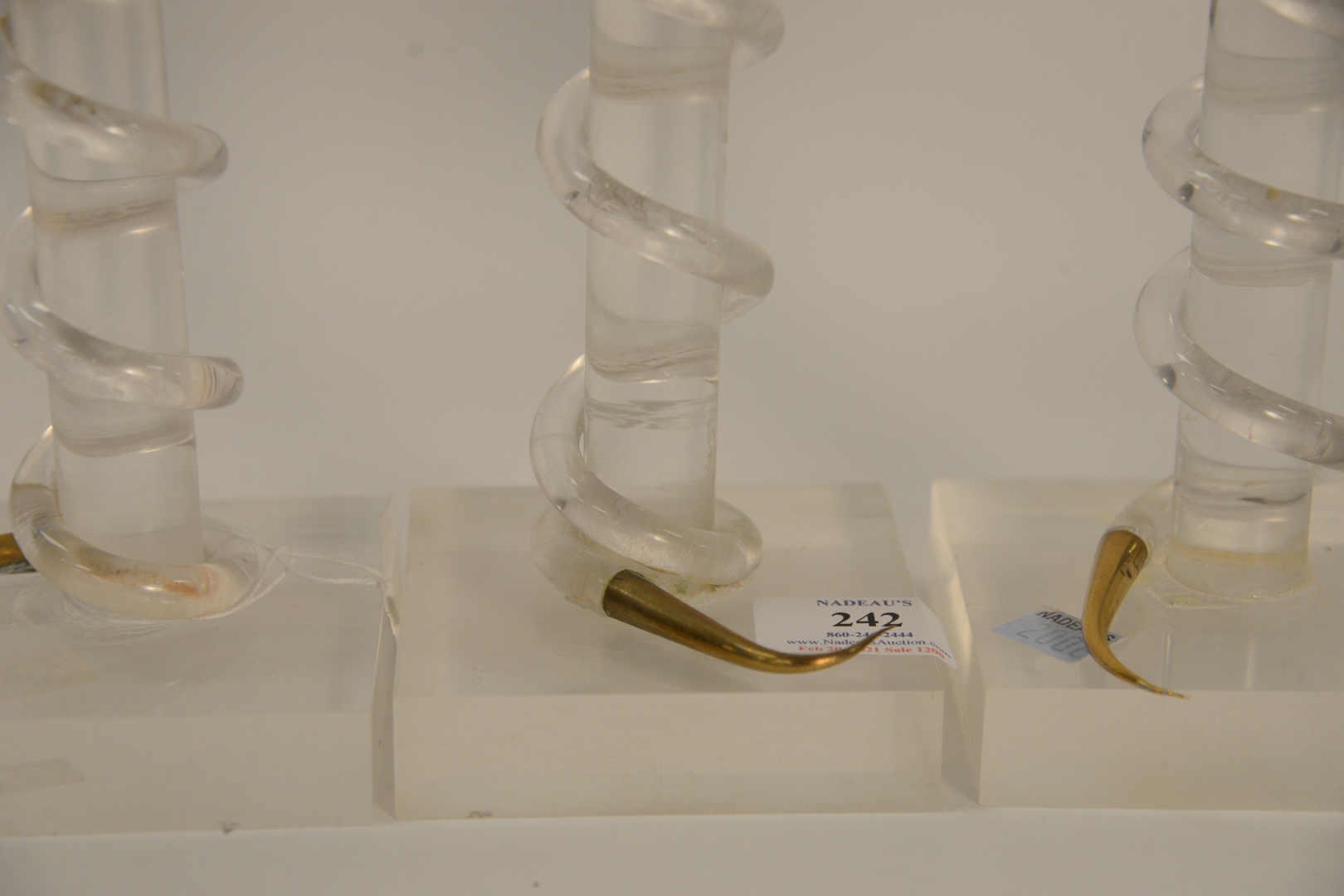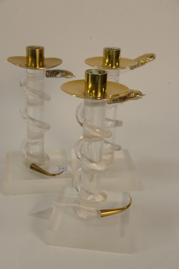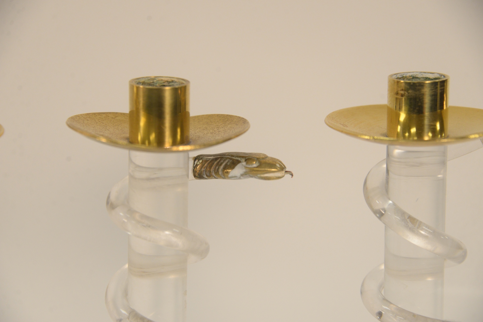 Lot 242: Three Alessandro Albrizzi Candlesticks, Lucite with snake motif, 20th Century; height 8 inches. Provenance: The Estate of Gloria Schiff, 630 Park Avenue, New York.