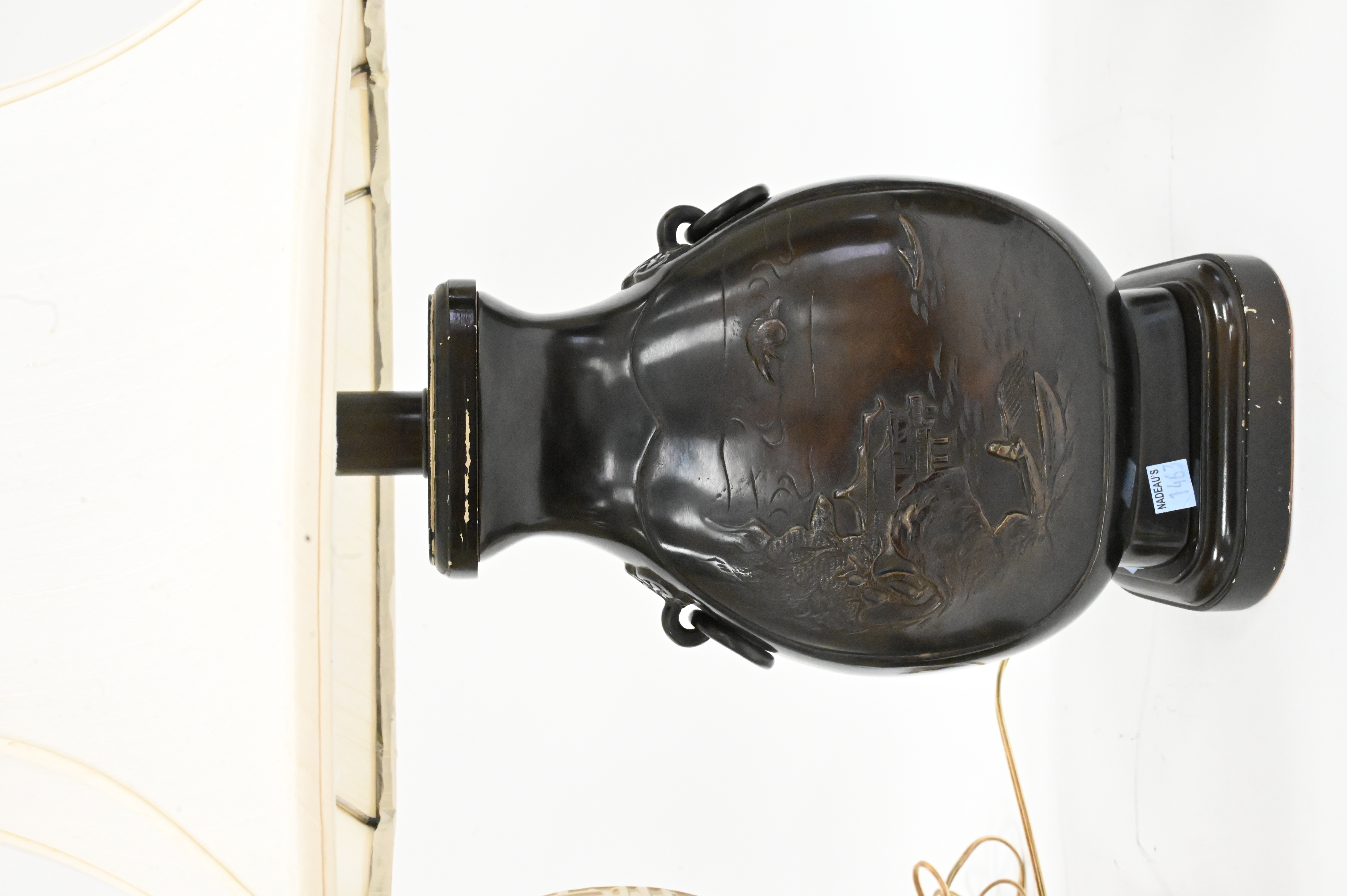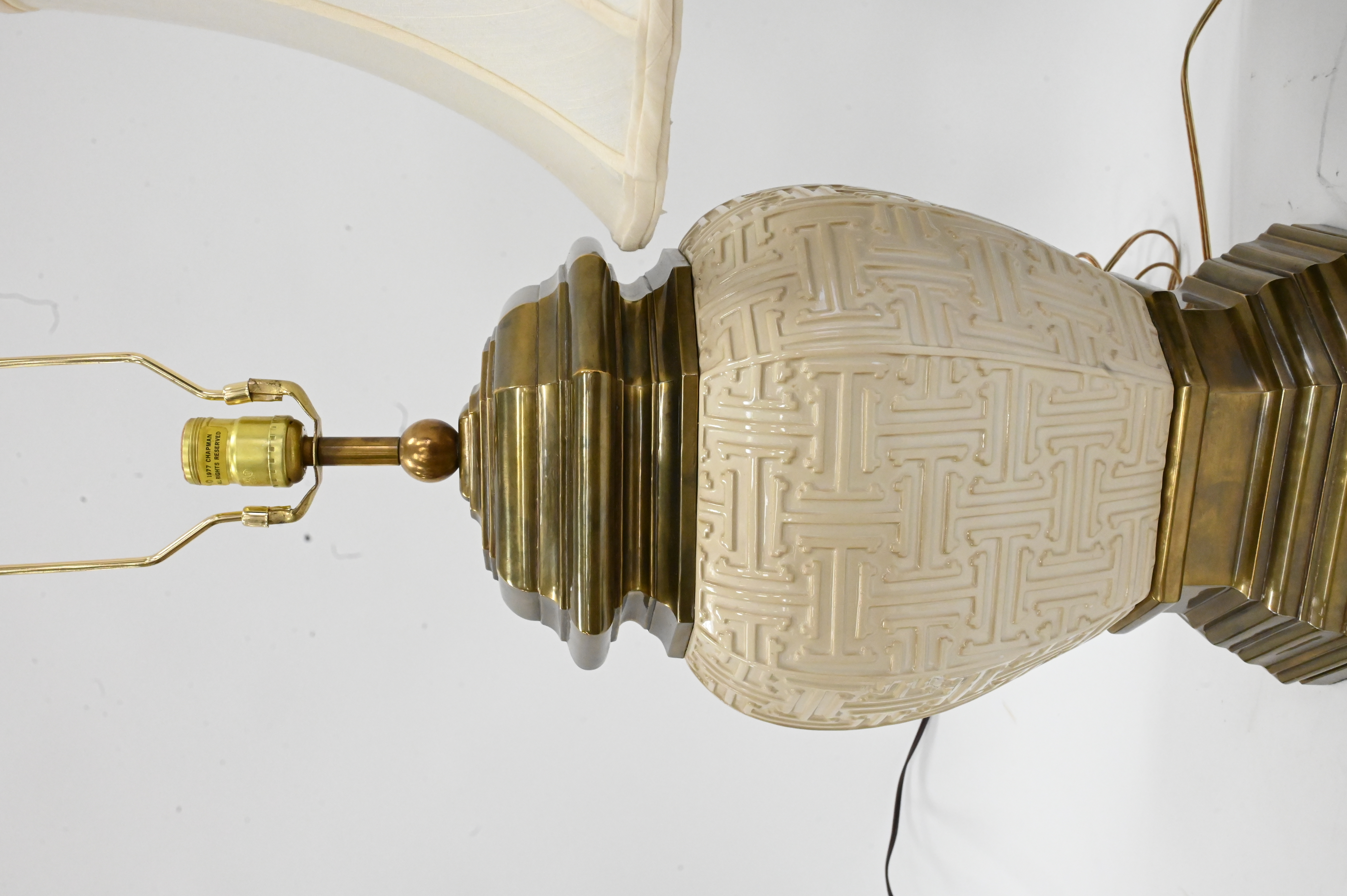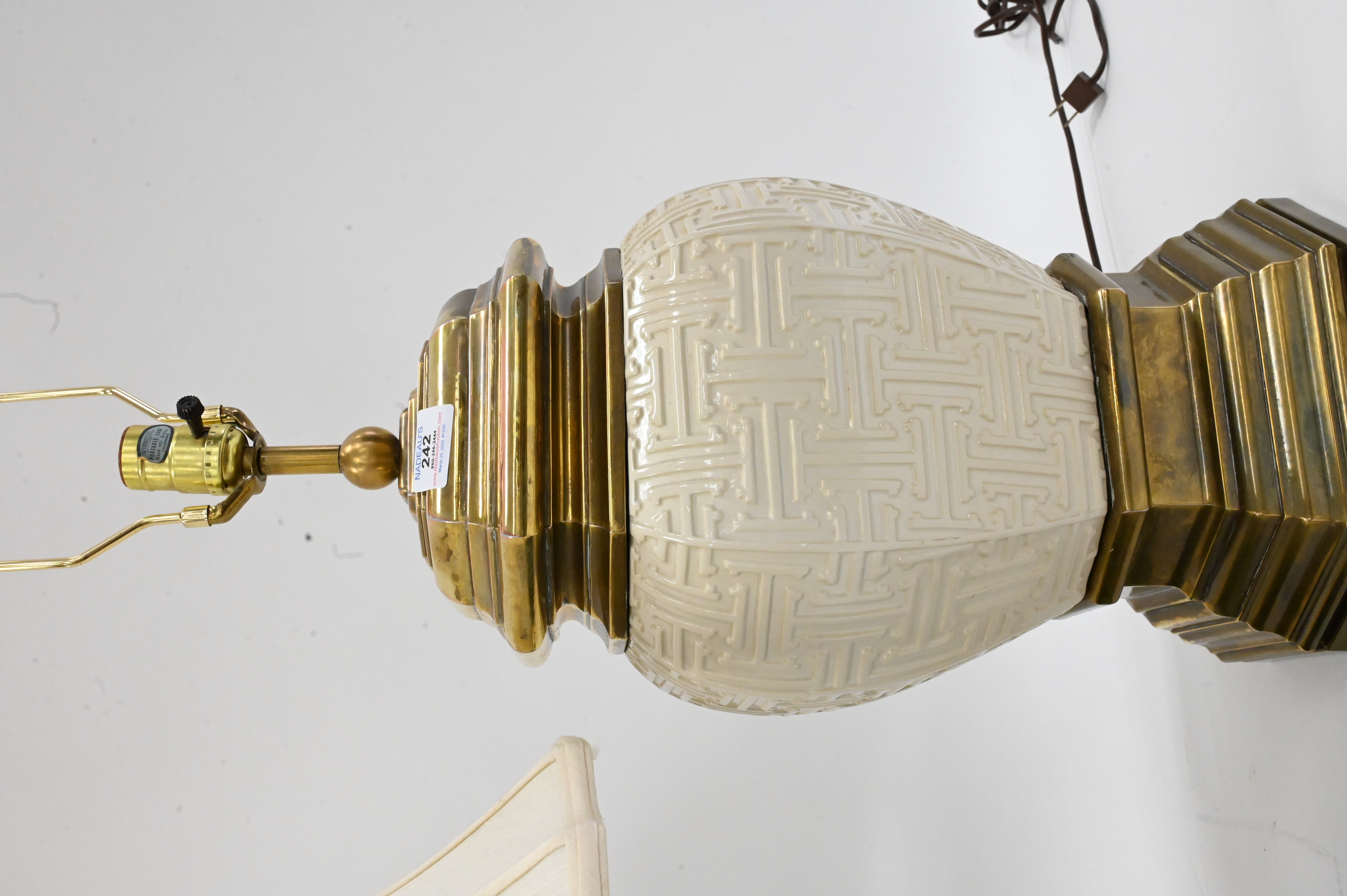Three Table Lamps, to include a pair of Chapman ceramic and brass table lamps, height 34 inches; along with an Asian inspired lamp, height 26 inches.