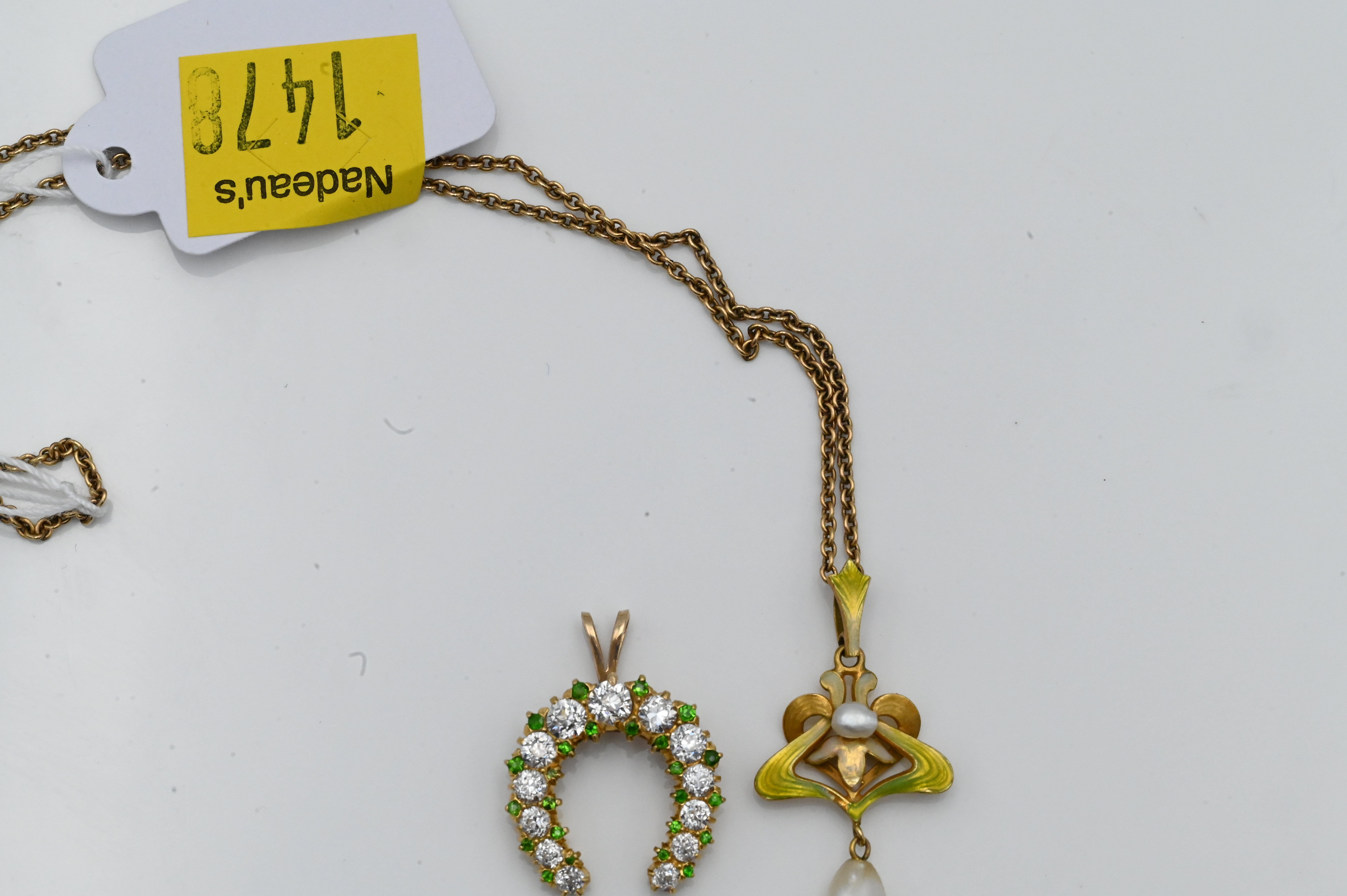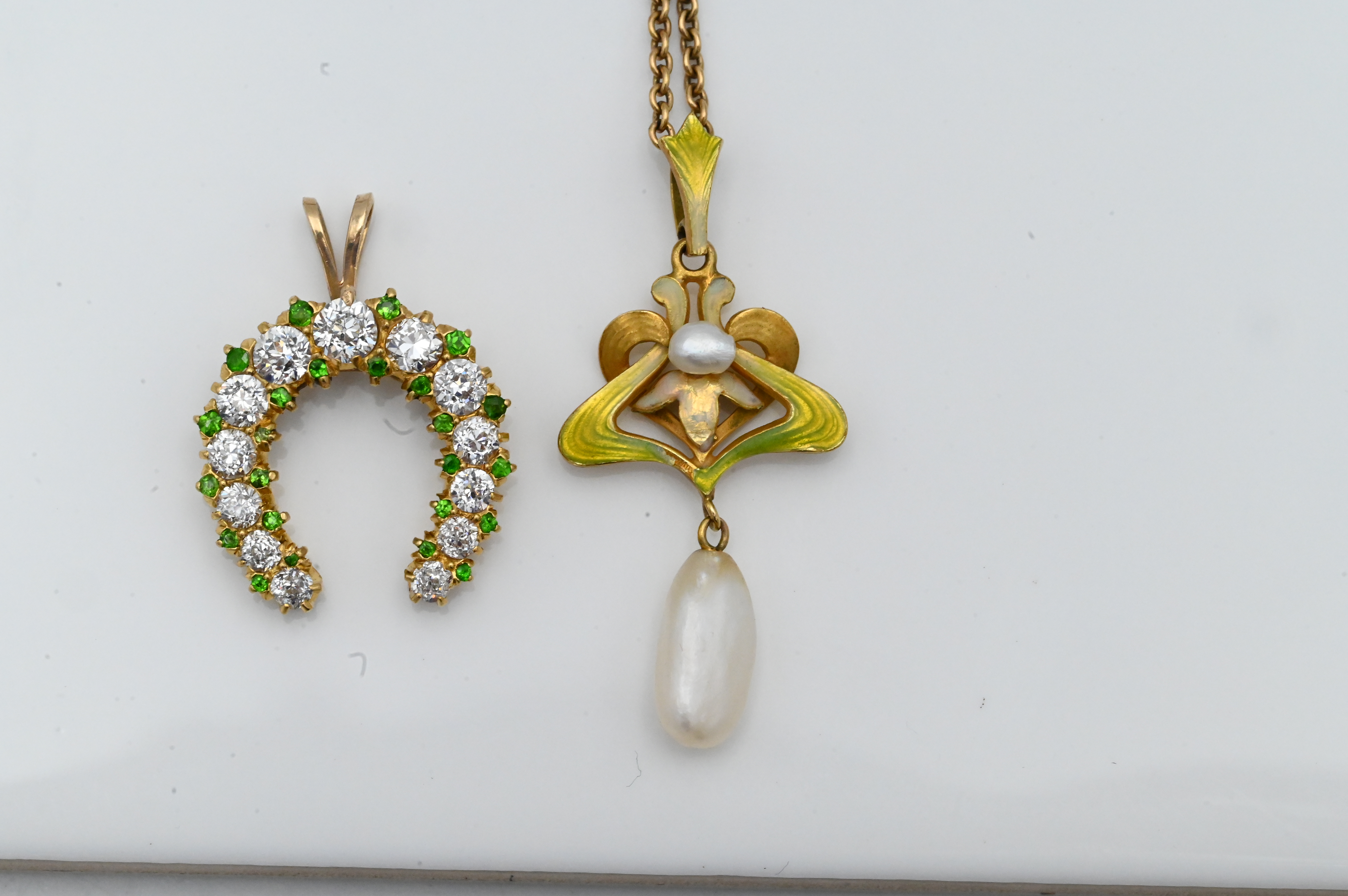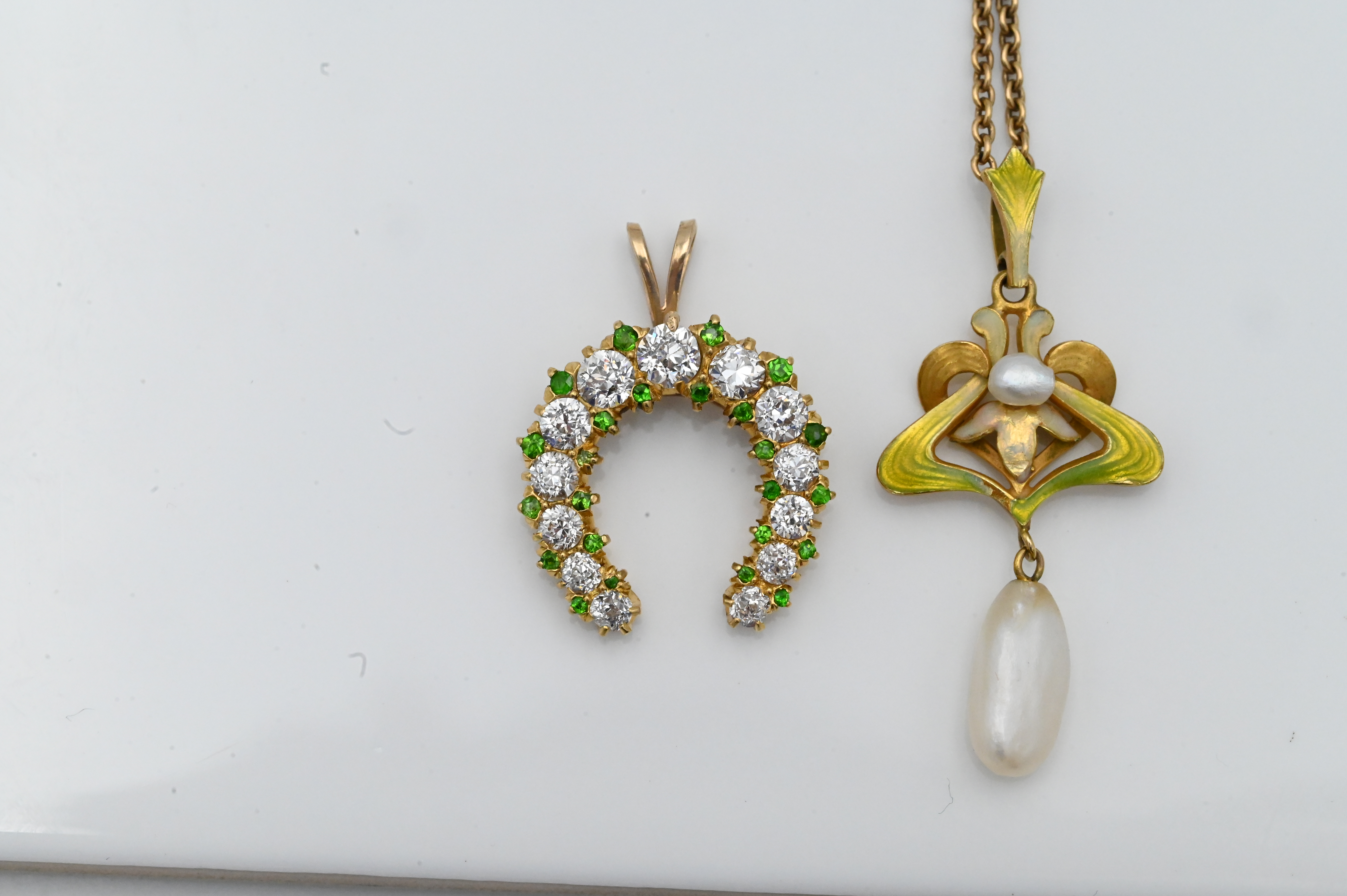 Two Piece 14 Karat Yellow Gold Horseshoe, set with 13 diamonds, small emeralds, along with chain and pendant with pearl, 8.4 grams total weight.