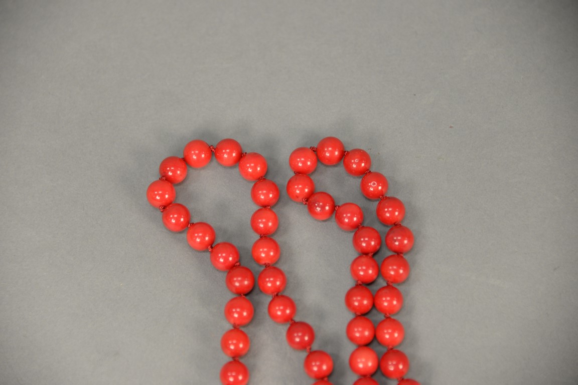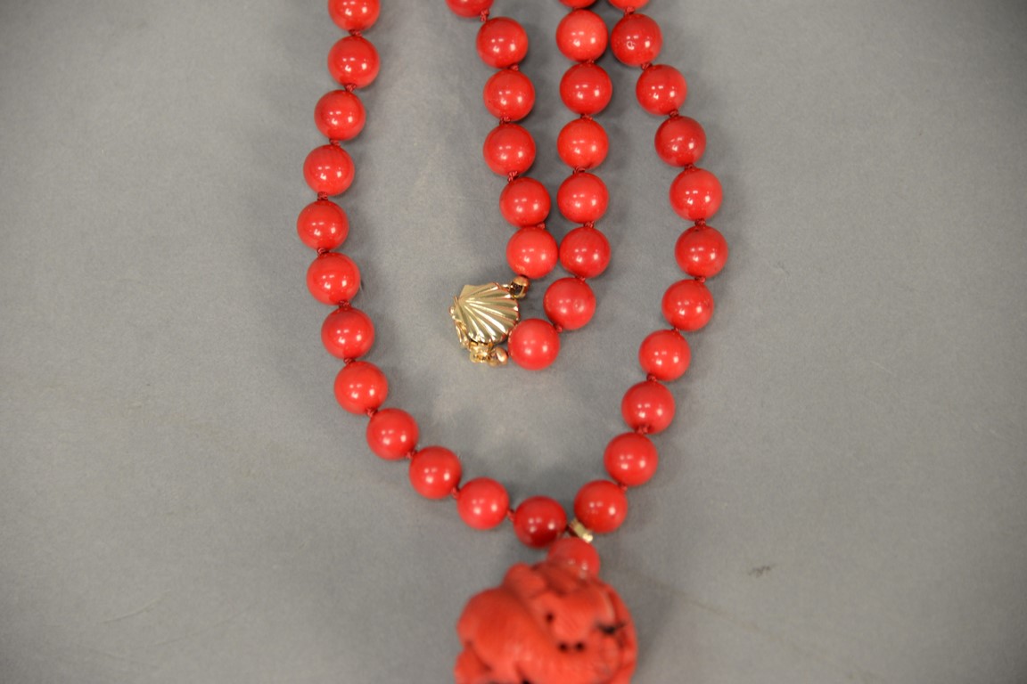 Lot 242G: Red coral beaded necklace with 14K gold clasp. beads approximately 8mm length 25 1/4 inches