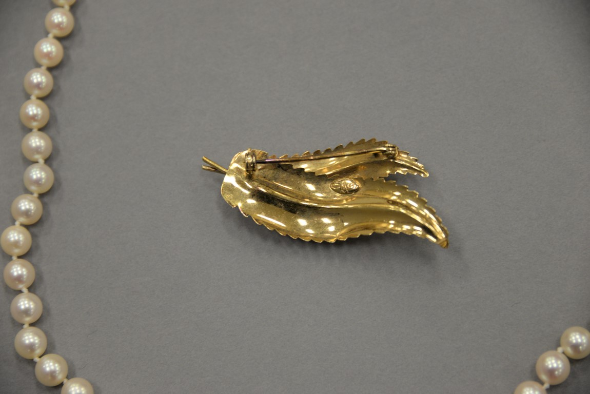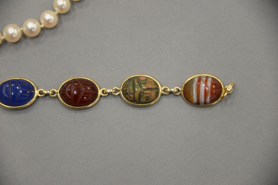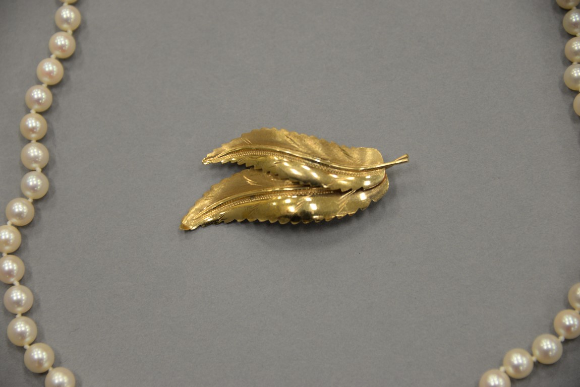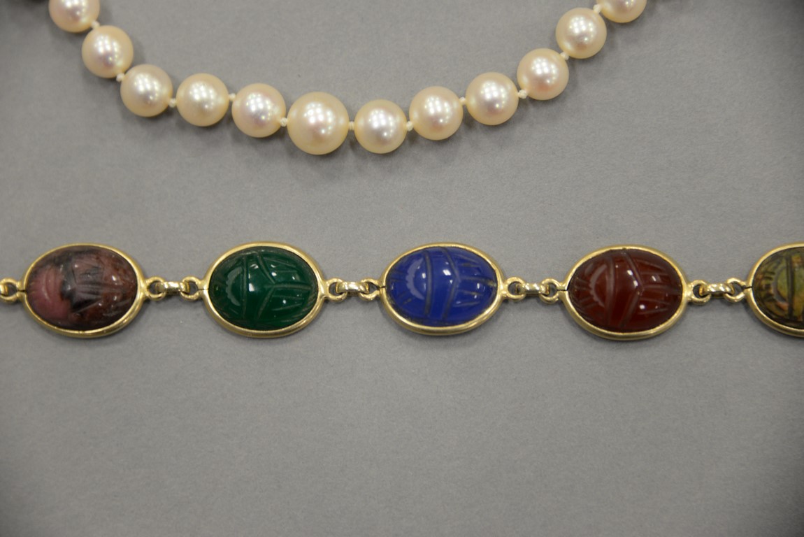 Three piece lot to include an 18K gold leaf brooch 7.4 grams, 14K bracelet set with various color scarabs, and cultured graduated pearl necklace with gold clasp. brooch: 7.4 grams bracelet: length 7 1/4 inches necklace: 5.6mm-8.7mm, 19 1/2 inches
