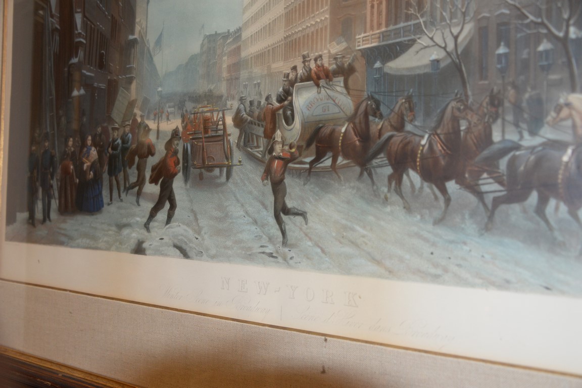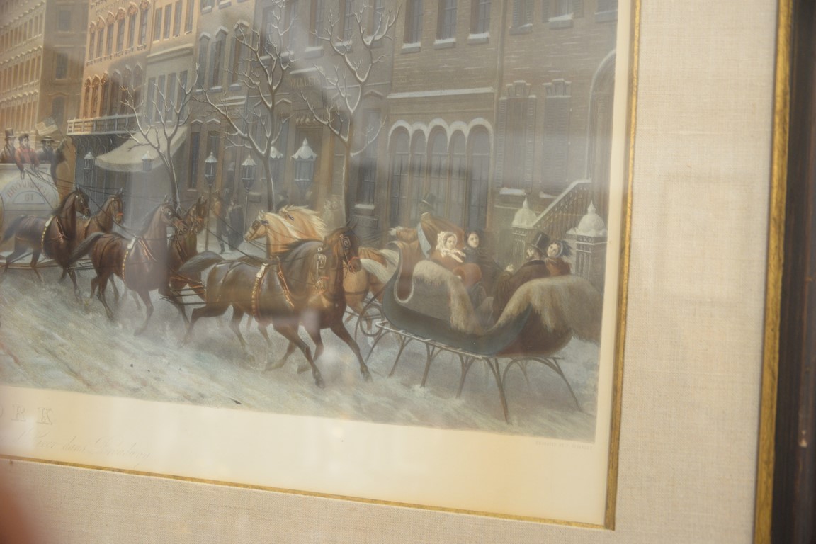 After Hippolyte-Victor Valentin Sebron 1801-1879 etching with aquatint by P. Girardet New York Winter Scene in Broadway sight size 25 1/4 x 34 1/2 Provenance: Property from Credit Suisse’s Americana Collection