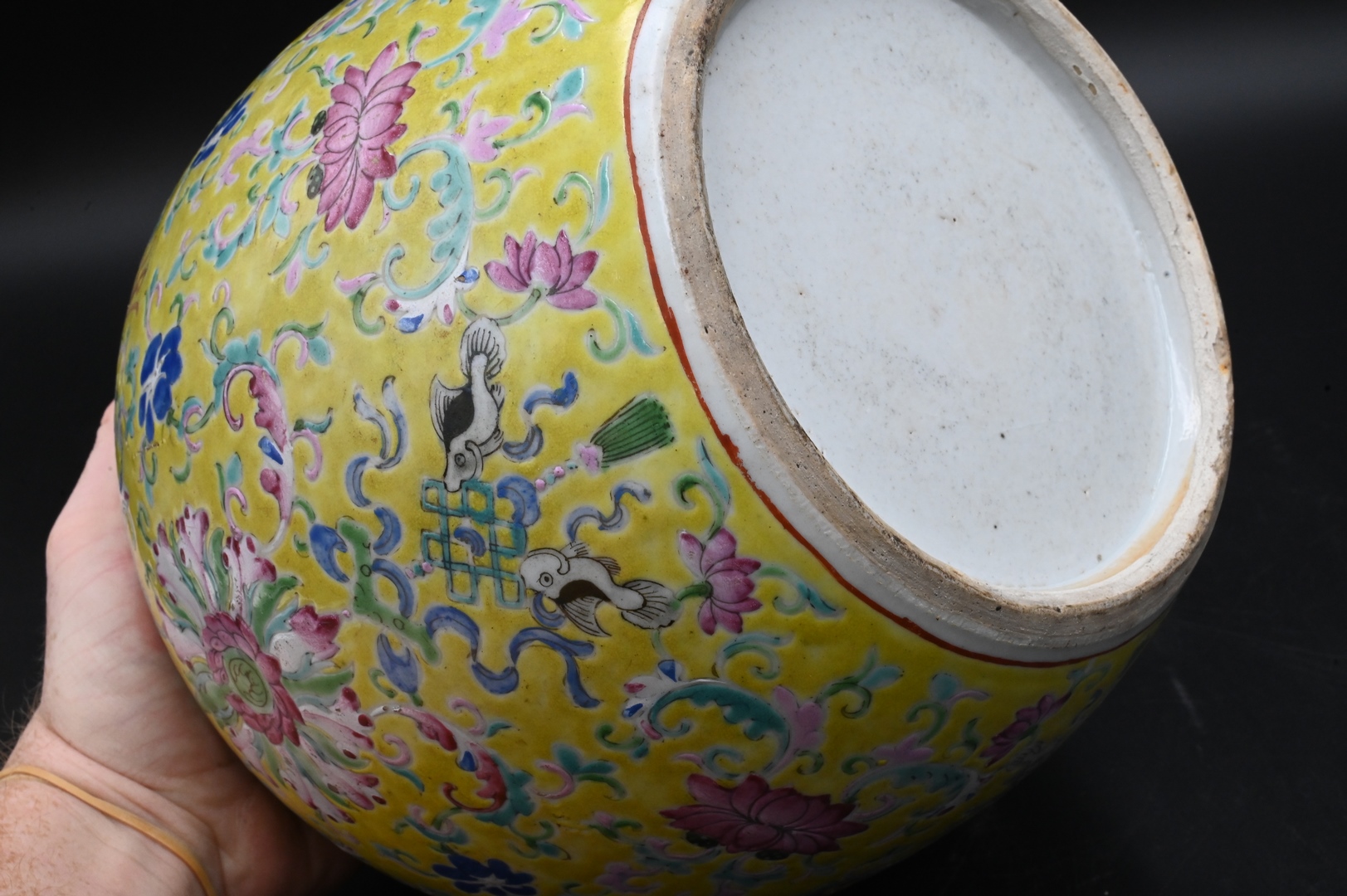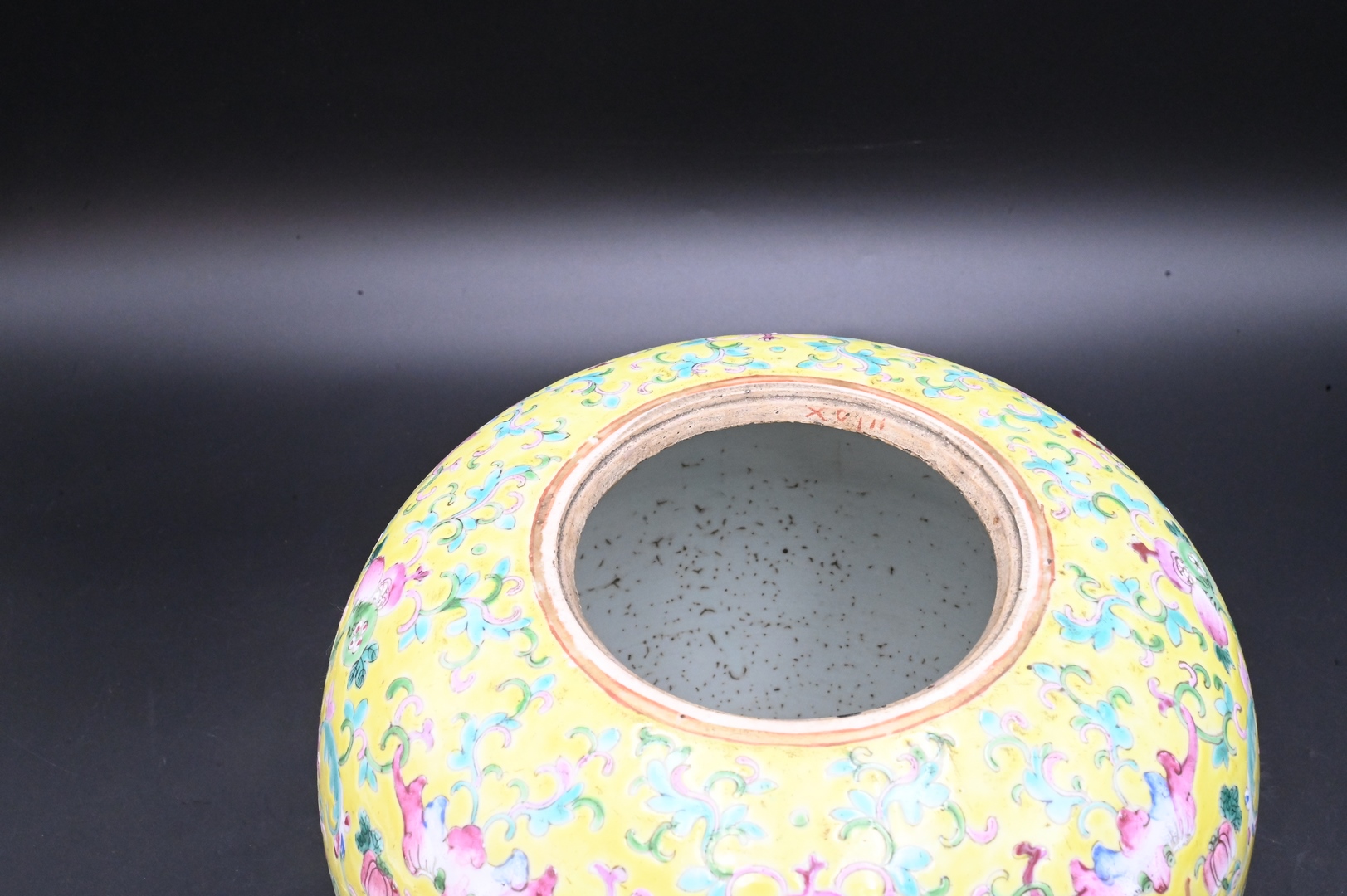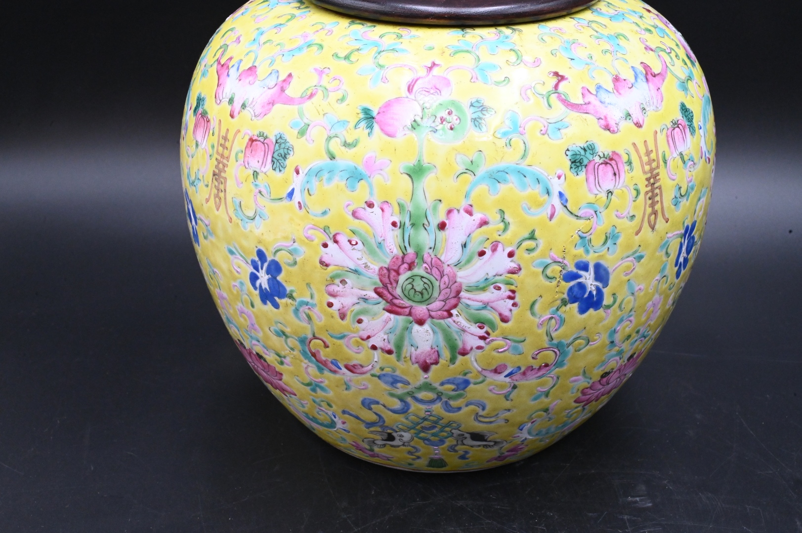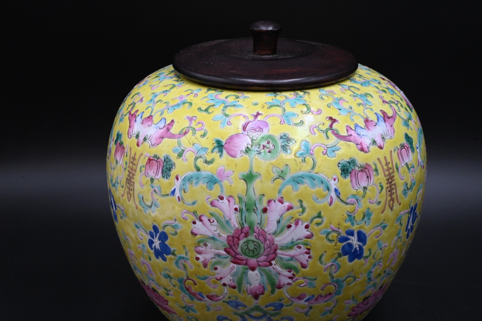 Famille Jaune Covered Melon Jar, Daoguang Period (1821-1850), heavily enameled scrolling floral decoration upon a yellow ground, unsigned with a later wooden cover, height 10 inches.