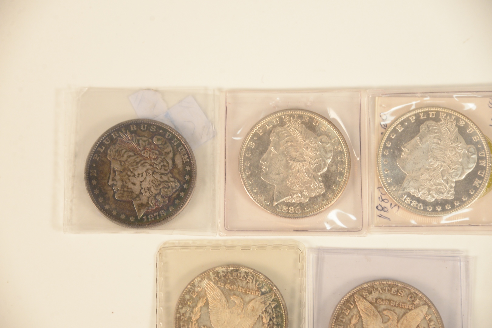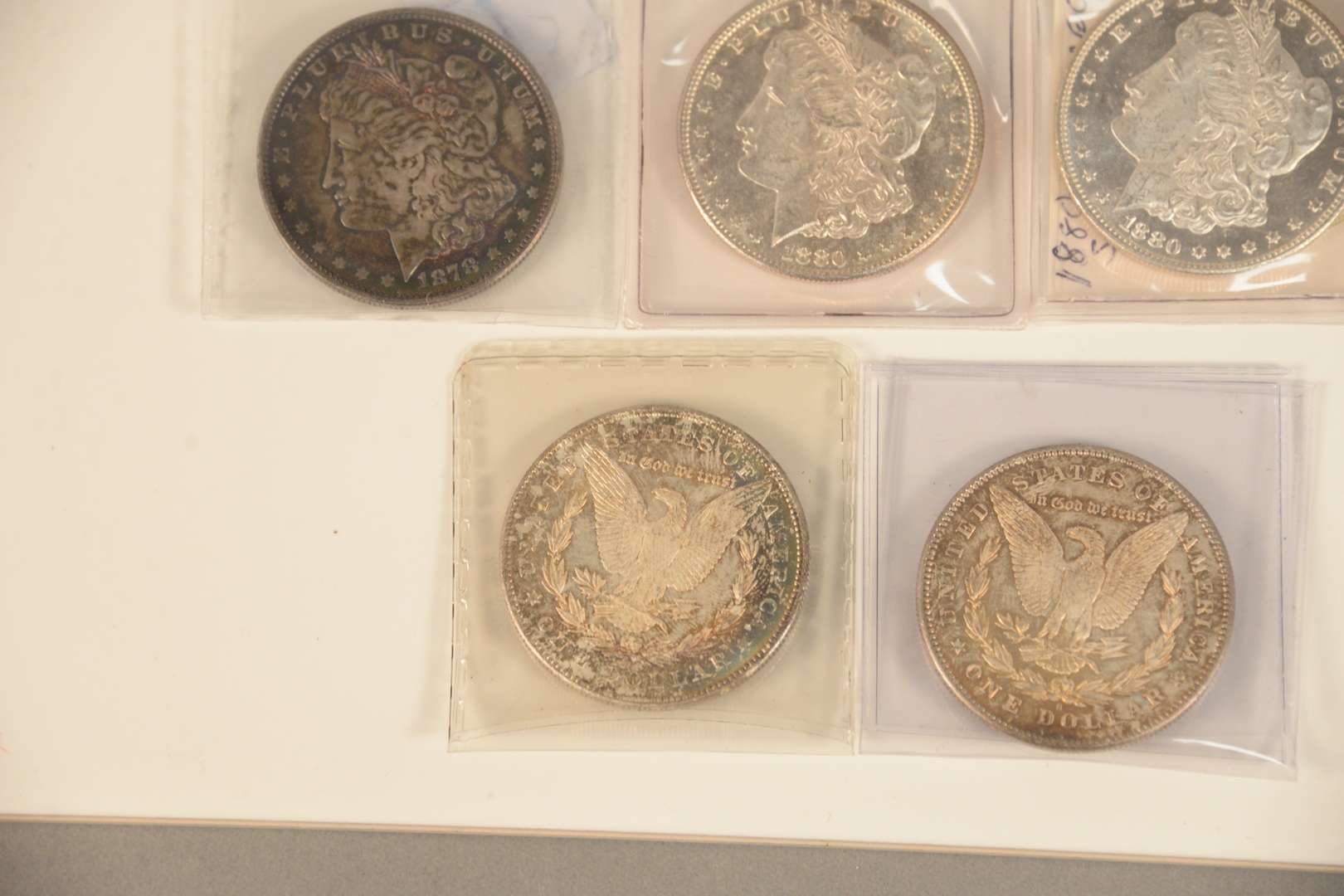 Five silver dollars all choice B.U., 2 – 1878 – S and 2 – 1880 – S, 1878.