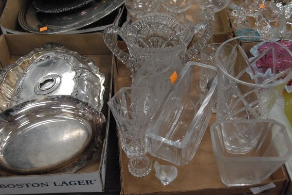 Four box lots including two box lots of silverplate and two box lots of glass and crystal.