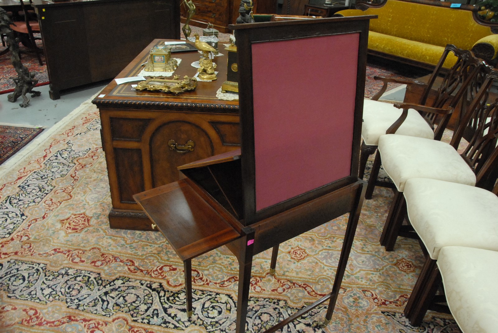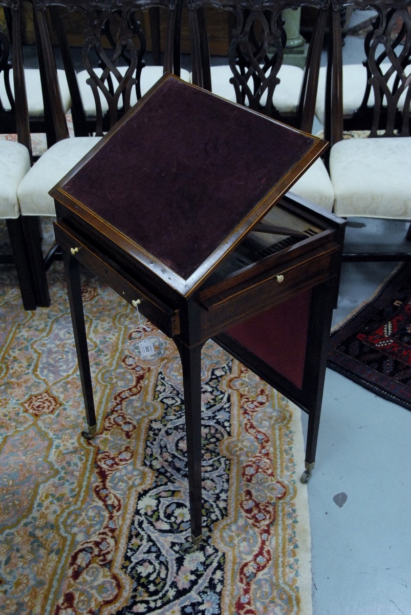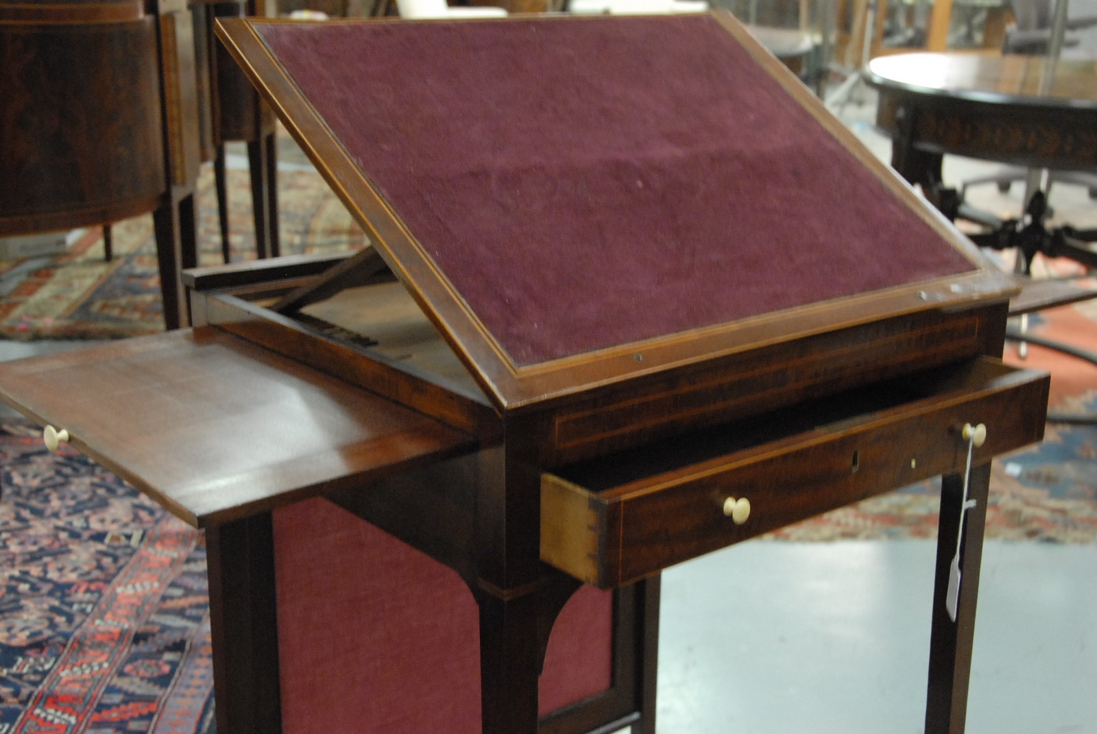 Lot 243: George IV mahogany work table with two slides, one drawer with tilting felt top. ht. 31 in. wd. 20 in. dp 16 1/2 in.