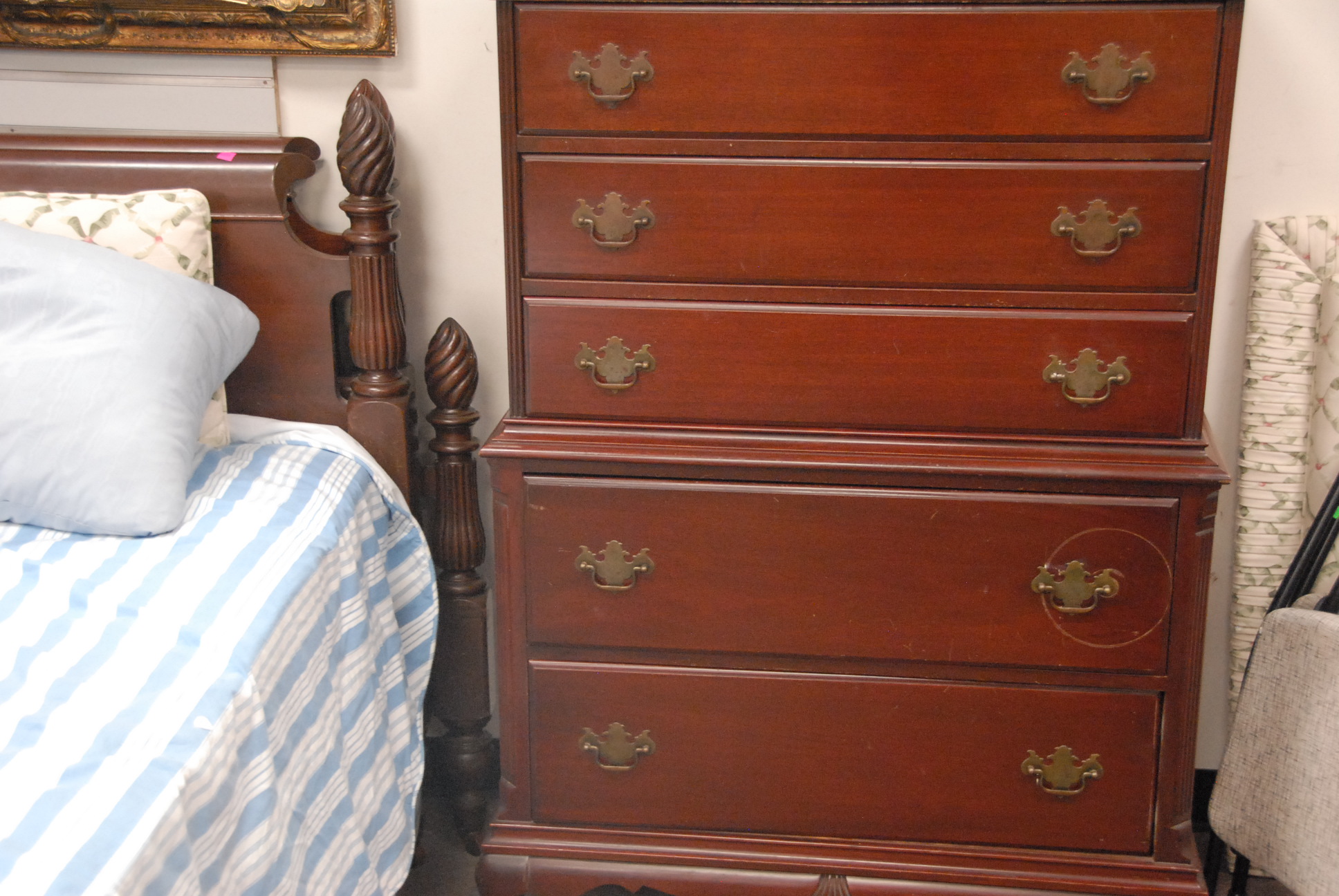 Group lot of mahogany furniture including two tall chests and pair of twin beds.