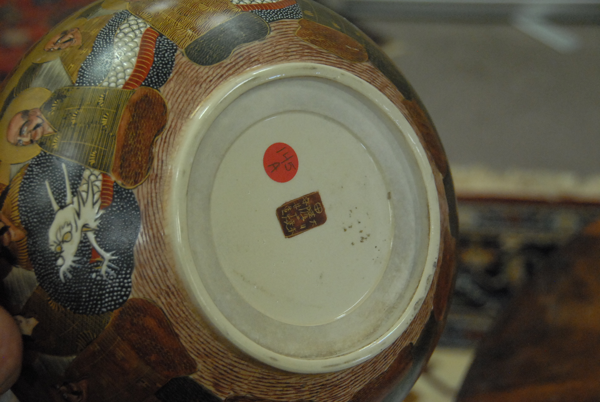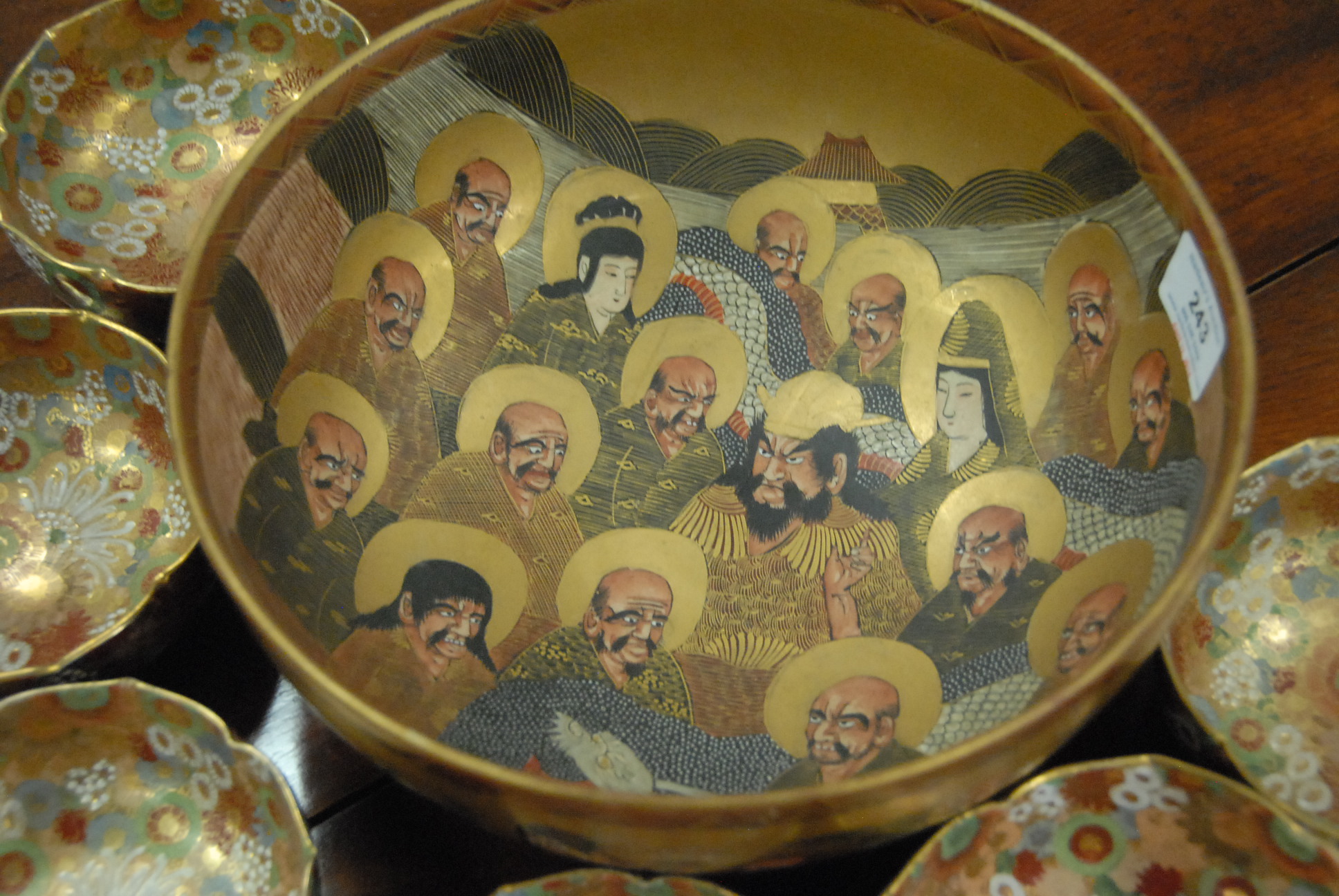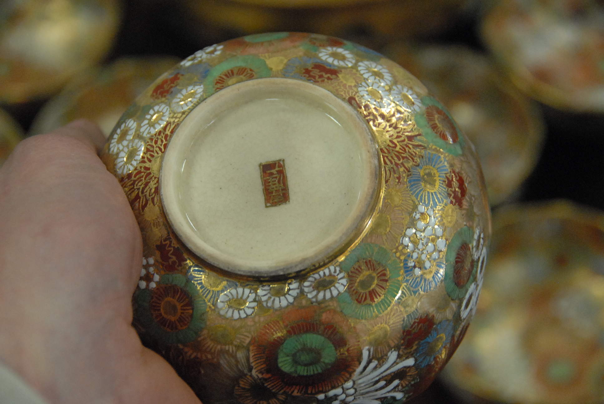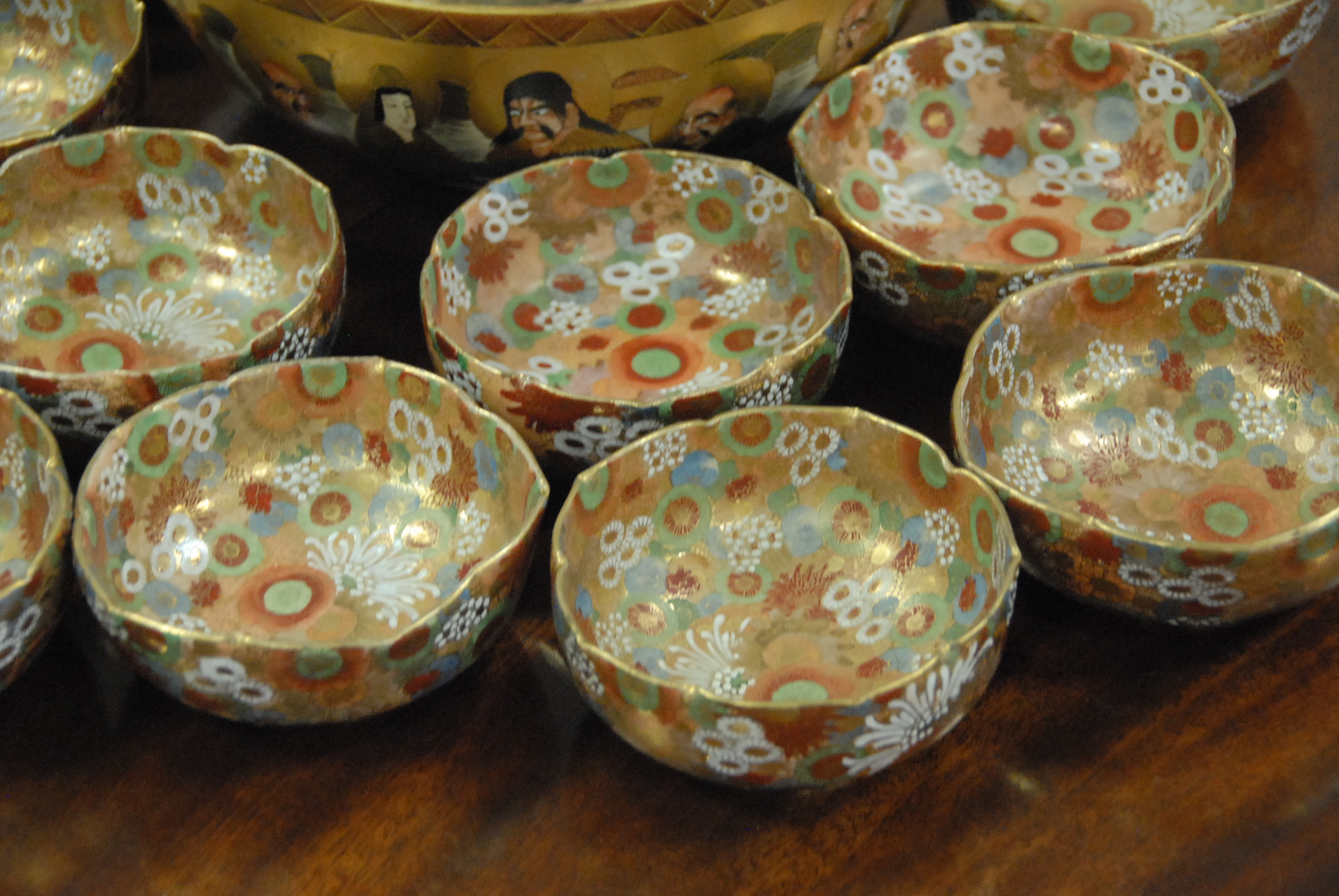 Lot 243: Group of Satsuma to include a scholar’s bowl with mark on bottom and set of eleven small flower bowls.
