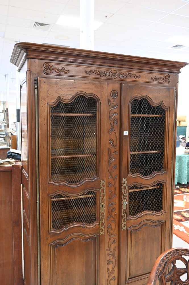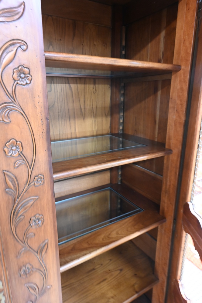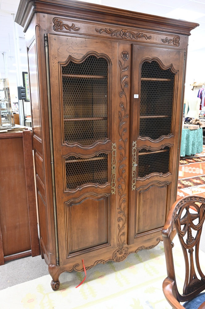 Henredon Contemporary Louis XV Style Cabinet, having molded edge top over pair of grillwork doors, raised on cabriole legs, interior with shelves having glass, height 79 inches, width 48 inches.