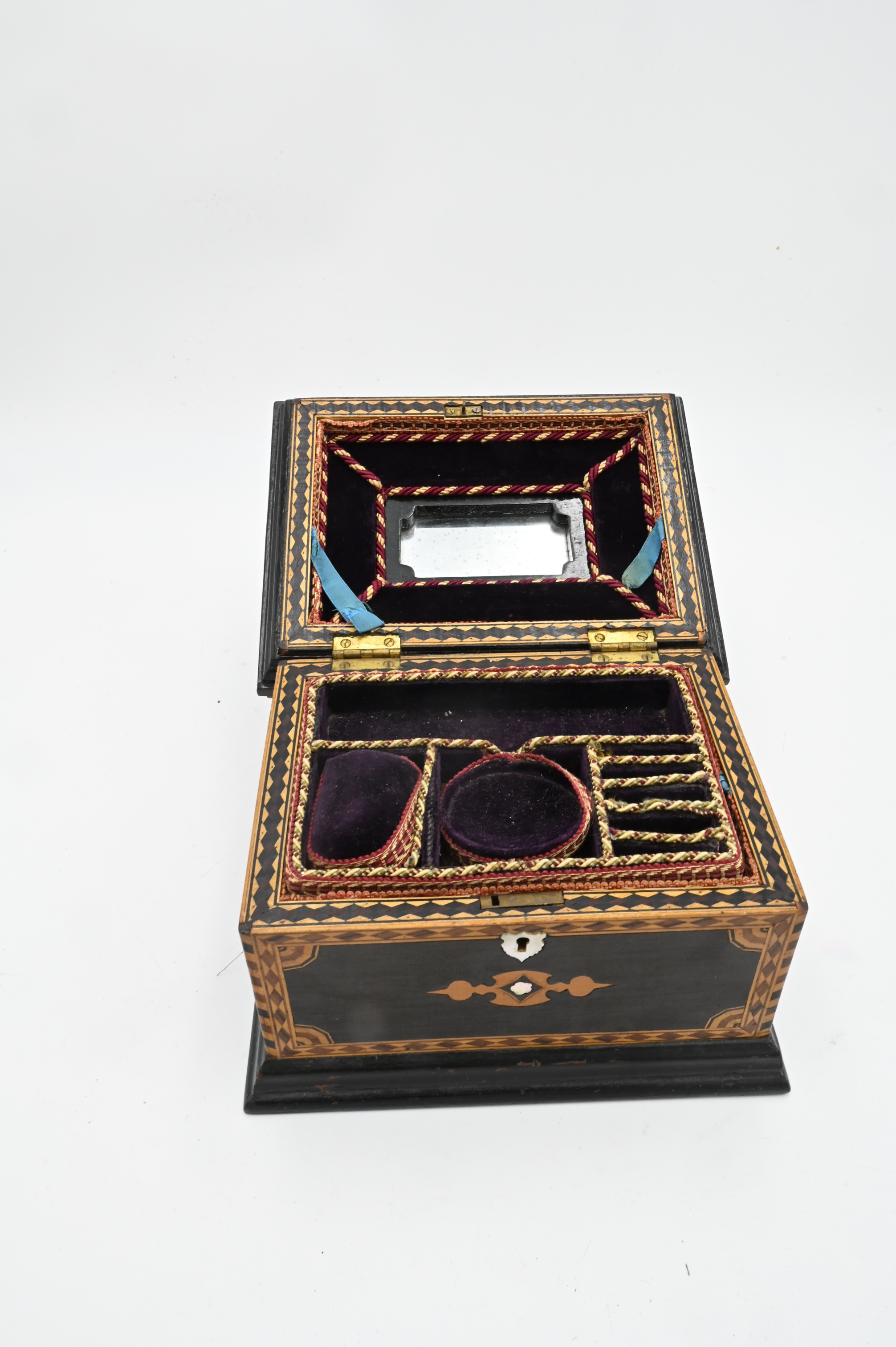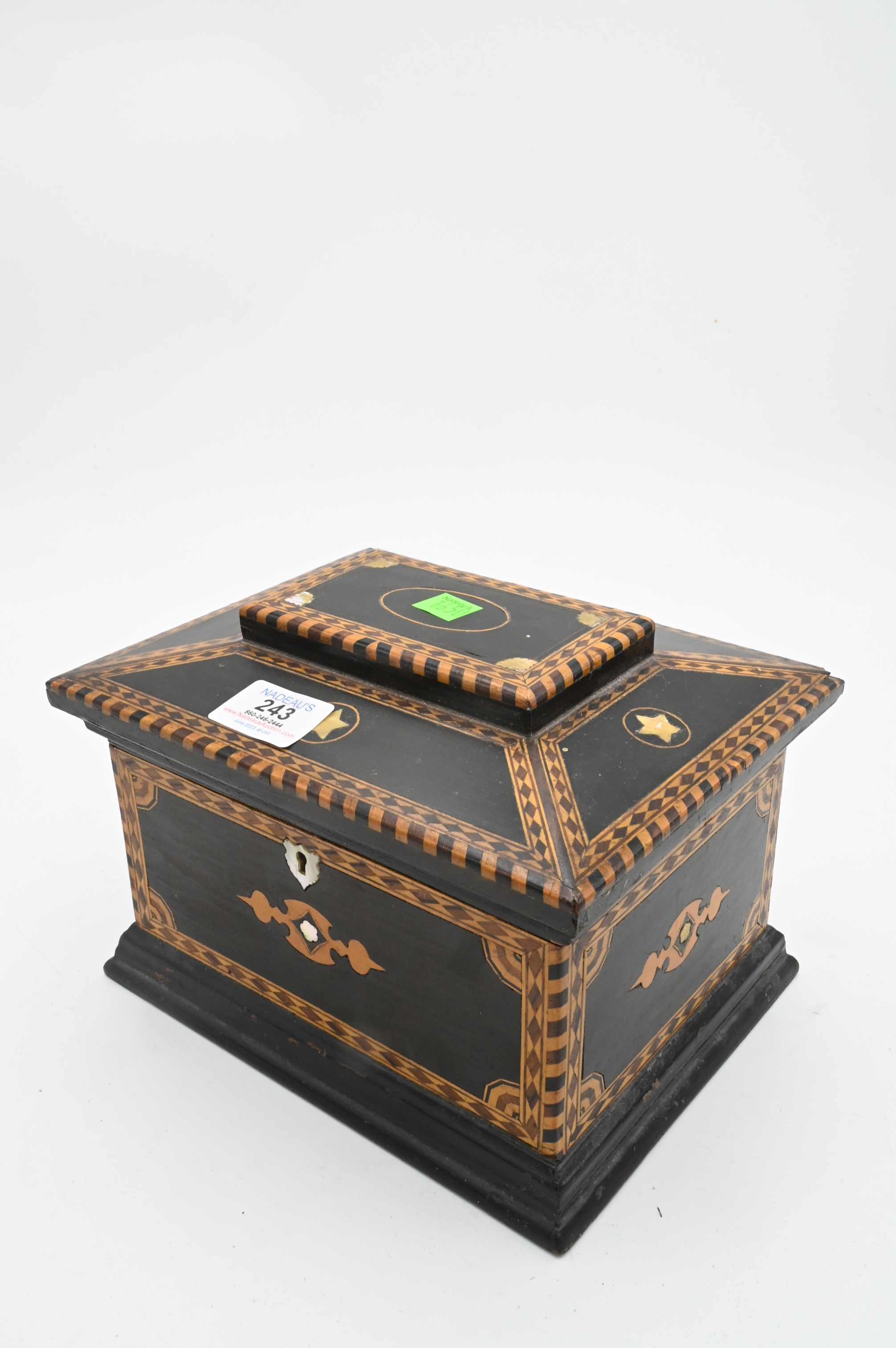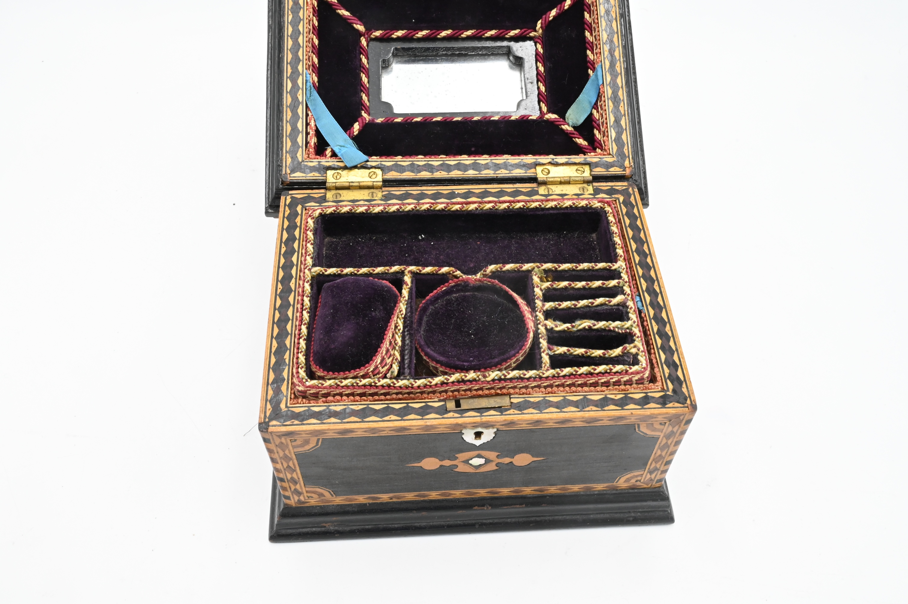 Inlaid Jewelry Box, having fitted custom interior, height 6 inches, top 7 1/4″ x 9 1/4″