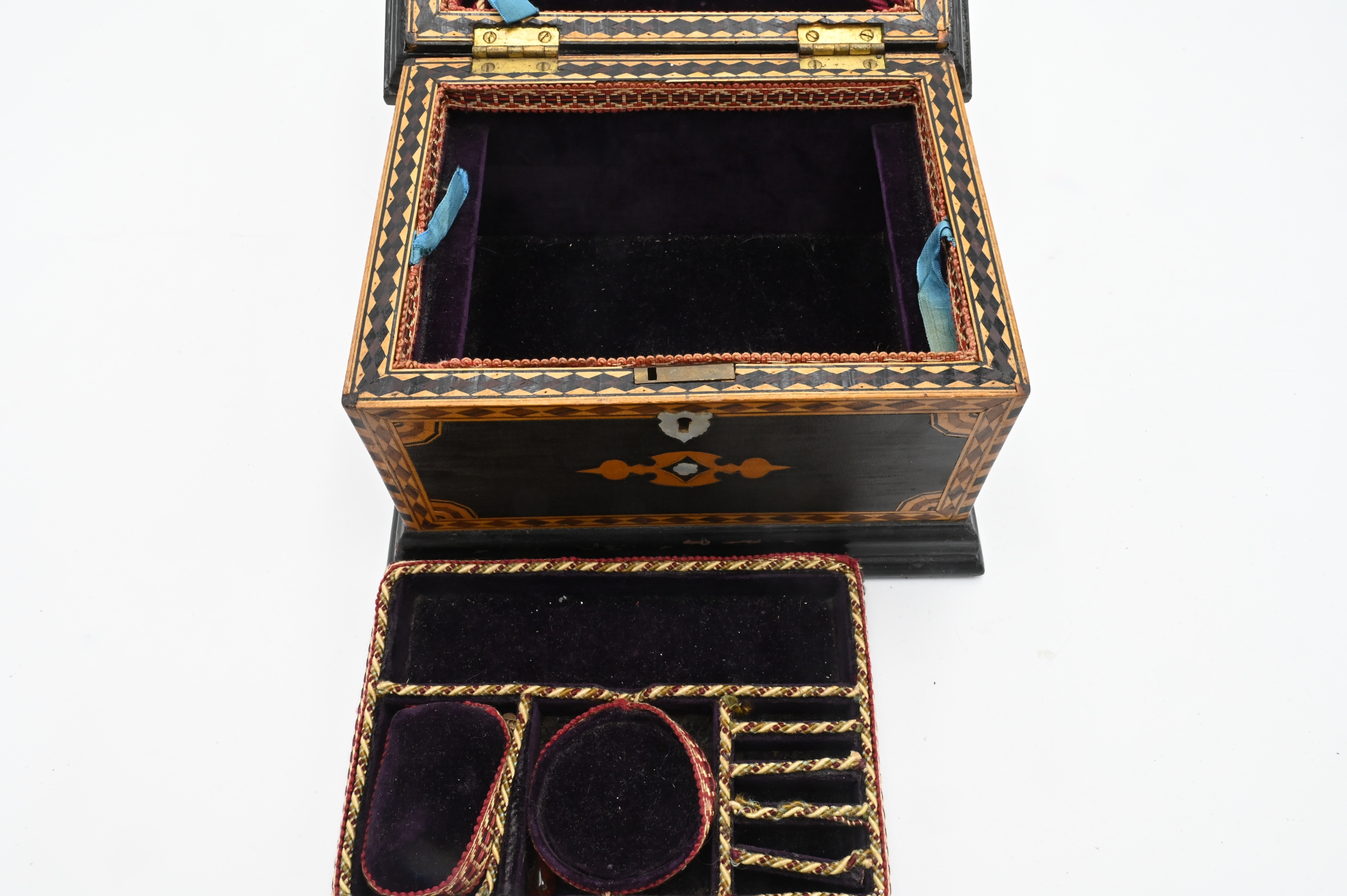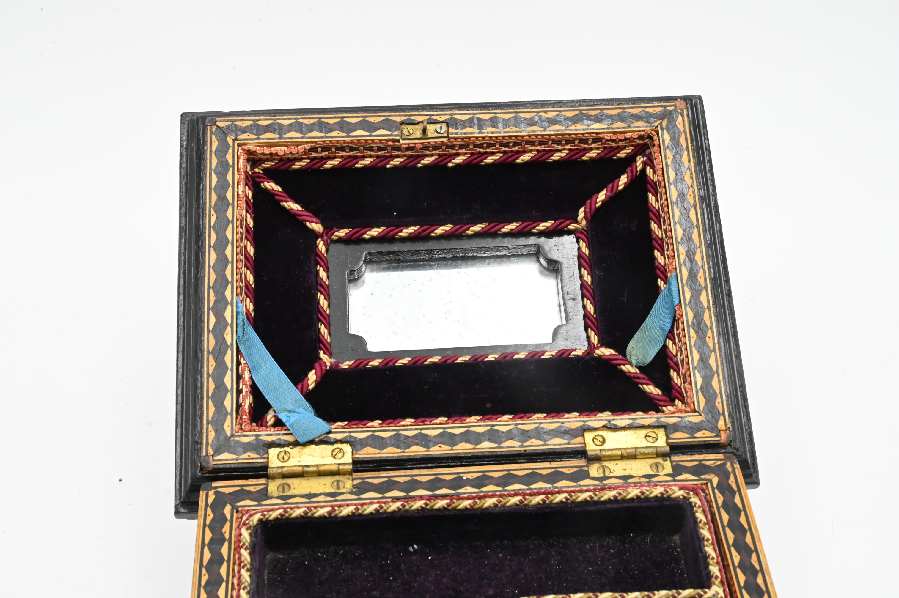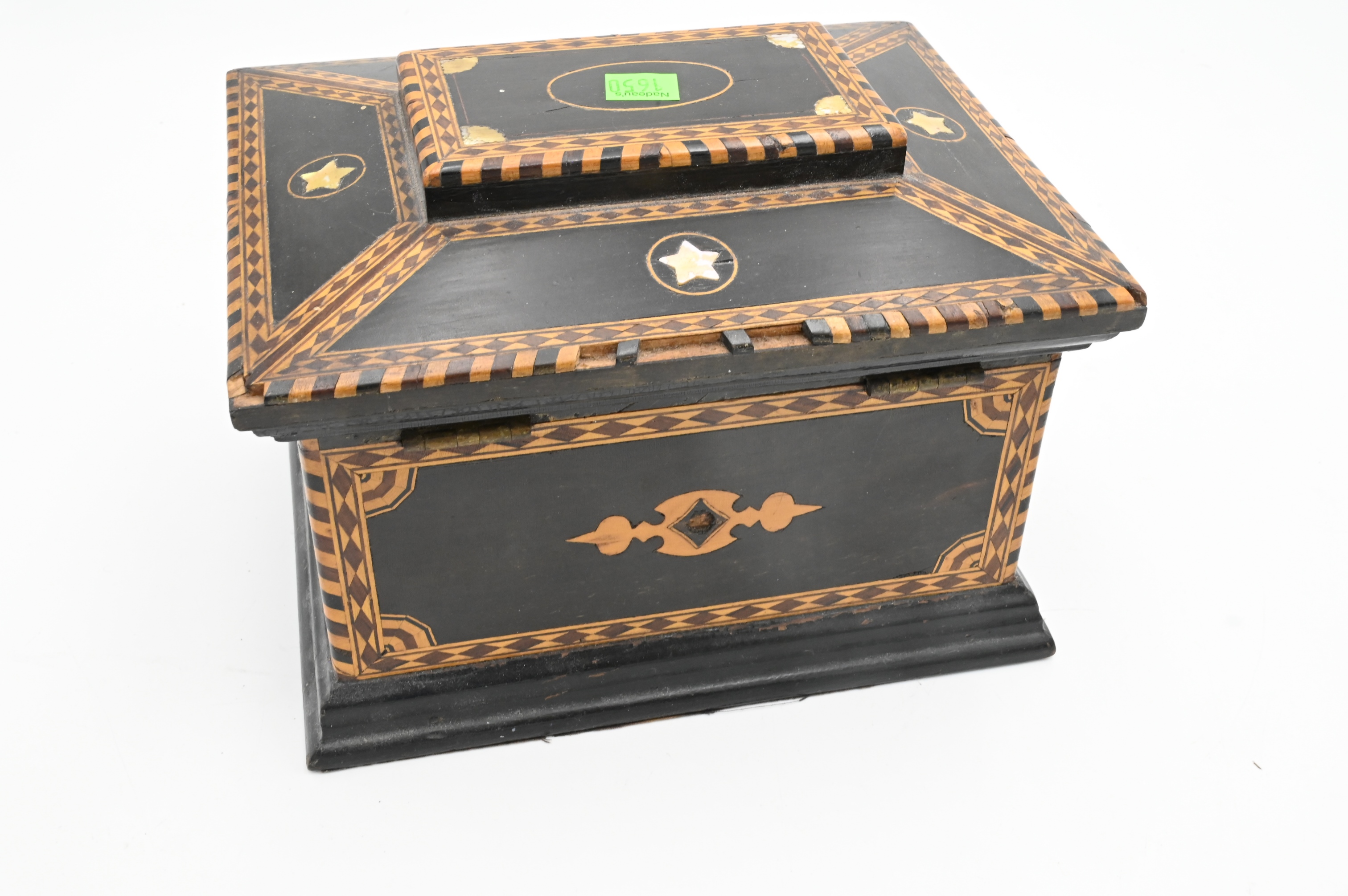 Inlaid Jewelry Box, having fitted custom interior, height 6 inches, top 7 1/4″ x 9 1/4″