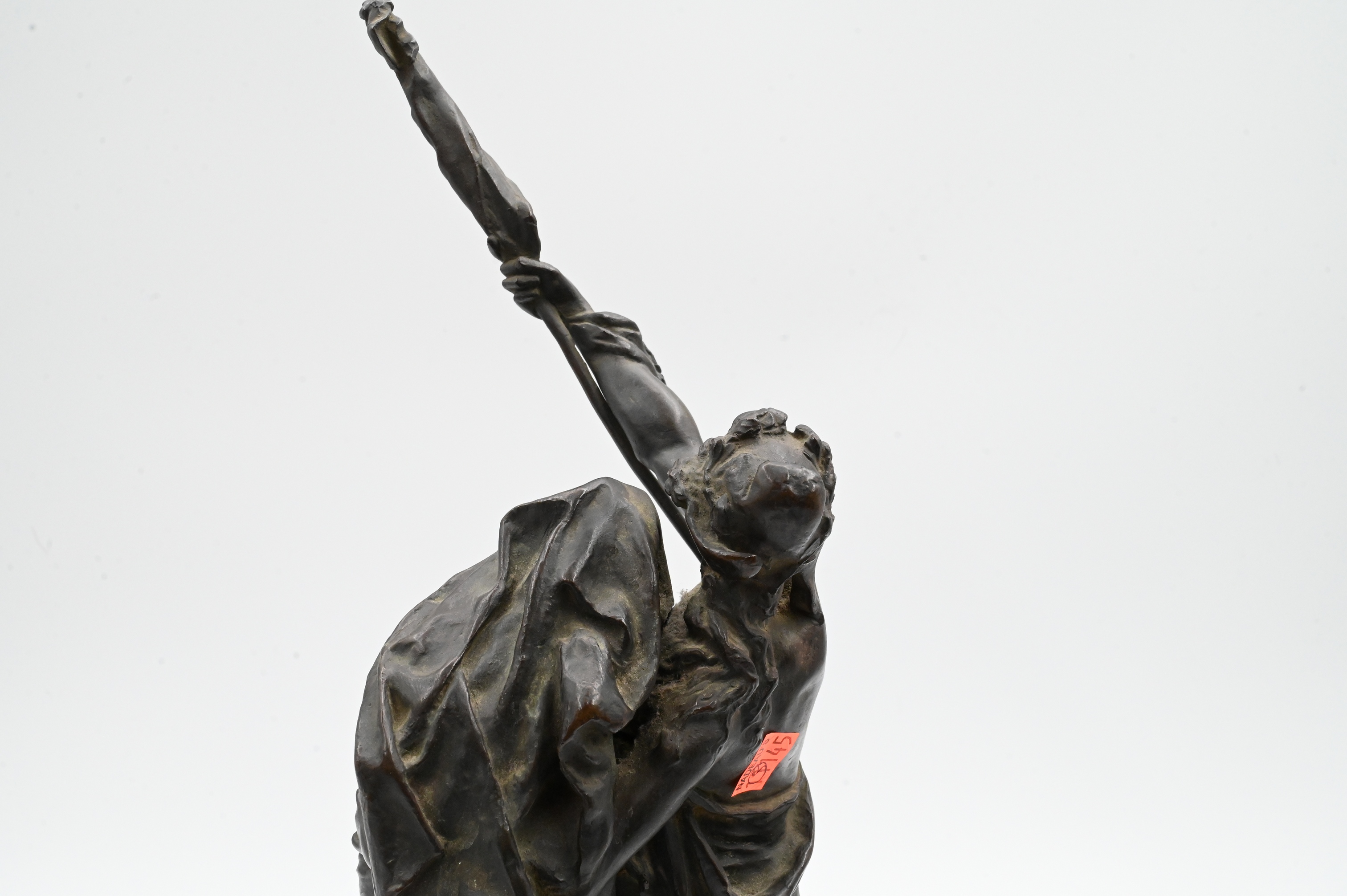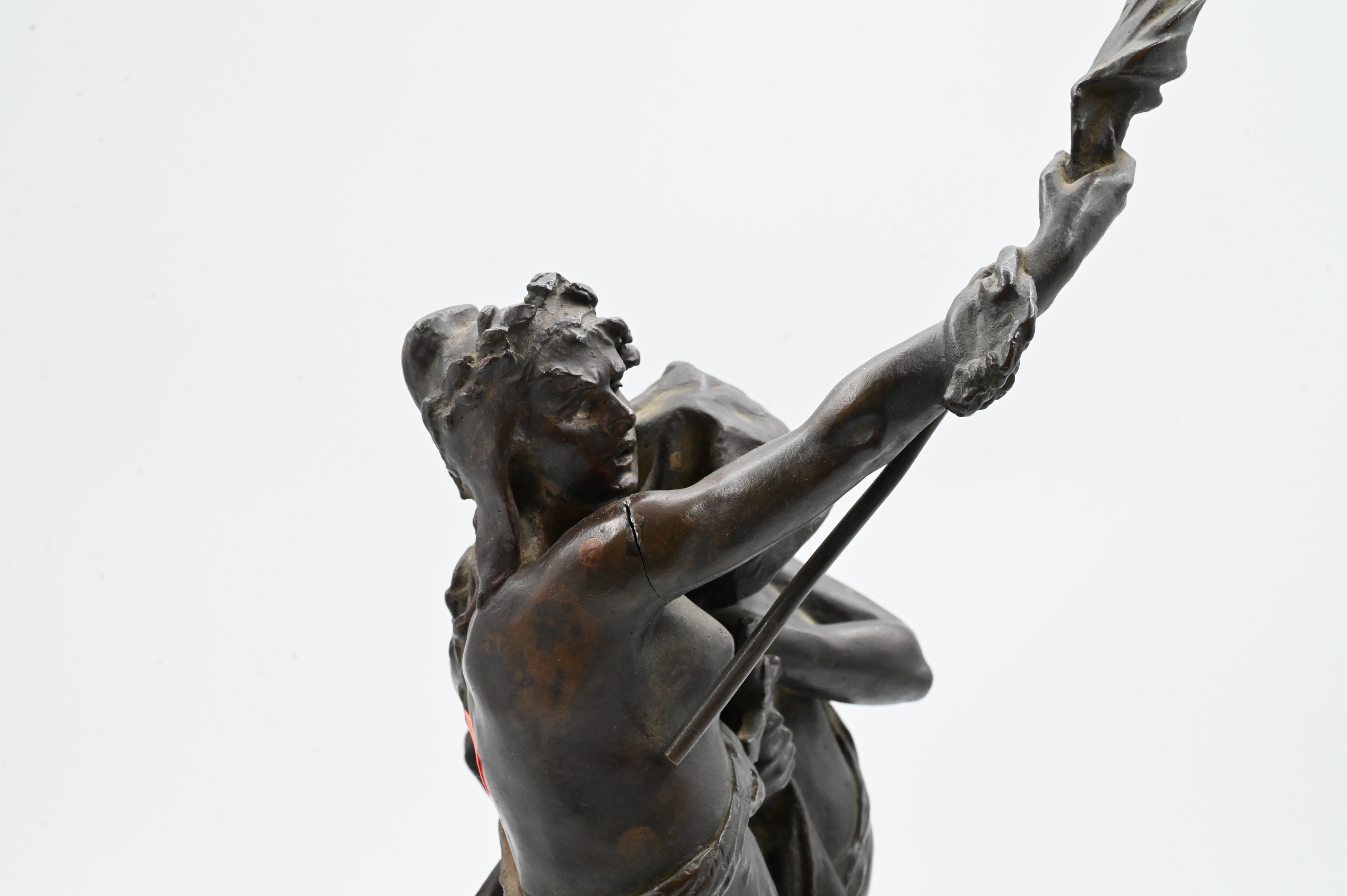 figural group depicting a heroic female standard-bearer striding forward with arm raised, sheltering beneath her sweeping cloak a second woman holding a broken sword. The dramatic composition symbolizes patriotic sacrifice, protection, and resilience, characteristic of late 19th-century French allegorical sculpture after the Franco Prussian War.